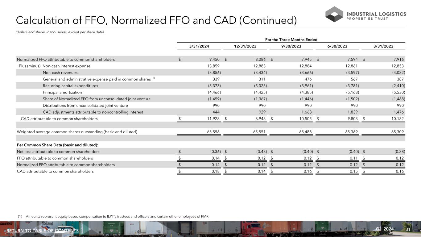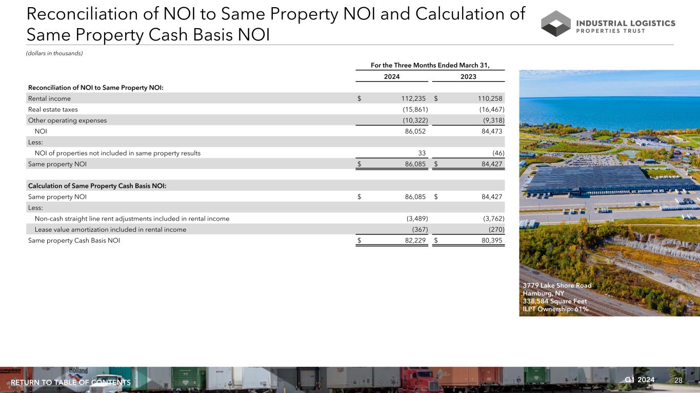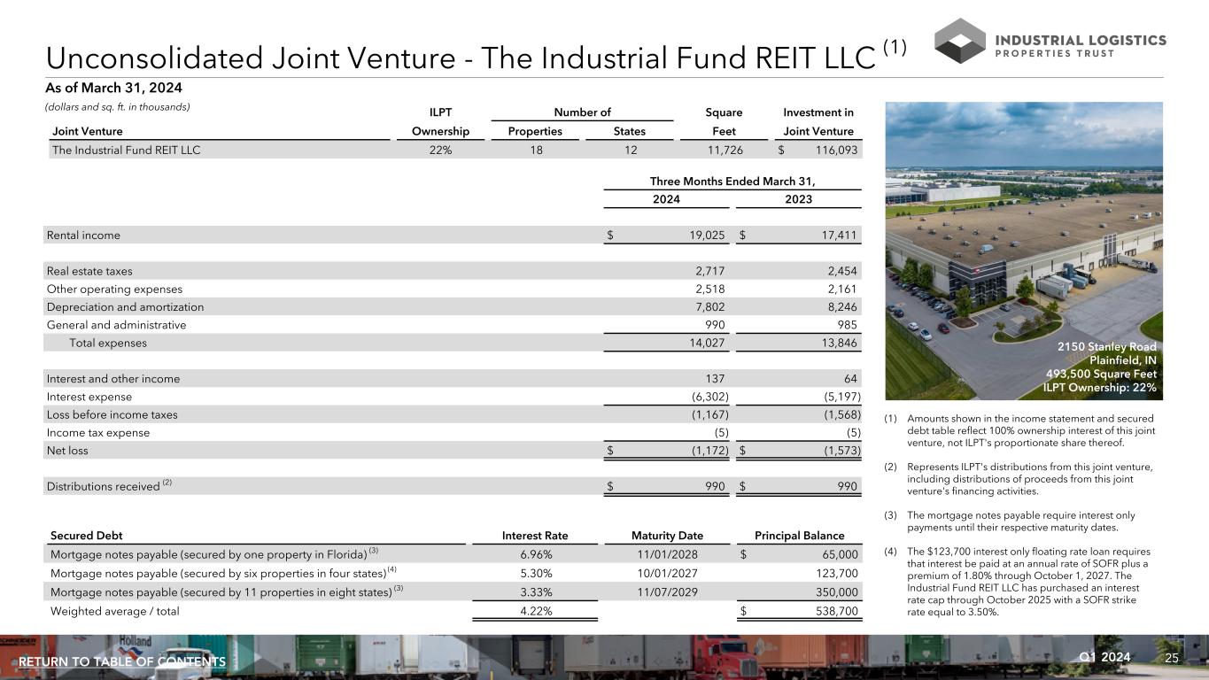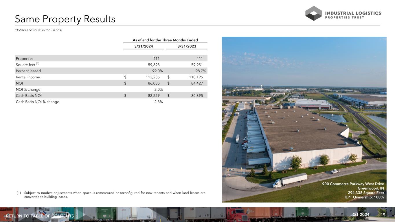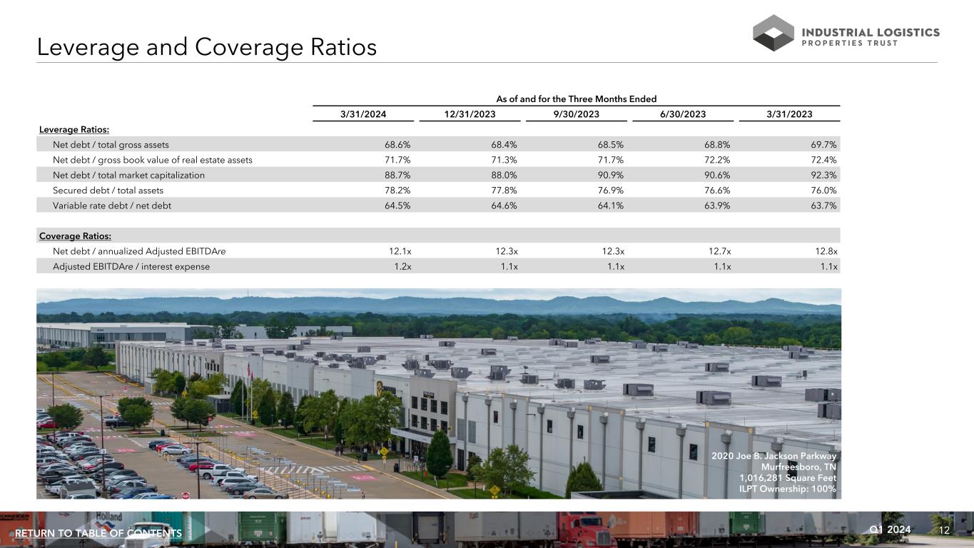 7Q1 2024RETURN TO TABLE OF CONTENTS As of and for the Three Months Ended As of 3/31/2024 12/31/2023 9/30/2023 6/30/2023 3/31/2023 3/31/2024 Selected Income Statement Data: Capitalization: Rental income $ 112,235 $ 108,895 $ 110,142 $ 108,043 $ 110,258 Total common shares 65,831,530 Net loss $ (33,902) $ (41,402) $ (36,191) $ (36,580) $ (35,546) Closing price $ 4.29 Net loss attributable to common shareholders $ (23,403) $ (31,240) $ (26,112) $ (25,828) $ (24,809) Equity market capitalization $ 282,417 NOI $ 86,052 $ 84,887 $ 85,309 $ 84,424 $ 84,473 Debt 4,321,478 Cash Basis NOI $ 82,196 $ 81,453 $ 81,643 $ 80,827 $ 80,441 Total market capitalization $ 4,603,895 Adjusted EBITDAre $ 84,400 $ 83,072 $ 83,194 $ 81,331 $ 80,712 FFO attributable to common shareholders $ 9,450 $ 7,799 $ 7,945 $ 7,375 $ 7,916 Liquidity: Normalized FFO attributable to common shareholders $ 9,450 $ 8,086 $ 7,945 $ 7,594 $ 7,916 Cash and cash equivalents 128,394 CAD attributable to common shareholders $ 11,928 $ 8,948 $ 10,505 $ 9,803 $ 10,182 Total liquidity $ 128,394 Rolling four quarter CAD attributable to common shareholders $ 41,184 $ 39,438 $ 35,238 $ 33,023 $ 42,701 Per Common Share Data (basic and diluted): Net loss attributable to common shareholders $ (0.36) $ (0.48) $ (0.40) $ (0.40) $ (0.38) FFO attributable to common shareholders $ 0.14 $ 0.12 $ 0.12 $ 0.11 $ 0.12 Normalized FFO attributable to common shareholders $ 0.14 $ 0.12 $ 0.12 $ 0.12 $ 0.12 CAD attributable to common shareholders $ 0.18 $ 0.14 $ 0.16 $ 0.15 $ 0.16 Rolling four quarter CAD attributable to common shareholders $ 0.63 $ 0.60 $ 0.54 $ 0.51 $ 0.65 Dividends: Annualized dividends paid per share $ 0.04 $ 0.04 $ 0.04 $ 0.04 $ 0.04 Annualized dividend yield (at end of period) 0.9% 0.9% 1.4% 1.2% 1.3% Annualized Normalized FFO attributable to common shareholders payout ratio 7.1% 8.3% 8.3% 8.3% 8.3% CAD attributable to common shareholders payout ratio 5.6% 7.1% 6.3% 6.7% 6.3% Rolling four quarter CAD attributable to common shareholders payout ratio 6.3% 6.7% 7.4% 7.8% 6.2% Selected Balance Sheet Data: Total gross assets $ 5,956,536 $ 5,961,129 $6,000,494 $5,997,715 $5,939,557 Total assets $ 5,527,569 $ 5,563,675 $5,634,315 $5,662,080 $5,634,976 Total liabilities $ 4,405,069 $ 4,401,896 $4,416,177 $4,400,791 $4,348,801 Total equity $ 1,122,500 $ 1,161,779 $1,218,138 $1,261,289 $1,286,175 (dollars in thousands, except per share data) Key Financial Data 650 Braselton Parkway Braselton, GA 373,750 Square Feet ILPT Ownership: 61%