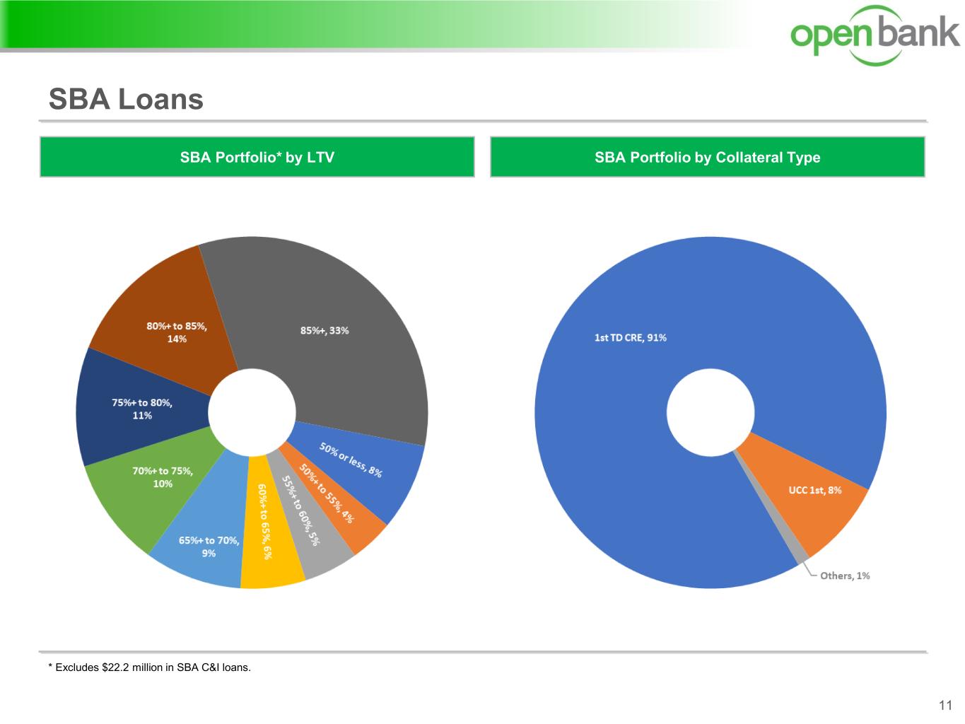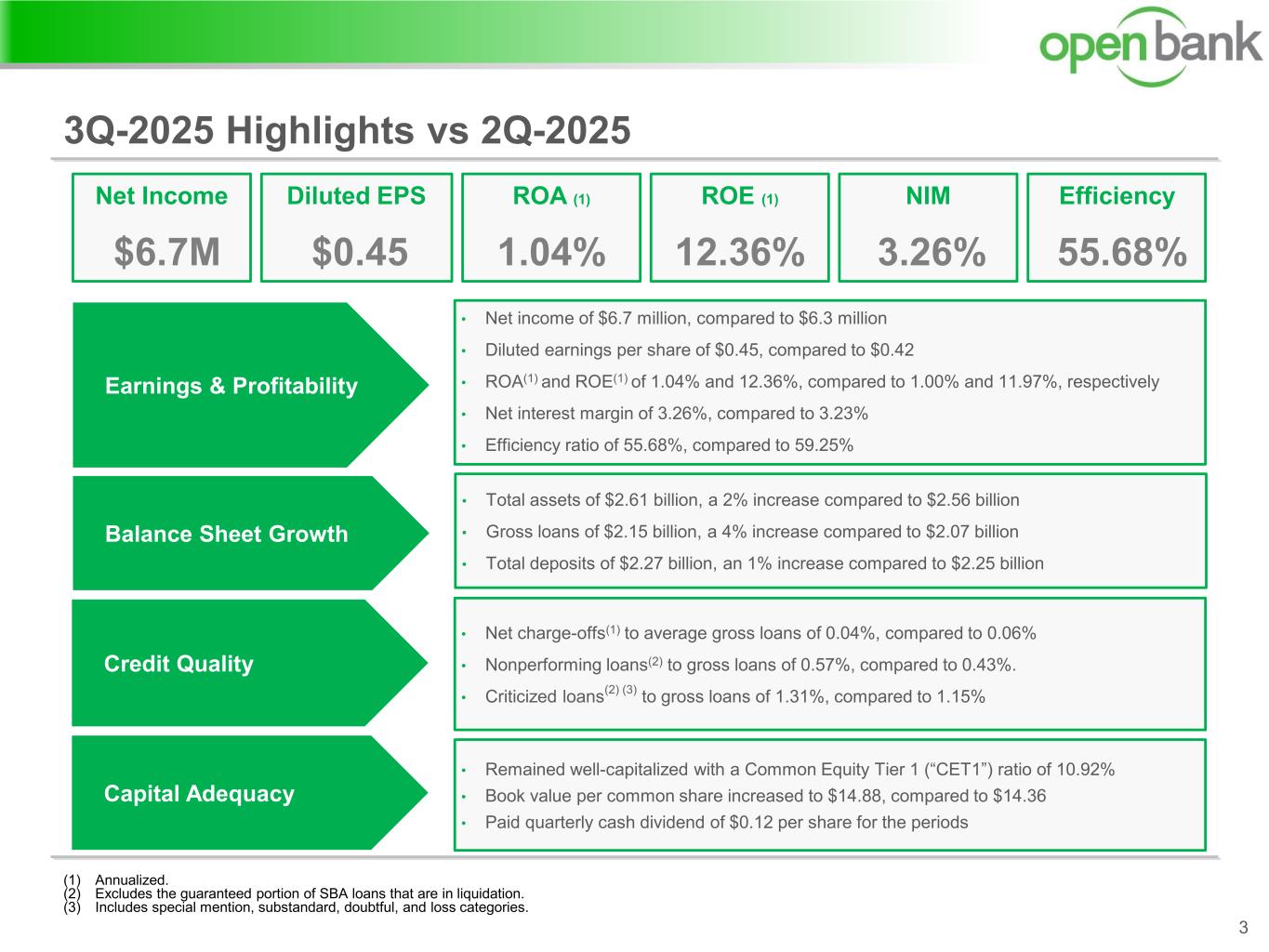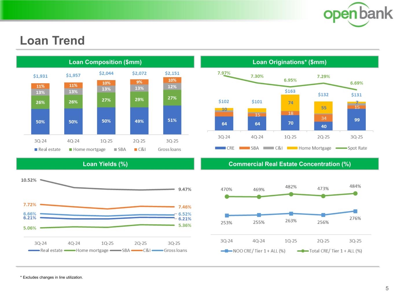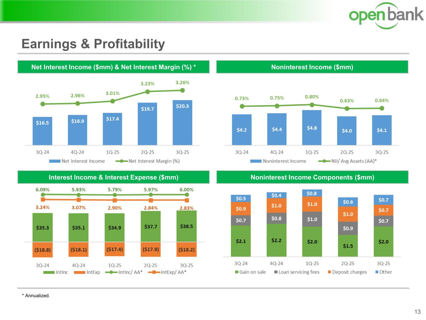 (3)2025年9月30日に終了した3ヵ月間、2025年6月30日および2024年9月30日に終了した3ヵ月間における、商業用不動産(「CRE」)およびSBAローンからの期限前償還ペナルティ収入127千ドル、166千ドルおよび114千ドルをそれぞれ含む。
