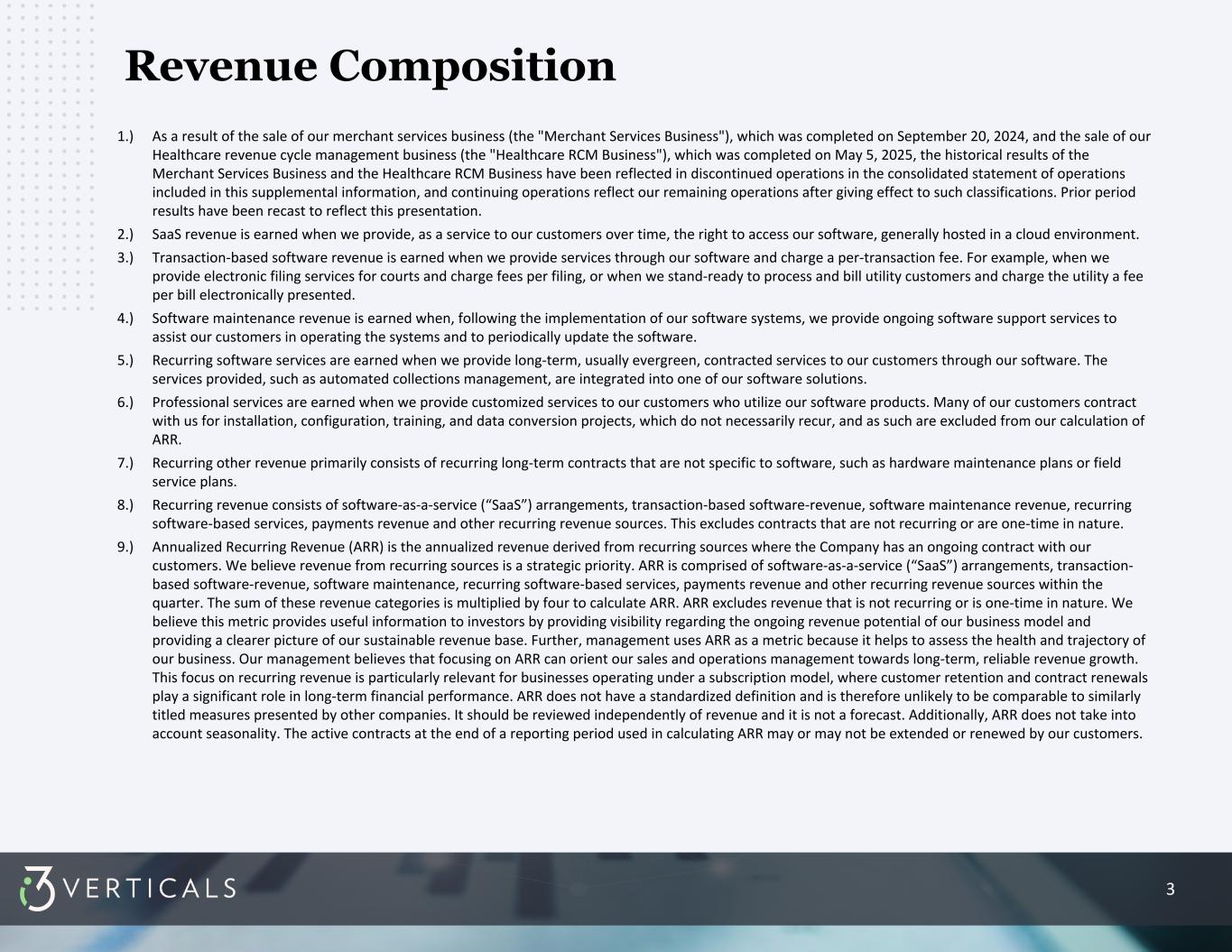 1.2024年9月20日に完了した当社のマーチャント・サービス事業(以下「マーチャント・サービス事業」)の売却、および2025年5月5日に完了した当社のヘルスケアRCM事業(以下「ヘルスケアRCM事業」)の売却の結果、マーチャント・サービス事業およびヘルスケアRCM事業の過去の業績は、本決算短信に含まれる連結損益計算書の非継続事業に反映され、継続事業は当該分類を反映した後の当社の残存事業を反映しています。この表示を反映させるため、過年度の業績は再表示されています。