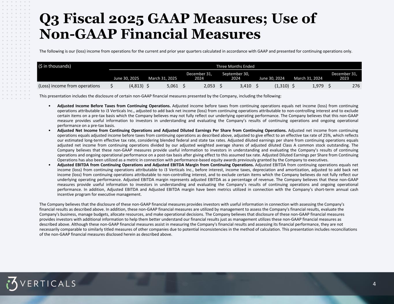 テネシー州ナッシュビル(2025年8月7日)-i3 Verticals, Inc. (Nasdaq: IIIV)(以下「i3 Verticals」または「当社」)は本日、2025年6月30日に終了した会計年度第3四半期の決算を発表した。