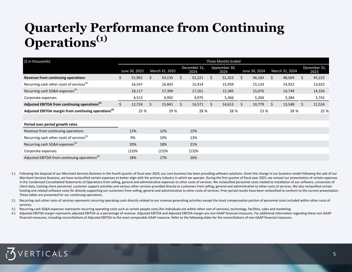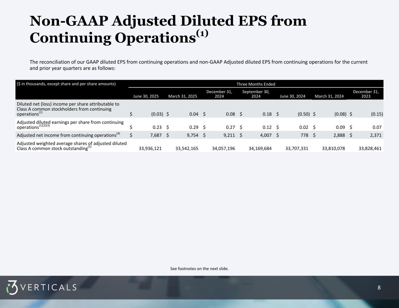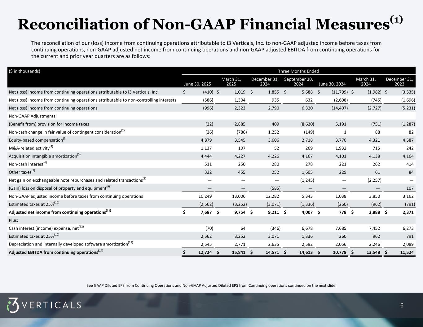 -i3 Verticals, Inc.1に帰属する継続事業の第3四半期の純損失は0.4百万ドル(前年同期は11.8百万ドル)。2025年6月30日に終了した9ヶ月間のi3 Verticals, Inc.1に帰属する継続事業からの純利益は250万ドルで、前年同期9ヶ月間のi3 Verticals, Inc.1に帰属する継続事業からの純損失は1,770万ドルであった。