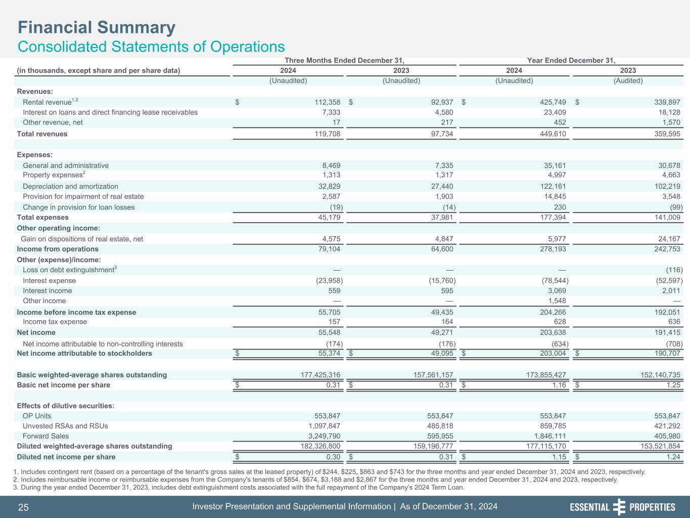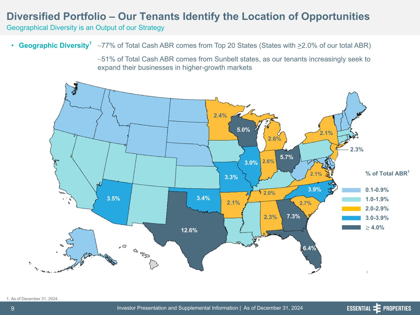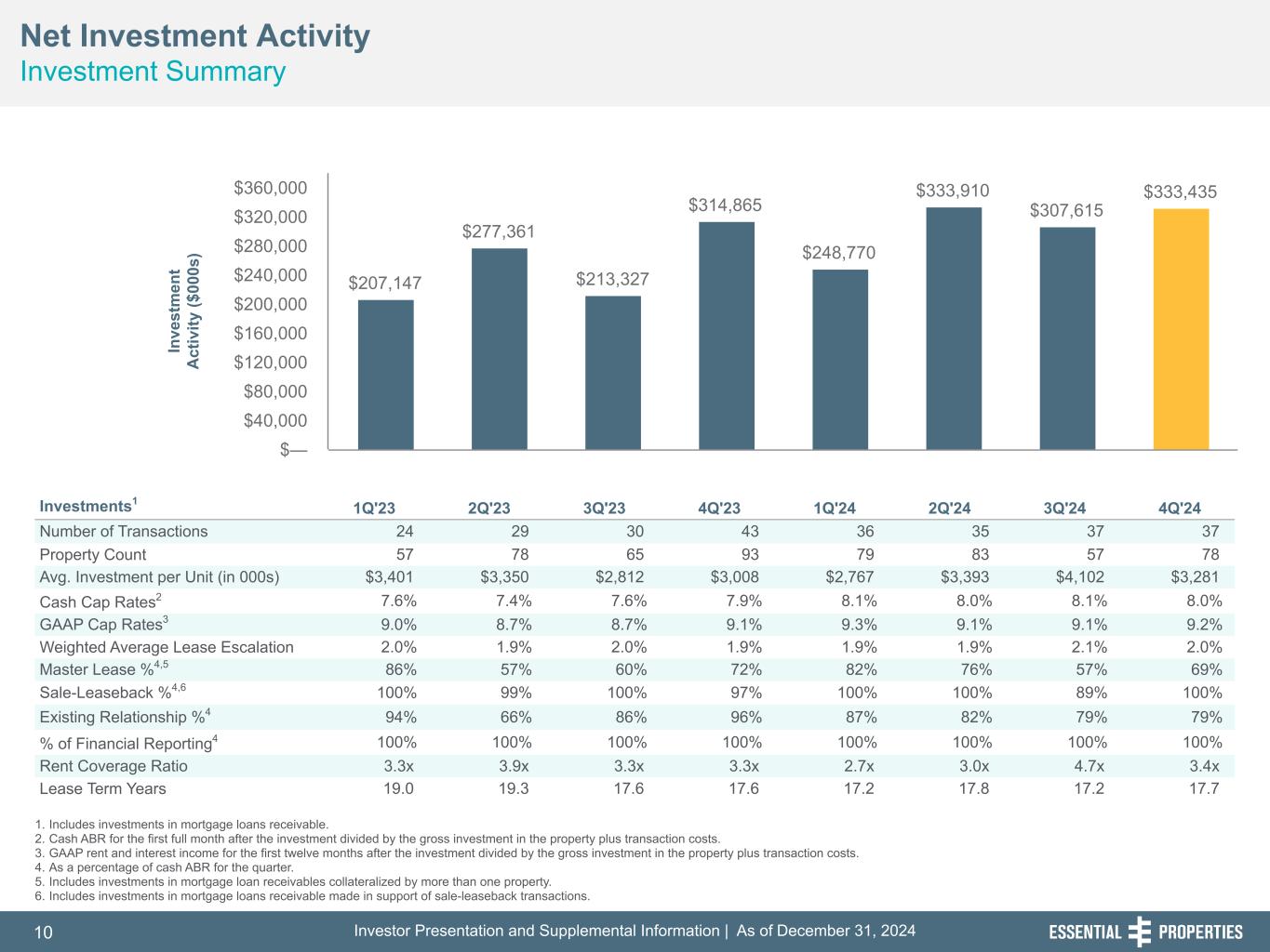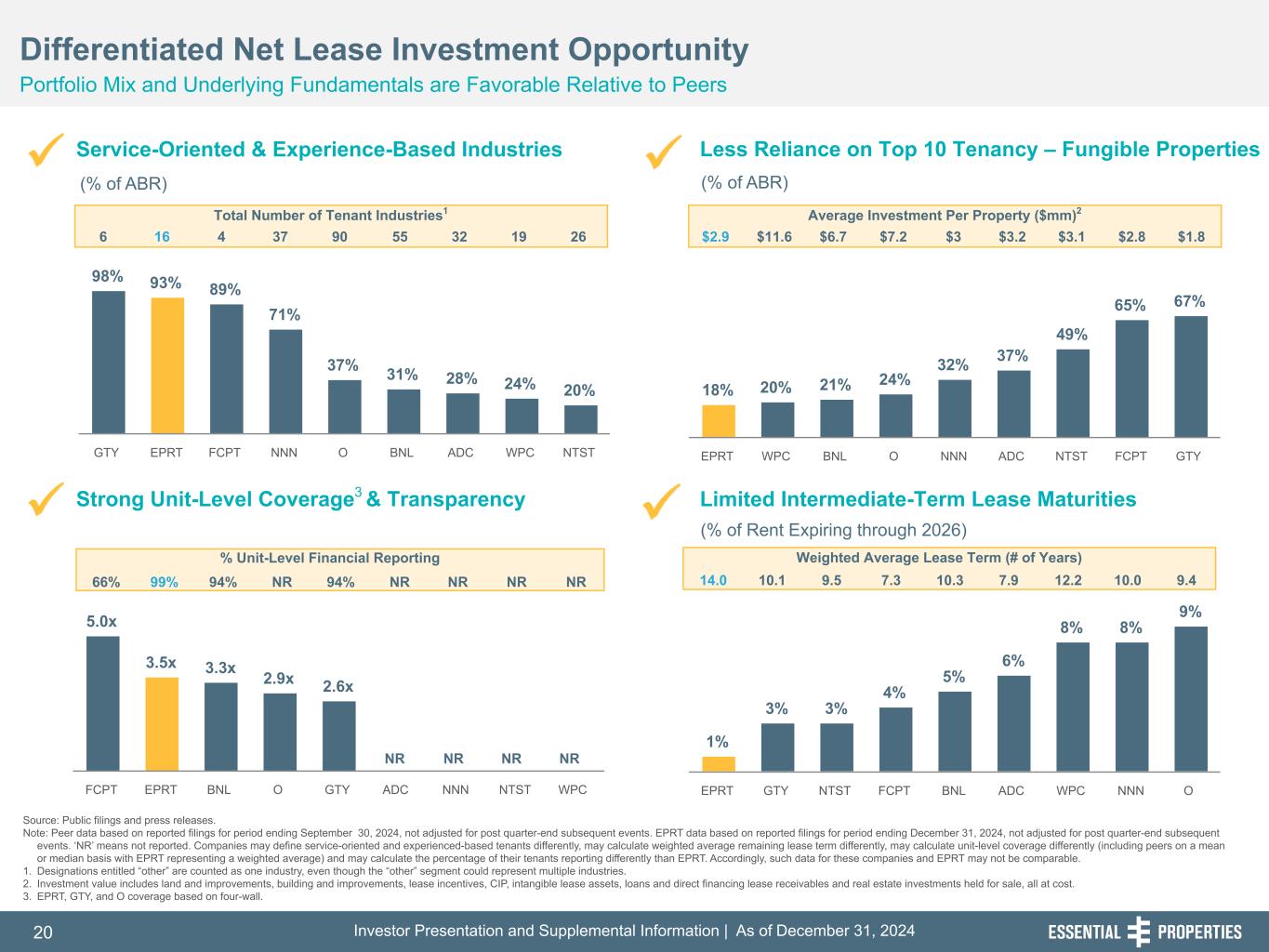 ニュージャージー州プリンストン--(BUSINESS WIRE)--(ビジネスワイヤ) -- エッセンシャル・プロパティーズ・リアルティ・トラスト(NYSE: EPRT、以下「エッセンシャル・プロパティーズ」または「当社」)は本日、2024年12月31日に終了した3カ月間および1年間の営業成績を発表しました。