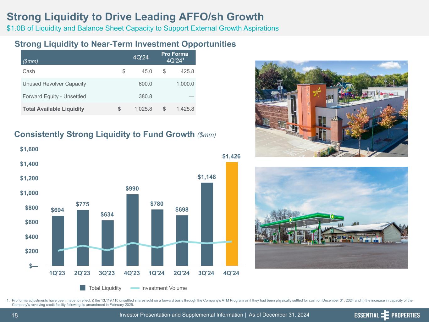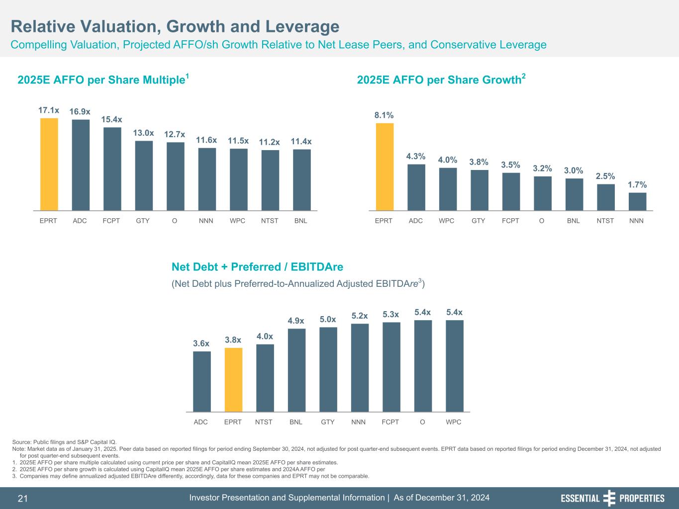 当社のピート・マヴォイデス社長兼最高経営責任者(CEO)は、第4四半期および2024年通年の業績について、次のように述べた。「当社の差別化された投資戦略は、第4四半期も引き続き素晴らしい結果をもたらし、ポートフォリオの健全な信用動向と歴史的に魅力的なキャップレートでの力強い投資水準が際立った。資本市場が正常化するにつれて競争は激化していますが、当社の保守的なバランスシートと充実した流動性は、このダイナミックな市場で業務を遂行する上で有利な立場にあります。2024年までの好調な仕上がりと、健全で成長している投資パイプラインを反映し、2025年の1株当たりAFFOガイダンスの下限を0.01ドル引き上げ、1.85ドルから1.89ドルの範囲に更新しました。"