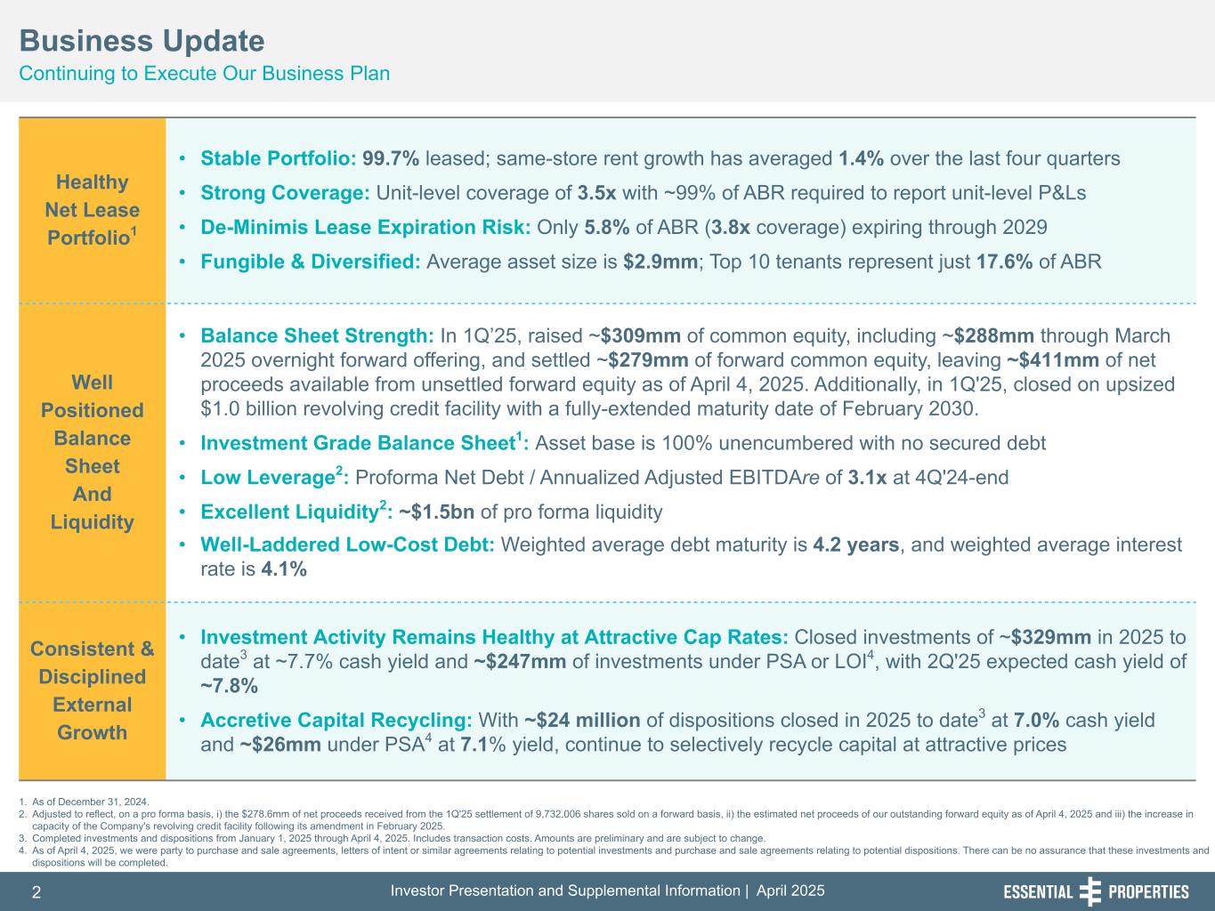 Investor Presentation and Supplemental Information | April 20252 254, 192, 59 75, 108, 127 146, 204, 238 0, 0, 0 38, 169, 224 153, 223, 227 1. As of December 31, 2024. 2. Adjusted to reflect, on a pro forma basis, i) the $278.6mm of net proceeds received from the 1Q'25 settlement of 9,732,006 shares sold on a forward basis, ii) the estimated net proceeds of our outstanding forward equity as of April 4, 2025 and iii) the increase in capacity of the Company's revolving credit facility following its amendment in February 2025. 3. Completed investments and dispositions from January 1, 2025 through April 4, 2025. Includes transaction costs. Amounts are preliminary and are subject to change. 4. As of April 4, 2025, we were party to purchase and sale agreements, letters of intent or similar agreements relating to potential investments and purchase and sale agreements relating to potential dispositions. There can be no assurance that these investments and dispositions will be completed. Healthy Net Lease Portfolio1 • Stable Portfolio: 99.7% leased; same-store rent growth has averaged 1.4% over the last four quarters • Strong Coverage: Unit-level coverage of 3.5x with ~99% of ABR required to report unit-level P&Ls • De-Minimis Lease Expiration Risk: Only 5.8% of ABR (3.8x coverage) expiring through 2029 • Fungible & Diversified: Average asset size is $2.9mm; Top 10 tenants represent just 17.6% of ABR Well Positioned Balance Sheet And Liquidity • Balance Sheet Strength: In 1Q’25, raised ~$309mm of common equity, including ~$288mm through March 2025 overnight forward offering, and settled ~$279mm of forward common equity, leaving ~$411mm of net proceeds available from unsettled forward equity as of April 4, 2025. Additionally, in 1Q'25, closed on upsized $1.0 billion revolving credit facility with a fully-extended maturity date of February 2030. • Investment Grade Balance Sheet1: Asset base is 100% unencumbered with no secured debt • Low Leverage2: Proforma Net Debt / Annualized Adjusted EBITDAre of 3.1x at 4Q'24-end • Excellent Liquidity2: ~$1.5bn of pro forma liquidity • Well-Laddered Low-Cost Debt: Weighted average debt maturity is 4.2 years, and weighted average interest rate is 4.1% Consistent & Disciplined External Growth • Investment Activity Remains Healthy at Attractive Cap Rates: Closed investments of ~$329mm in 2025 to date3 at ~7.7% cash yield and ~$247mm of investments under PSA or LOI4, with 2Q'25 expected cash yield of ~7.8% • Accretive Capital Recycling: With ~$24 million of dispositions closed in 2025 to date3 at 7.0% cash yield and ~$26mm under PSA4 at 7.1% yield, continue to selectively recycle capital at attractive prices Business Update Continuing to Execute Our Business Plan