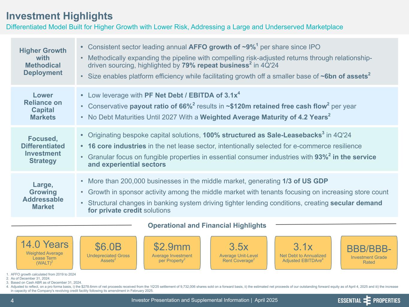 Investor Presentation and Supplemental Information | April 20254 254, 192, 59 75, 108, 127 146, 204, 238 0, 0, 0 38, 169, 224 153, 223, 227 1. AFFO growth calculated from 2019 to 2024 2. As of December 31, 2024. 3. Based on Cash ABR as of December 31, 2024. 4. Adjusted to reflect, on a pro forma basis, i) the $278.6mm of net proceeds received from the 1Q'25 settlement of 9,732,006 shares sold on a forward basis, ii) the estimated net proceeds of our outstanding forward equity as of April 4, 2025 and iii) the increase in capacity of the Company's revolving credit facility following its amendment in February 2025. BBB/BBB- Investment Grade Rated • Originating bespoke capital solutions, 100% structured as Sale-Leasebacks3 in 4Q'24 • 16 core industries in the net lease sector, intentionally selected for e-commerce resilience • Granular focus on fungible properties in essential consumer industries with 93%2 in the service and experiential sectors Investment Highlights Differentiated Model Built for Higher Growth with Lower Risk, Addressing a Large and Underserved Marketplace 242, 242, 242 14.0 Years Weighted Average Lease Term (WALT)2 3.5x Average Unit-Level Rent Coverage2 $2.9mm Average Investment per Property2 3.1x Net Debt to Annualized Adjusted EBITDAre4 $6.0B Undepreciated Gross Assets2 Higher Growth with Methodical Deployment • Consistent sector leading annual AFFO growth of ~9%1 per share since IPO • Methodically expanding the pipeline with compelling risk-adjusted returns through relationship- driven sourcing, highlighted by 79% repeat business2 in 4Q'24 • Size enables platform efficiency while facilitating growth off a smaller base of ~6bn of assets2 Lower Reliance on Capital Markets • Low leverage with PF Net Debt / EBITDA of 3.1x4 • Conservative payout ratio of 66%2 results in ~$120m retained free cash flow2 per year • No Debt Maturities Until 2027 With a Weighted Average Maturity of 4.2 Years2 Focused, Differentiated Investment Strategy Large, Growing Addressable Market • More than 200,000 businesses in the middle market, generating 1/3 of US GDP • Growth in sponsor activity among the middle market with tenants focusing on increasing store count • Structural changes in banking system driving tighter lending conditions, creating secular demand for private credit solutions Operational and Financial Highlights