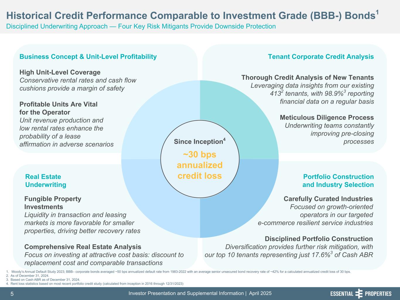 Investor Presentation and Supplemental Information | April 20255 254, 192, 59 75, 108, 127 146, 204, 238 0, 0, 0 38, 169, 224 153, 223, 227 Historical Credit Performance Comparable to Investment Grade (BBB-) Bonds1 Disciplined Underwriting Approach — Four Key Risk Mitigants Provide Downside Protection Business Concept & Unit-Level Profitability Real Estate Underwriting Portfolio Construction and Industry Selection Tenant Corporate Credit Analysis High Unit-Level Coverage Conservative rental rates and cash flow cushions provide a margin of safety Profitable Units Are Vital for the Operator Unit revenue production and low rental rates enhance the probability of a lease affirmation in adverse scenarios Fungible Property Investments Liquidity in transaction and leasing markets is more favorable for smaller properties, driving better recovery rates Comprehensive Real Estate Analysis Focus on investing at attractive cost basis: discount to replacement cost and comparable transactions Thorough Credit Analysis of New Tenants Leveraging data insights from our existing 4132 tenants, with 98.9%3 reporting financial data on a regular basis Meticulous Diligence Process Underwriting teams constantly improving pre-closing processes Carefully Curated Industries Focused on growth-oriented operators in our targeted e-commerce resilient service industries Disciplined Portfolio Construction Diversification provides further risk mitigation, with our top 10 tenants representing just 17.6%3 of Cash ABR Since Inception4 ~30 bps annualized credit loss 1. Moody’s Annual Default Study 2023; BBB– corporate bonds averaged ~50 bps annualized default rate from 1983-2022 with an average senior unsecured bond recovery rate of ~42% for a calculated annualized credit loss of 30 bps. 2. As of December 31, 2024. 3. Based on Cash ABR as of December 31, 2024. 4. Rent loss statistics based on most recent portfolio credit study (calculated from inception in 2016 through 12/31/2023)