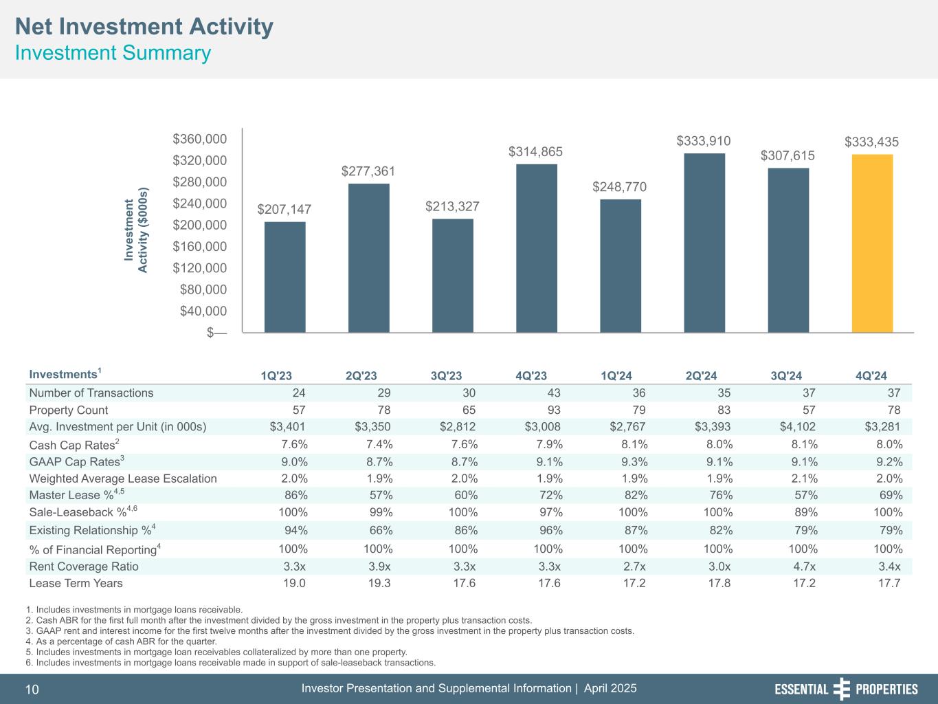 Investor Presentation and Supplemental Information | April 202525 254, 192, 59 75, 108, 127 146, 204, 238 0, 0, 0 38, 169, 224 153, 223, 227 1. Includes contingent rent (based on a percentage of the tenant's gross sales at the leased property) of $244, $225, $863 and $743 for the three months and year ended December 31, 2024 and 2023, respectively. 2. Includes reimbursable income or reimbursable expenses from the Company's tenants of $854, $674, $3,188 and $2,867 for the three months and year ended December 31, 2024 and 2023, respectively. 3. During the year ended December 31, 2023, includes debt extinguishment costs associated with the full repayment of the Company’s 2024 Term Loan. Three Months Ended December 31, Year Ended December 31, (in thousands, except share and per share data) 2024 2023 2024 2023 (Unaudited) (Unaudited) (Unaudited) (Audited) Revenues: Rental revenue1,2 $ 112,358 $ 92,937 $ 425,749 $ 339,897 Interest on loans and direct financing lease receivables 7,333 4,580 23,409 18,128 Other revenue, net 17 217 452 1,570 Total revenues 119,708 97,734 449,610 359,595 Expenses: General and administrative 8,469 7,335 35,161 30,678 Property expenses2 1,313 1,317 4,997 4,663 Depreciation and amortization 32,829 27,440 122,161 102,219 Provision for impairment of real estate 2,587 1,903 14,845 3,548 Change in provision for loan losses (19) (14) 230 (99) Total expenses 45,179 37,981 177,394 141,009 Other operating income: Gain on dispositions of real estate, net 4,575 4,847 5,977 24,167 Income from operations 79,104 64,600 278,193 242,753 Other (expense)/income: Loss on debt extinguishment3 — — — (116) Interest expense (23,958) (15,760) (78,544) (52,597) Interest income 559 595 3,069 2,011 Other income — — 1,548 — Income before income tax expense 55,705 49,435 204,266 192,051 Income tax expense 157 164 628 636 Net income 55,548 49,271 203,638 191,415 Net income attributable to non-controlling interests (174) (176) (634) (708) Net income attributable to stockholders $ 55,374 $ 49,095 $ 203,004 $ 190,707 Basic weighted-average shares outstanding 177,425,316 157,561,157 173,855,427 152,140,735 Basic net income per share $ 0.31 $ 0.31 $ 1.16 $ 1.25 Effects of dilutive securities: OP Units 553,847 553,847 553,847 553,847 Unvested RSAs and RSUs 1,097,847 485,818 859,785 421,292 Forward Sales 3,249,790 595,955 1,846,111 405,980 Diluted weighted-average shares outstanding 182,326,800 159,196,777 177,115,170 153,521,854 Diluted net income per share $ 0.30 $ 0.31 $ 1.15 $ 1.24 Financial Summary Consolidated Statements of Operations 242, 242, 242
