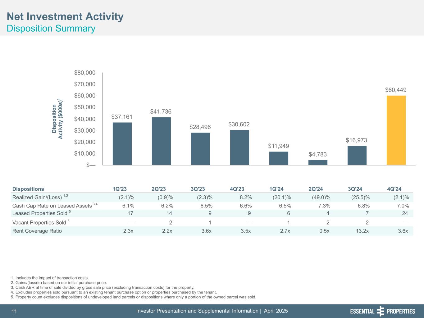 Investor Presentation and Supplemental Information | April 202510 254, 192, 59 75, 108, 127 146, 204, 238 0, 0, 0 38, 169, 224 153, 223, 227 Net Investment Activity Investment Summary 242, 242, 242 1. Includes investments in mortgage loans receivable. 2. Cash ABR for the first full month after the investment divided by the gross investment in the property plus transaction costs. 3. GAAP rent and interest income for the first twelve months after the investment divided by the gross investment in the property plus transaction costs. 4. As a percentage of cash ABR for the quarter. 5. Includes investments in mortgage loan receivables collateralized by more than one property. 6. Includes investments in mortgage loans receivable made in support of sale-leaseback transactions. Investments1 1Q'23 2Q'23 3Q'23 4Q'23 1Q'24 2Q'24 3Q'24 4Q'24 Number of Transactions 24 29 30 43 36 35 37 37 Property Count 57 78 65 93 79 83 57 78 Avg. Investment per Unit (in 000s) $3,401 $3,350 $2,812 $3,008 $2,767 $3,393 $4,102 $3,281 Cash Cap Rates2 7.6 % 7.4 % 7.6 % 7.9 % 8.1 % 8.0 % 8.1 % 8.0 % GAAP Cap Rates3 9.0 % 8.7 % 8.7 % 9.1 % 9.3 % 9.1 % 9.1 % 9.2 % Weighted Average Lease Escalation 2.0 % 1.8 % 1.9 % 1.8 % 2.0 % 1.8 % 1.9 % 1.9 % 1.9 % 2.1 % 2.0 % Master Lease %4,5 86 % 57 % 60 % 72 % 82 % 76 % 57 % 69 % Sale-Leaseback %4,6 100 % 99 % 100 % 97 % 100 % 100 % 89 % 100 % Existing Relationship %4 94 % 66 % 86 % 96 % 87 % 82 % 79 % 79 % % of Financial Reporting4 100 % 100 % 100 % 100 % 100 % 100 % 100 % 100 % Rent Coverage Ratio 3.3x 3.9x 3.3x 3.3x 2.7x 3.0x 4.7x 3.4x Lease Term Years 19.0 19.3 17.6 17.6 17.2 17.8 17.2 17.7 $207,147 $277,361 $213,327 $314,865 $248,770 $333,910 $307,615 $333,435 $— $40,000 $80,000 $120,000 $160,000 $200,000 $240,000 $280,000 $320,000 $360,000 In ve st m en t A ct iv ity ($ 00 0s )