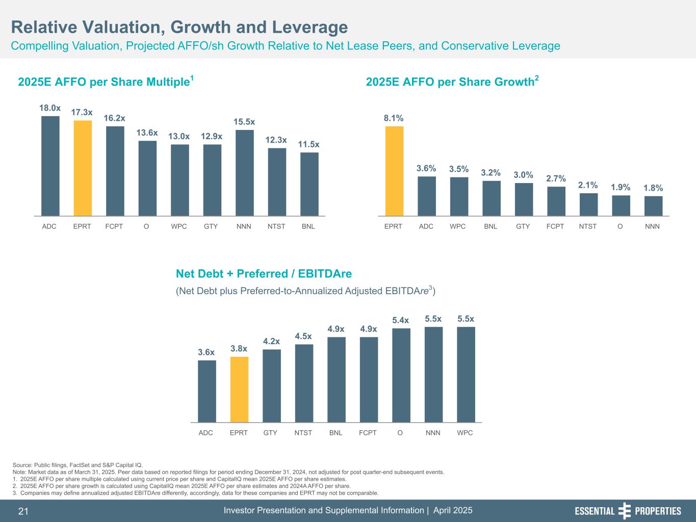 Investor Presentation and Supplemental Information | April 202520 254, 192, 59 75, 108, 127 146, 204, 238 0, 0, 0 38, 169, 224 153, 223, 227 Source: Public filings and press releases. Note: Data based on reported filings for period ending December 31, 2024, not adjusted for post quarter-end subsequent events. ‘NR’ means not reported. Companies may define service-oriented and experienced-based tenants differently, may calculate weighted average remaining lease term differently, may calculate unit-level coverage differently (including peers on a mean or median basis with EPRT representing a weighted average) and may calculate the percentage of their tenants reporting differently than EPRT. Accordingly, such data for these companies and EPRT may not be comparable. 1. Designations entitled “other” are counted as one industry, even though the “other” segment could represent multiple industries. 2. Investment value includes land and improvements, building and improvements, lease incentives, CIP, intangible lease assets, loans and direct financing lease receivables and real estate investments held for sale, all at cost. 3. EPRT, GTY, and O coverage based on four-wall. Differentiated Net Lease Investment Opportunity Portfolio Mix and Underlying Fundamentals are Favorable Relative to Peers Strong Unit-Level Coverage3 & Transparency Service-Oriented & Experience-Based Industries Limited Intermediate-Term Lease Maturities 242, 242, 242 (% of ABR) (% of Rent Expiring through 2027) Less Reliance on Top 10 Tenancy – Fungible Properties (% of ABR) 18% 19% 22% 24% 31% 37% 45% 64% 65% EPRT WPC BNL O NNN ADC NTST FCPT GTY 99% 93% 87% 71% 37% 29% 27% 23% 23% GTY EPRT FCPT NNN O BNL ADC NTST WPC 4.9x 3.5x 3.3x 2.9x 2.6x FCPT EPRT BNL O GTY ADC NNN NTST WPC Total Number of Tenant Industries1 % Unit-Level Financial Reporting Average Investment Per Property ($mm)2 Weighted Average Lease Term (# of Years) NR NR NR NR 3% 5% 8% 11% 11% 12% 15% 15% 15% EPRT NTST GTY WPC BNL ADC O NNN FCPT 6 16 4 37 89 55 32 26 19 $2.9 $11.4 $7.1 $4.3 $3.1 $3.8 $3.3 $2.7 $2.0 66% 99% 14% NR 94% NR NR NR NR 14.0 9.8 10.2 12.3 10.2 7.9 9.3 9.9 7.3