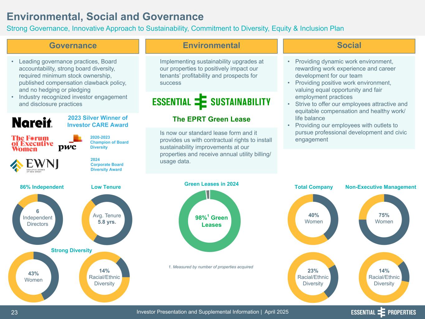 Investor Presentation and Supplemental Information | April 202523 254, 192, 59 75, 108, 127 146, 204, 238 0, 0, 0 38, 169, 224 153, 223, 227 Governance • Leading governance practices, Board accountability, strong board diversity, required minimum stock ownership, published compensation clawback policy, and no hedging or pledging • Industry recognized investor engagement and disclosure practices Environmental, Social and Governance Strong Governance, Innovative Approach to Sustainability, Commitment to Diversity, Equity & Inclusion Plan Environmental Social Implementing sustainability upgrades at our properties to positively impact our tenants’ profitability and prospects for success • Providing dynamic work environment, rewarding work experience and career development for our team • Providing positive work environment, valuing equal opportunity and fair employment practices • Strive to offer our employees attractive and equitable compensation and healthy work/ life balance • Providing our employees with outlets to pursue professional development and civic engagement 23% Racial/Ethnic Diversity 40% Women 14% Racial/Ethnic Diversity 75% Women Total Company Non-Executive Management 98%1 Green Leases 1. Measured by number of properties acquired 2020-2023 Champion of Board Diversity Avg. Tenure 5.8 yrs. 6 Independent Directors 43% Women 14% Racial/Ethnic Diversity Green Leases in 202486% Independent Low Tenure Strong Diversity 2023 Silver Winner of Investor CARE Award Is now our standard lease form and it provides us with contractual rights to install sustainability improvements at our properties and receive annual utility billing/ usage data. The EPRT Green Lease 2024 Corporate Board Diversity Award