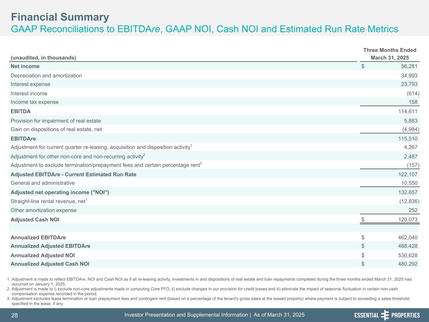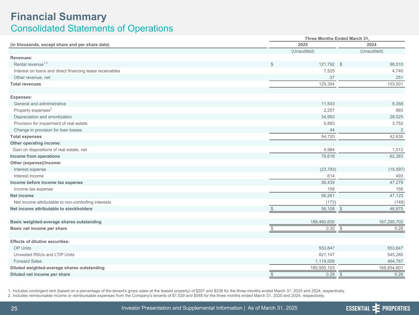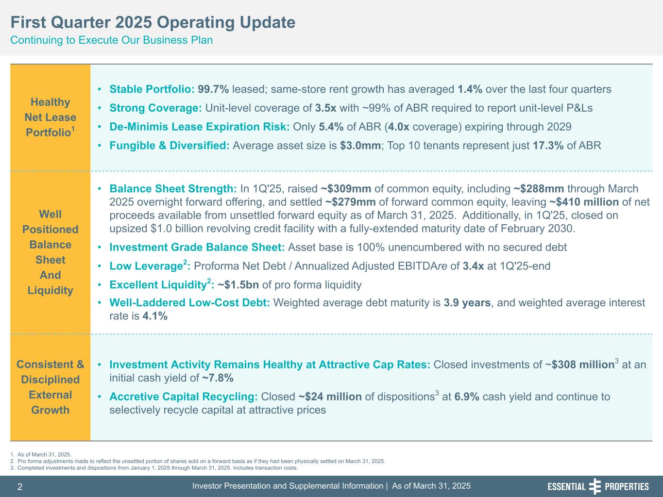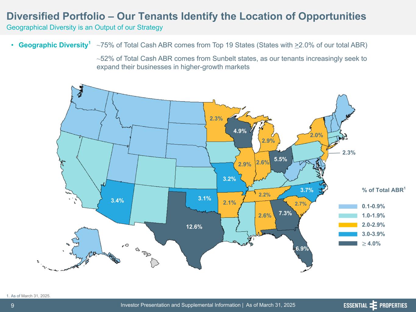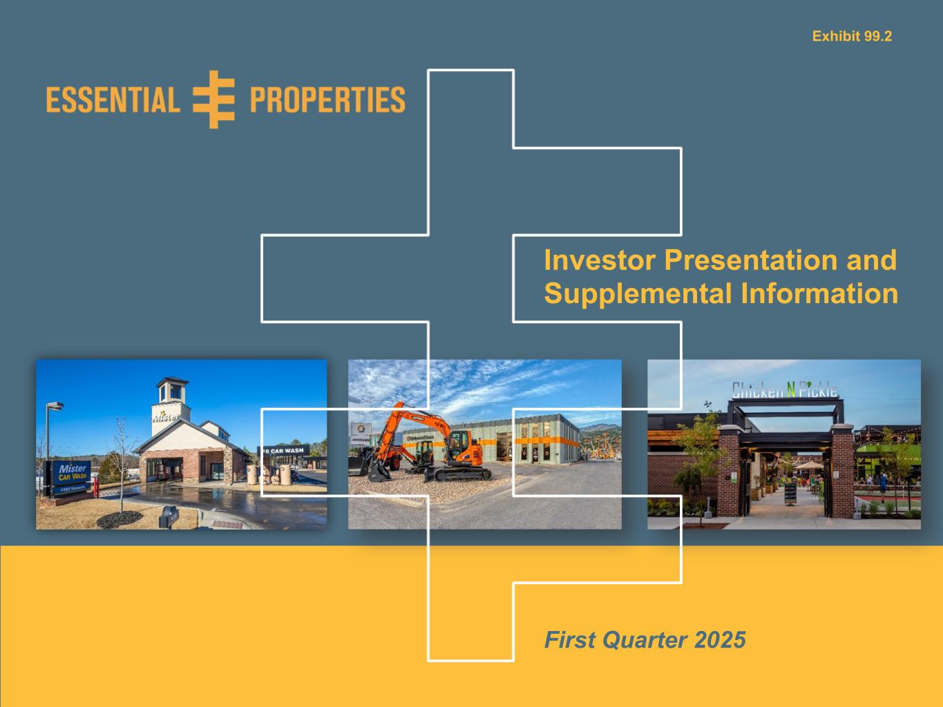 ニュージャージー州プリンストン--(BUSINESS WIRE)--(ビジネスワイヤ) -- エッセンシャル・プロパティーズ・リアルティ・トラスト(NYSE: EPRT、以下「エッセンシャル・プロパティーズ」または「当社」)は本日、2025年3月31日までの3カ月間の営業成績を発表しました。