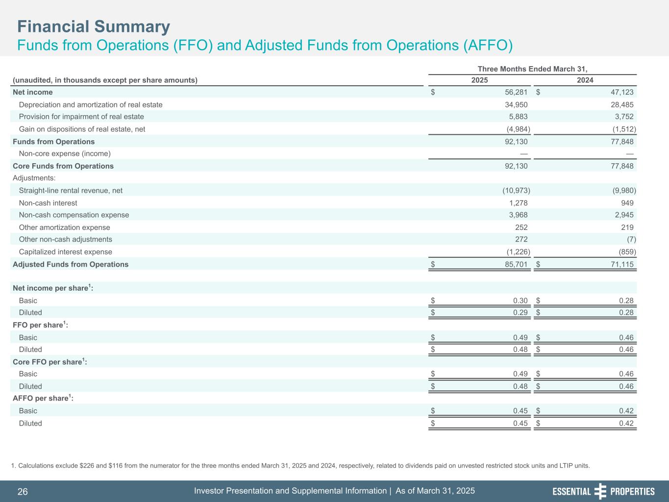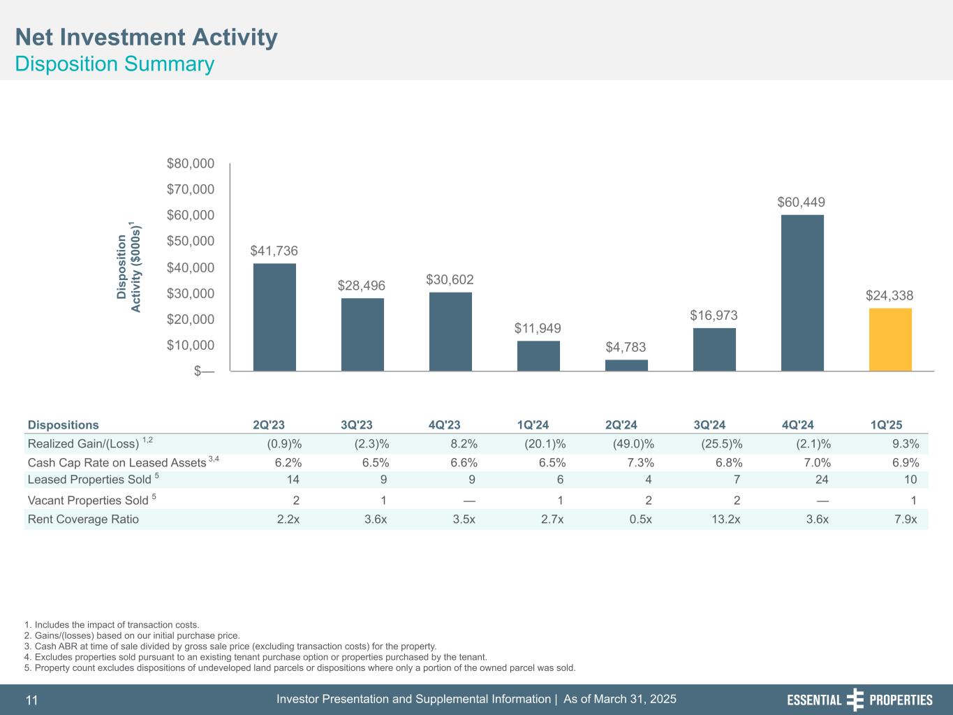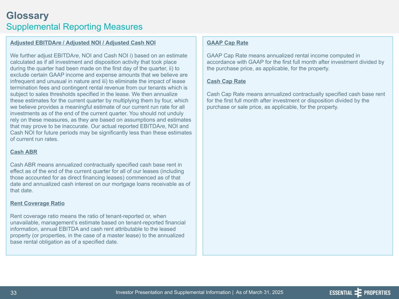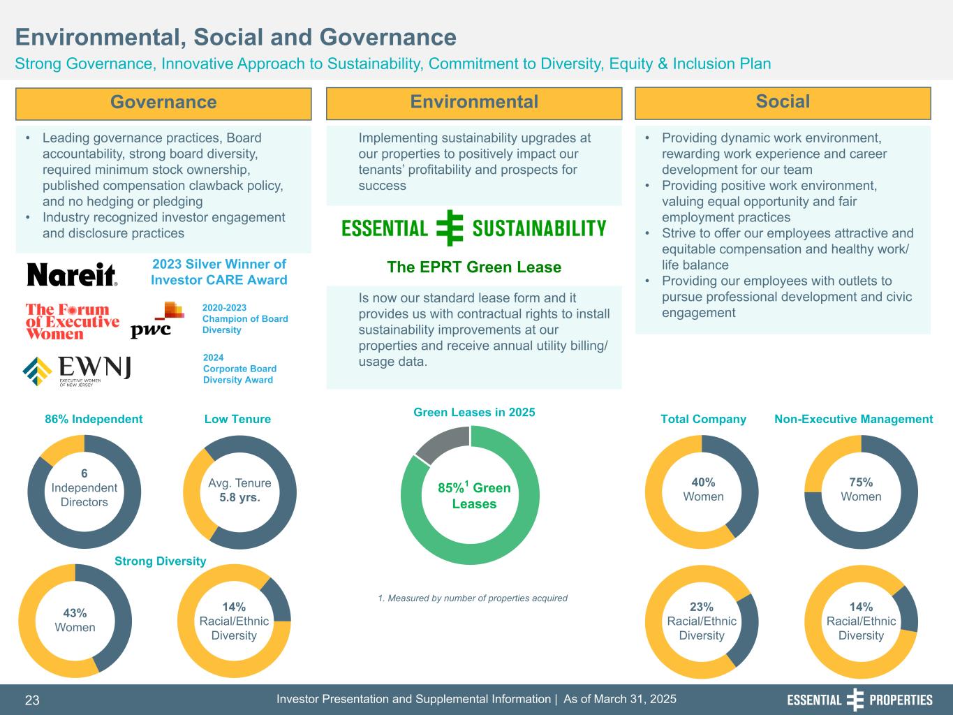 ニュージャージー州プリンストン--(BUSINESS WIRE)--(ビジネスワイヤ) -- エッセンシャル・プロパティーズ・リアルティ・トラスト(NYSE: EPRT、以下「エッセンシャル・プロパティーズ」または「当社」)は本日、2025年3月31日までの3カ月間の営業成績を発表しました。