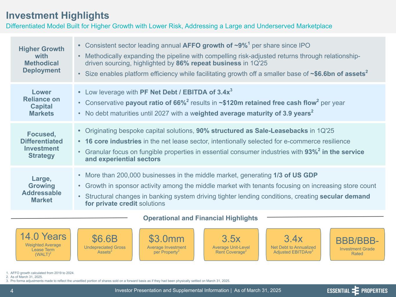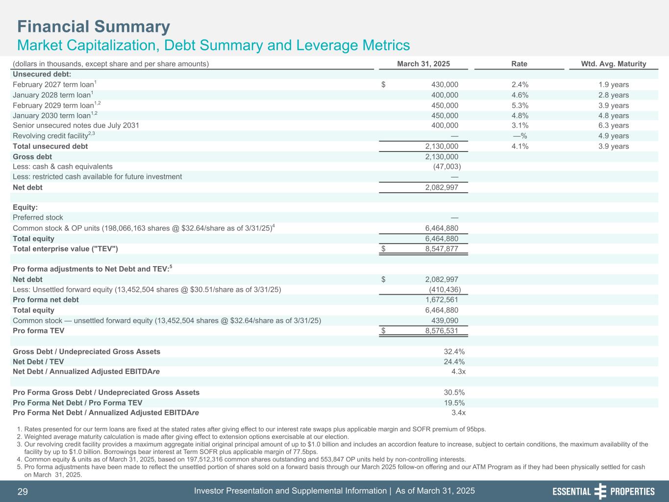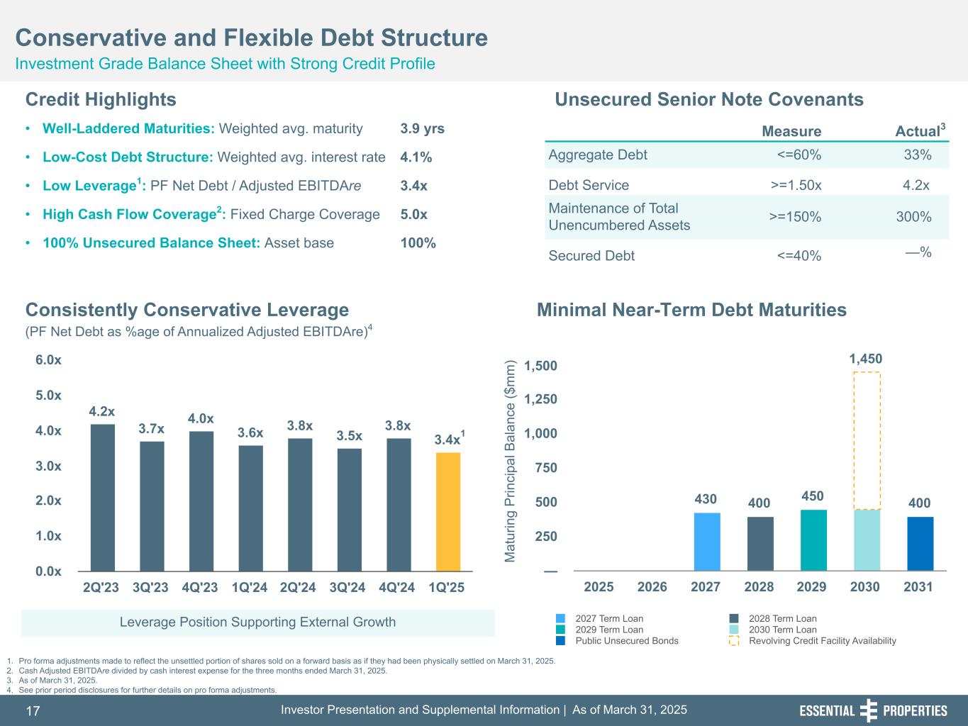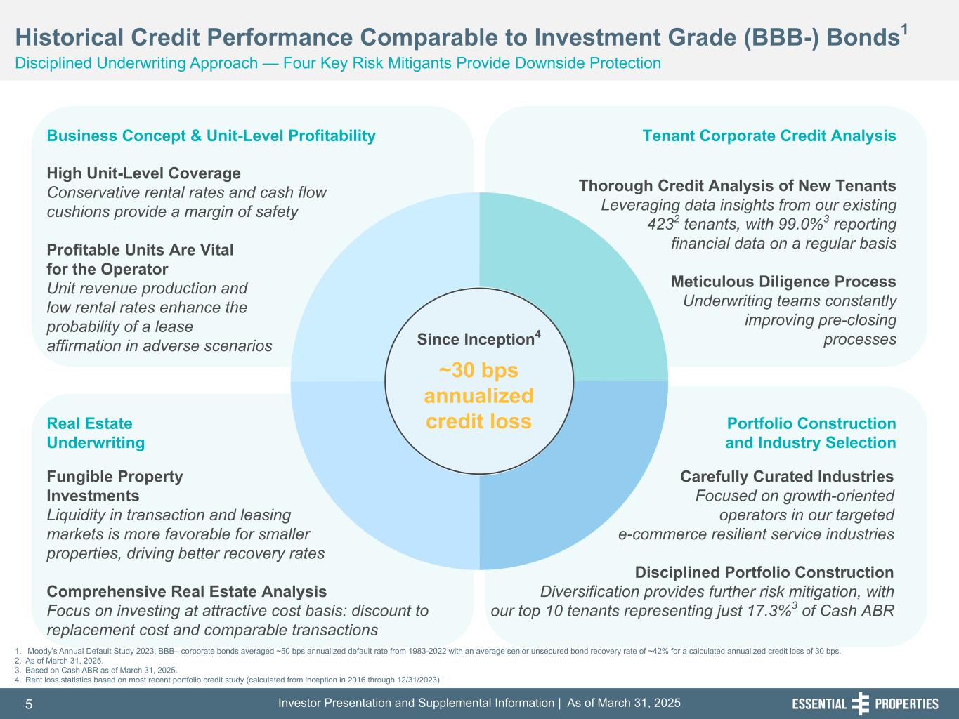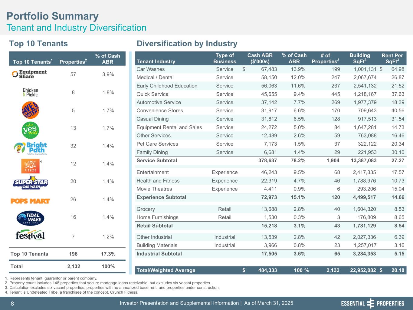 ニュージャージー州プリンストン--(BUSINESS WIRE)--(ビジネスワイヤ) -- エッセンシャル・プロパティーズ・リアルティ・トラスト(NYSE: EPRT、以下「エッセンシャル・プロパティーズ」または「当社」)は本日、2025年3月31日までの3カ月間の営業成績を発表しました。