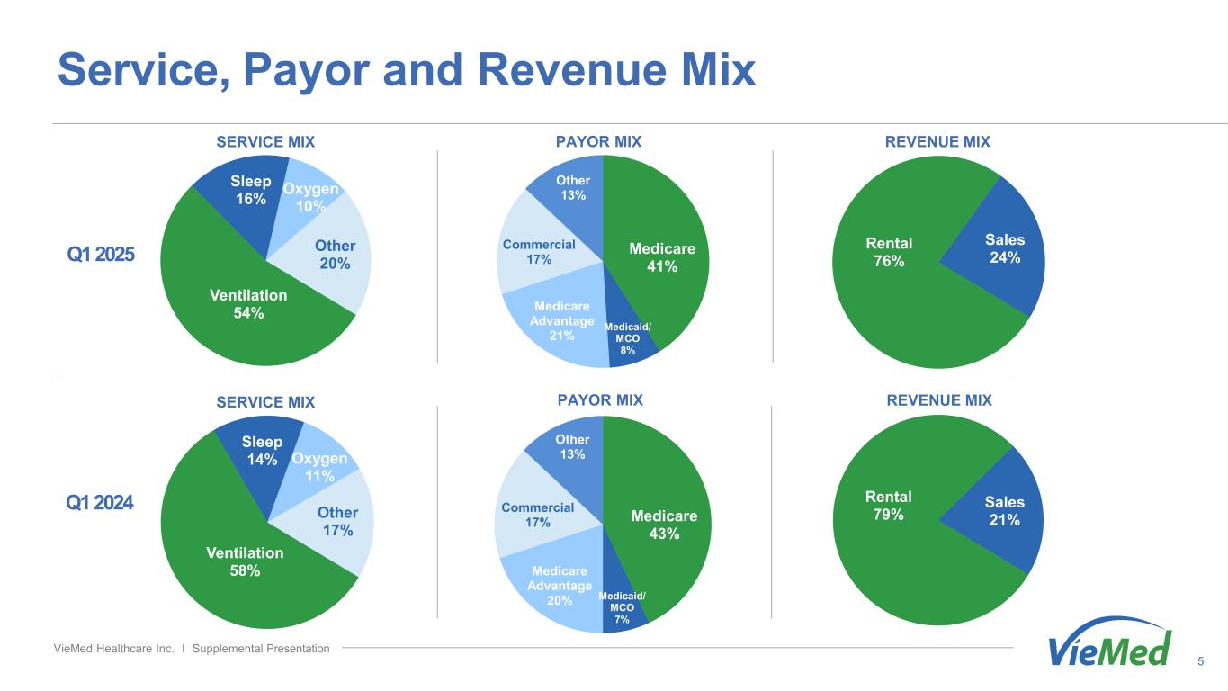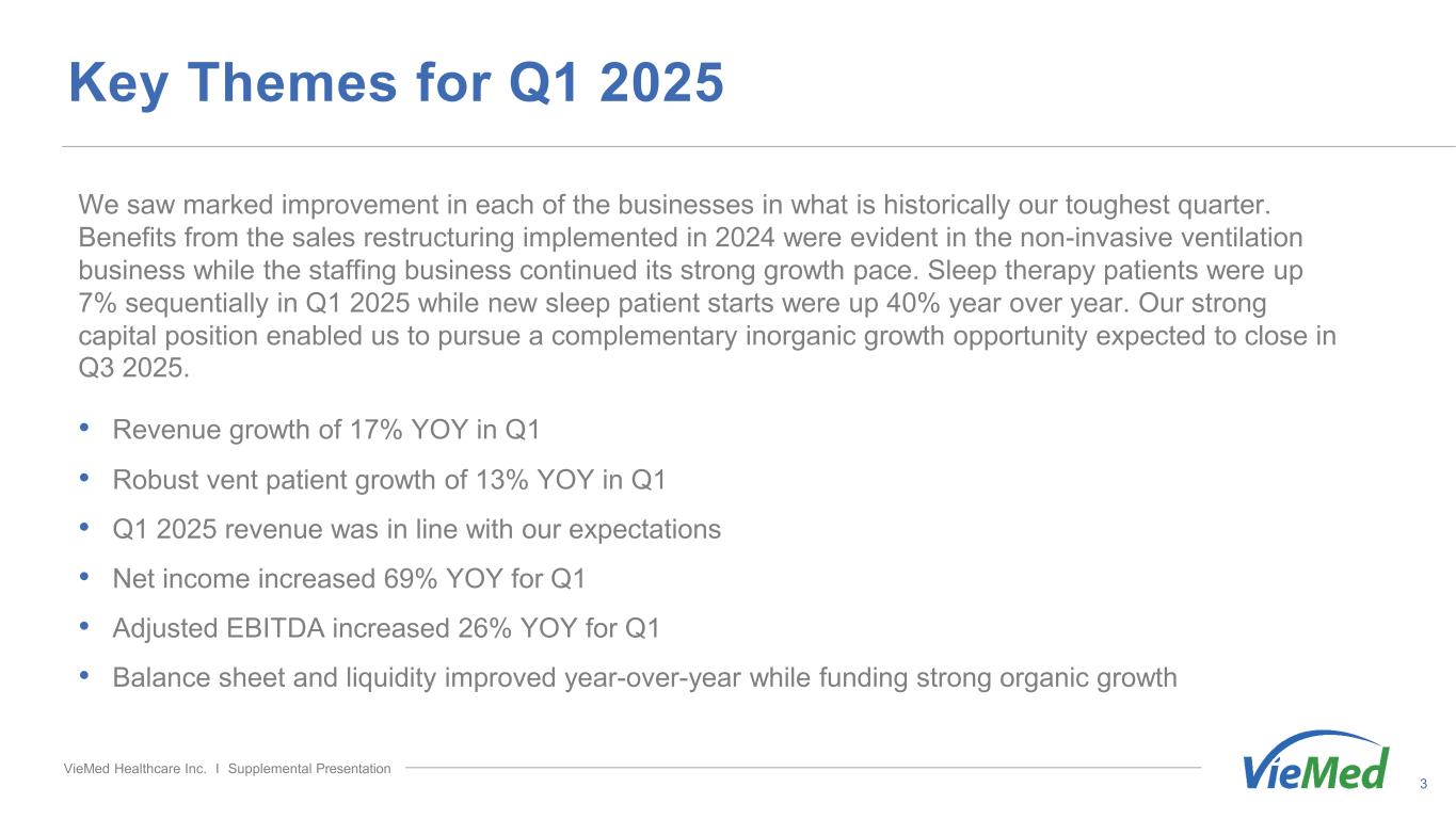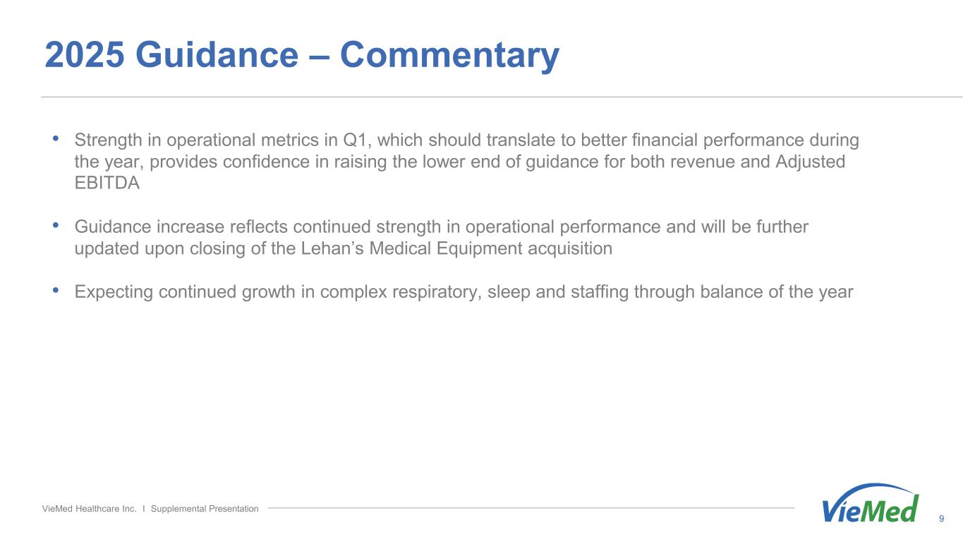 ルイジアナ州ラファイエット(2025年5月7日)呼吸ケアと技術対応型在宅医療機器サービスの全国的リーダーであるヴィームド・ヘルスケア社(以下「当社」または「ヴィームド」)(NASDAQ:VMD)は本日、2025年3月31日に終了した3カ月間の決算と、2025年12月31日に終了する通年のガイダンスを更新したと発表した。