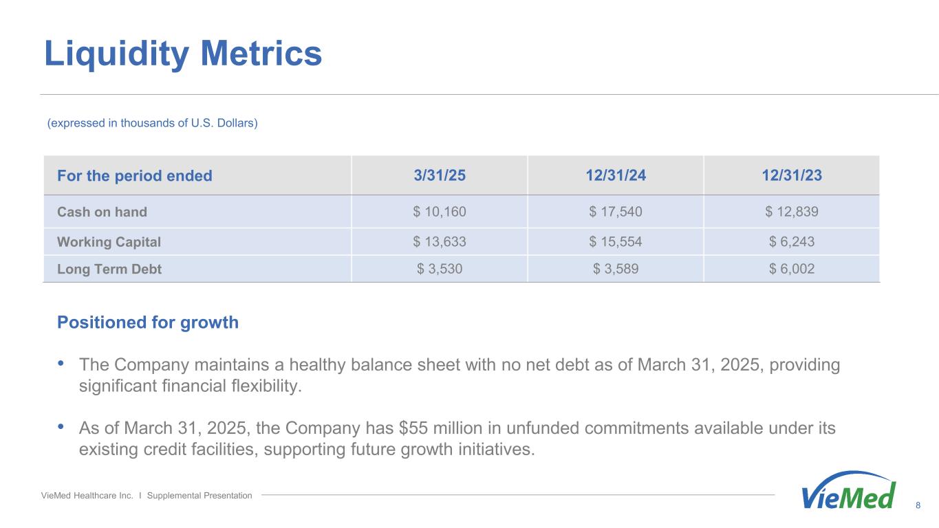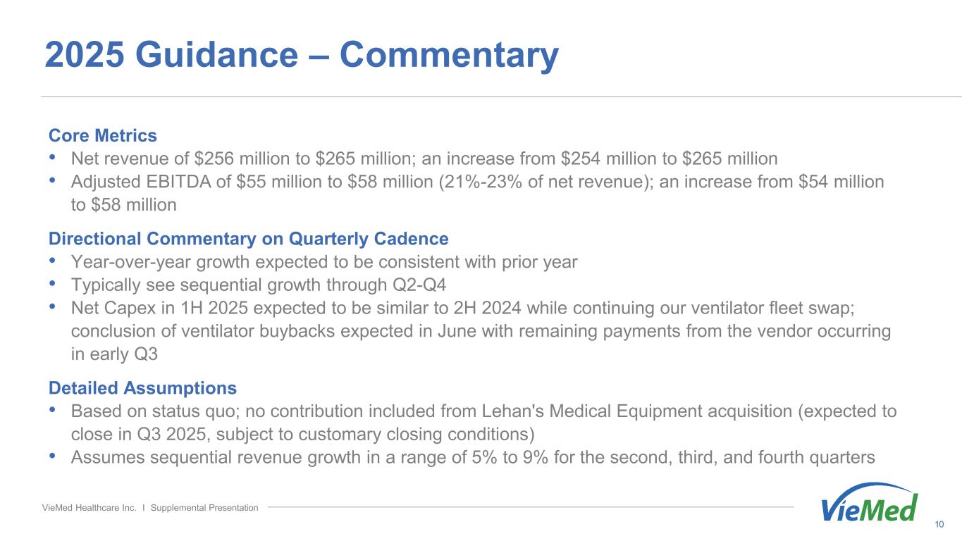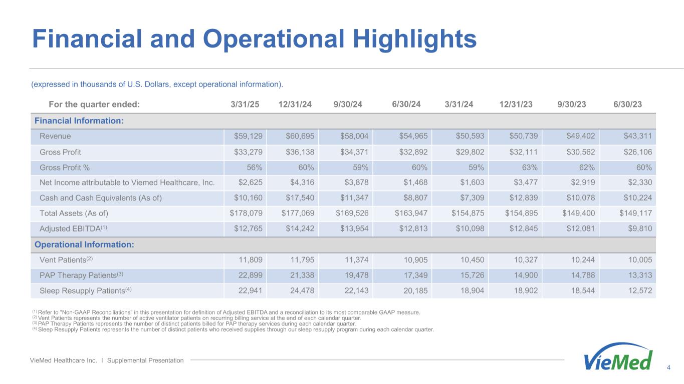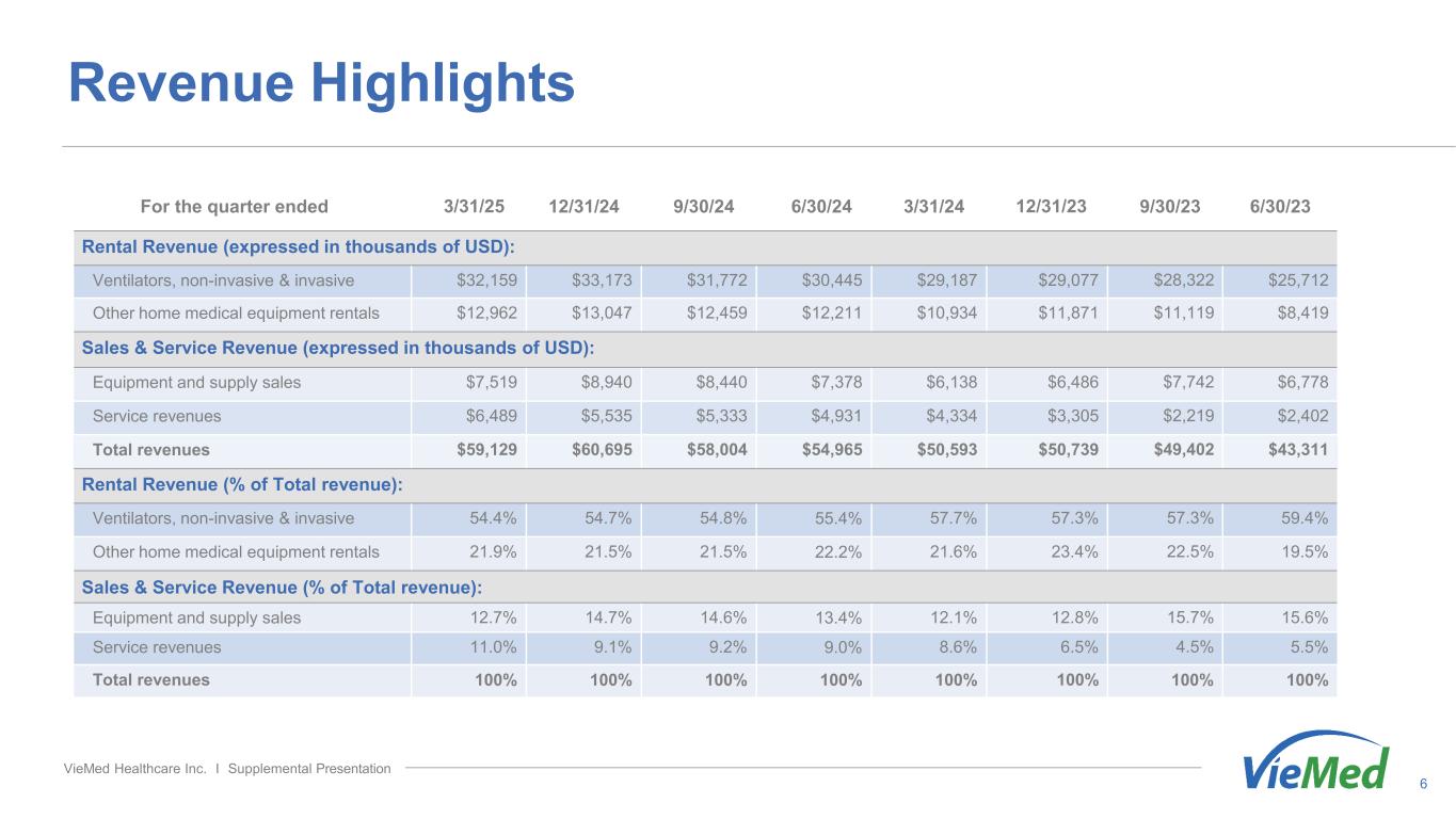 ルイジアナ州ラファイエット(2025年5月7日)呼吸ケアと技術対応型在宅医療機器サービスの全国的リーダーであるヴィームド・ヘルスケア社(以下「当社」または「ヴィームド」)(NASDAQ:VMD)は本日、2025年3月31日に終了した3カ月間の決算と、2025年12月31日に終了する通年のガイダンスを更新したと発表した。