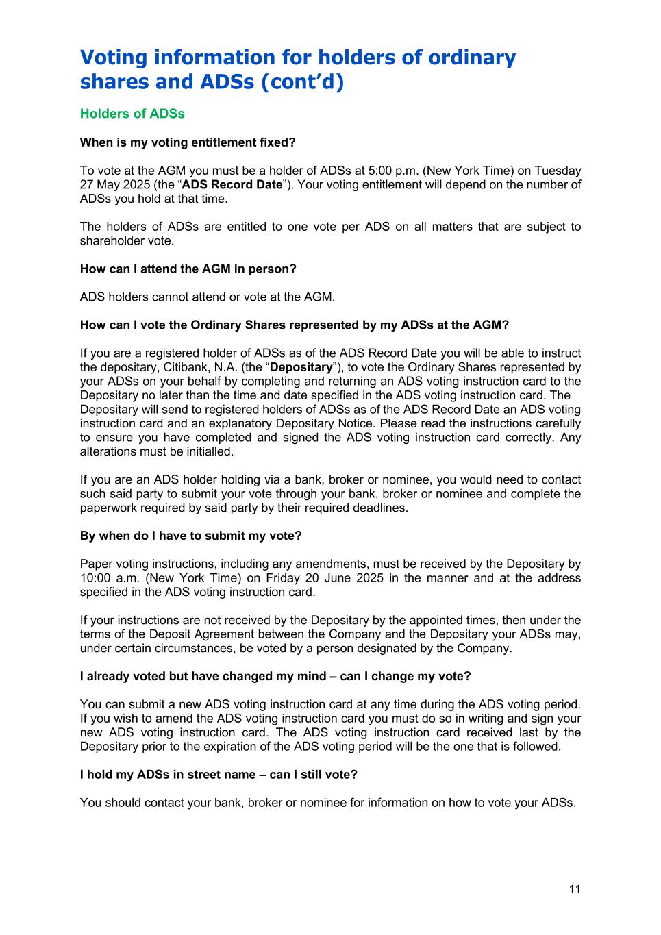 Voting information for holders of ordinary shares and ADSs 9 Holders of ordinary shares When is my voting entitlement fixed? To vote at the AGM you must be a registered holder of ordinary shares at 6:00 p.m. (British Summer Time) on Tuesday 24 June 2025 (or, if the AGM is adjourned, at 6:00 p.m. (British Summer Time) on the day two working days prior to the adjourned meeting). Your voting entitlement will depend on the number of ordinary shares that you hold at that time. The holders of ordinary shares are entitled to one vote per share on all matters that are subject to shareholder vote. How can I vote at the AGM? If you are a registered holder of ordinary shares, you can appoint the chair of the AGM or any other person to attend, speak and vote on your behalf. This person is called your proxy. Your proxy does not have to be a shareholder, but must attend the AGM to represent you. We recommend that shareholders appoint the chair of the AGM as their proxy. You can instruct your proxy how to vote. Where no specific instruction is given by you, your proxy may vote at their discretion or refrain from voting, as they see fit. You can appoint more than one proxy provided it is in relation to different shares within your holding. You can appoint a proxy and submit voting instructions: - by logging on to www.investorcentre.co.uk/eproxy and following the instructions; - by completing and returning the paper form of proxy (if one has been sent to you). Please read the instructions carefully to ensure you have completed and signed the form correctly. Any alterations must be initialled; or - via CREST (see further notes on starting on page 14). If you own shares jointly with one or more other persons, then where more than one of the joint holders completes a proxy appointment, only the appointment submitted by the most senior holder will be accepted. For this purpose, seniority is determined by the order in which the names of the joint holders appear in the Company’s register of members in respect of the joint holding (the first-named being the most senior). By when do I have to submit my vote? Proxy appointments and voting instructions, including any amendments, must be received by Computershare Investor Services, the Company’s registrar (the “Registrar”), by 11:00 a.m. (British Summer Time) on Tuesday 24 June 2025 (or, if the AGM is adjourned, 48 hours (excluding non-working days) prior to the time of the adjourned meeting). If you miss this deadline and wish to submit a new vote or amend an existing vote, you can only do so by attending the AGM in person and voting.