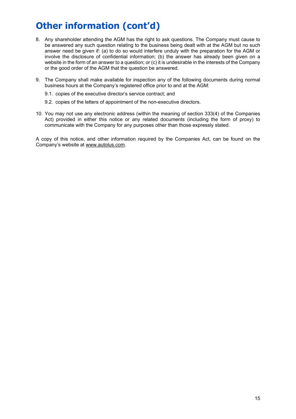 Other information (cont’d) 15 8. Any shareholder attending the AGM has the right to ask questions. The Company must cause to be answered any such question relating to the business being dealt with at the AGM but no such answer need be given if: (a) to do so would interfere unduly with the preparation for the AGM or involve the disclosure of confidential information; (b) the answer has already been given on a website in the form of an answer to a question; or (c) it is undesirable in the interests of the Company or the good order of the AGM that the question be answered. 9. The Company shall make available for inspection any of the following documents during normal business hours at the Company’s registered office prior to and at the AGM: 9.1. copies of the executive director’s service contract; and 9.2. copies of the letters of appointment of the non-executive directors. 10. You may not use any electronic address (within the meaning of section 333(4) of the Companies Act) provided in either this notice or any related documents (including the form of proxy) to communicate with the Company for any purposes other than those expressly stated. A copy of this notice, and other information required by the Companies Act, can be found on the Company’s website at www.autolus.com.