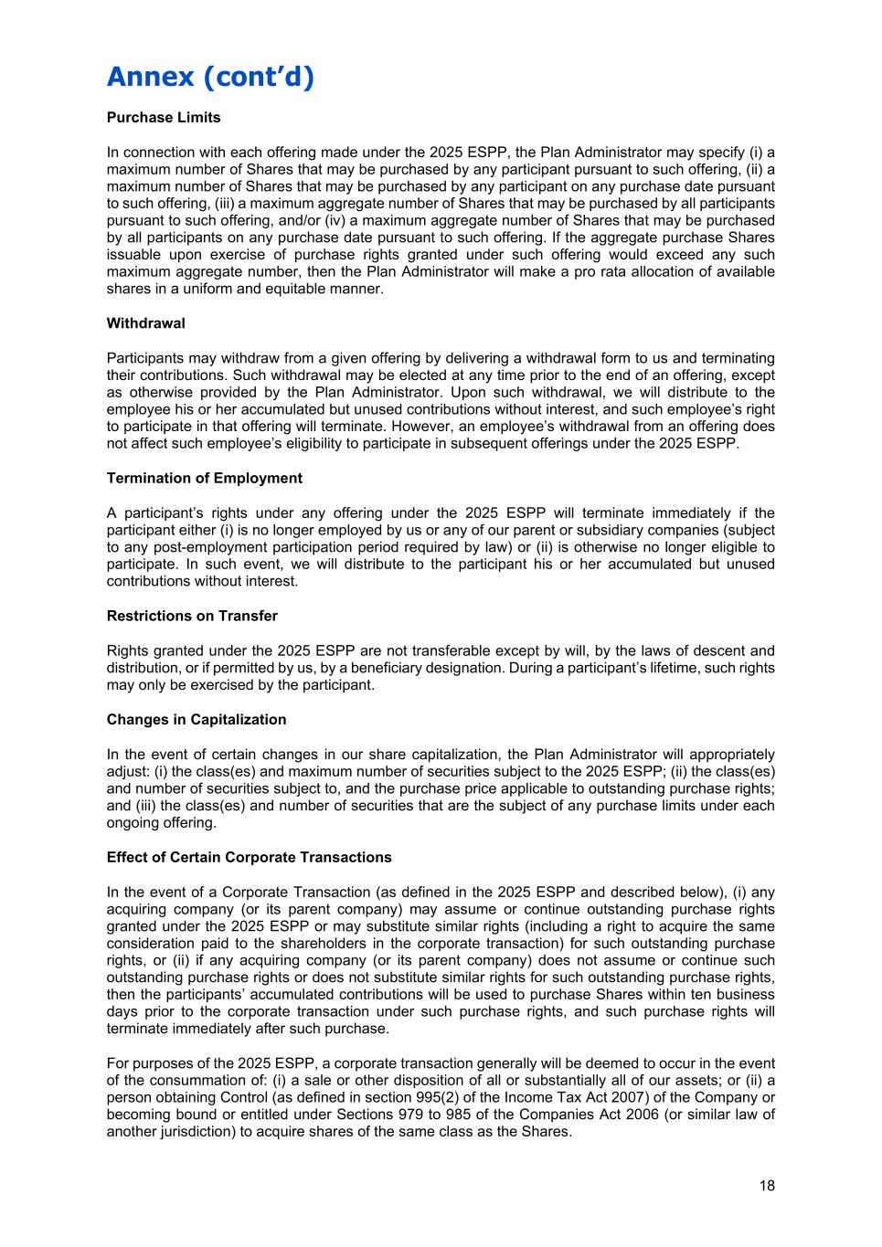 Annex (cont’d) 19 Non-US Participants The Plan Administrator may adopt such procedures and sub-plans as are necessary or appropriate to permit participation in the 2025 ESPP by eligible employees who are resident or employed outside the United States. Duration, Amendment and Termination The Plan Administrator may amend or terminate the 2025 ESPP at any time. However, except in regard to certain capitalization adjustments, any such amendment must be approved by our shareholders if such approval is required by applicable law or listing requirements. Any outstanding purchase rights granted before an amendment or termination of the 2025 ESPP will not be materially impaired by any such amendment or termination, except (i) with the consent of the employee to whom such purchase rights were granted, (ii) as necessary to comply with applicable laws, listing requirements or governmental regulations (including Section 423 of the Code), or (iii) as necessary to obtain or maintain favorable tax, listing or regulatory treatment. Notwithstanding anything in the 2025 ESPP or any offering to the contrary, the Plan Administrator will be entitled to: (i) establish the exchange ratio applicable to amounts withheld in a currency other than U.S. dollars; (ii) permit contributions in excess of the amount designated by a participant in order to adjust for mistakes in the processing of properly completed contribution elections; (iii) establish reasonable waiting and adjustment periods and/or accounting and crediting procedures to ensure that amounts applied toward the purchase of our Shares for each participant properly correspond with amounts withheld from the participant’s contributions; (iv) amend any outstanding purchase rights or clarify any ambiguities regarding the terms of any offering to enable such purchase rights to qualify under and/or comply with Section 423 of the Code; and (v) establish other limitations or procedures as the Plan Administrator determines in its sole discretion advisable that are consistent with the 2025 ESPP. Any such actions by the Plan Administrator will not be considered to alter or impair any purchase rights granted under an offering as they are part of the initial terms of each offering and the purchase rights granted under each offering. Federal Income Tax Information The following is a summary of the principal United States federal income taxation consequences to participants and us with respect to participation in the 2025 ESPP. This summary is not intended to be exhaustive and does not discuss the income tax laws of any local, state or foreign jurisdiction in which a participant may reside. The information is based upon current federal income tax rules and therefore is subject to change when those rules change. Because the tax consequences to any participant may depend on his or her particular situation, each participant should consult the participant’s tax adviser regarding the federal, state, local, and other tax consequences of the grant or exercise of a purchase right or the sale or other disposition of Shares acquired under the 2025 ESPP. The 2025 ESPP is not qualified under the provisions of Section 401(a) of the Code and is not subject to any of the provisions of the Employee Retirement Income Security Act of 1974, as amended. Rights granted under the 423 Component of the 2025 ESPP are intended to qualify for favorable federal income tax treatment associated with rights granted under an “employee stock purchase plan” which qualifies under the provisions of Section 423 of the Code. A participant will be taxed on amounts withheld for the purchase of Shares as if such amounts were actually received. Otherwise, no income will be taxable to a participant as a result of the granting or exercise of a purchase right until a sale or other disposition of the acquired shares. The taxation upon such sale or disposition will depend upon the holding period of the acquired shares. If the shares are sold or otherwise disposed of more than two years after the beginning of the offering period and more than one year after the shares are transferred to the participant, then the lesser of the following will be treated as ordinary income: (i) the excess of the fair market value of the shares at the time of such sale or disposition over the purchase price; or (ii) the excess of the fair market value of the shares as of the beginning of the offering period over the purchase price (determined as of the beginning of the offering period). Any further gain or any loss will be taxed as a long-term capital gain or loss.