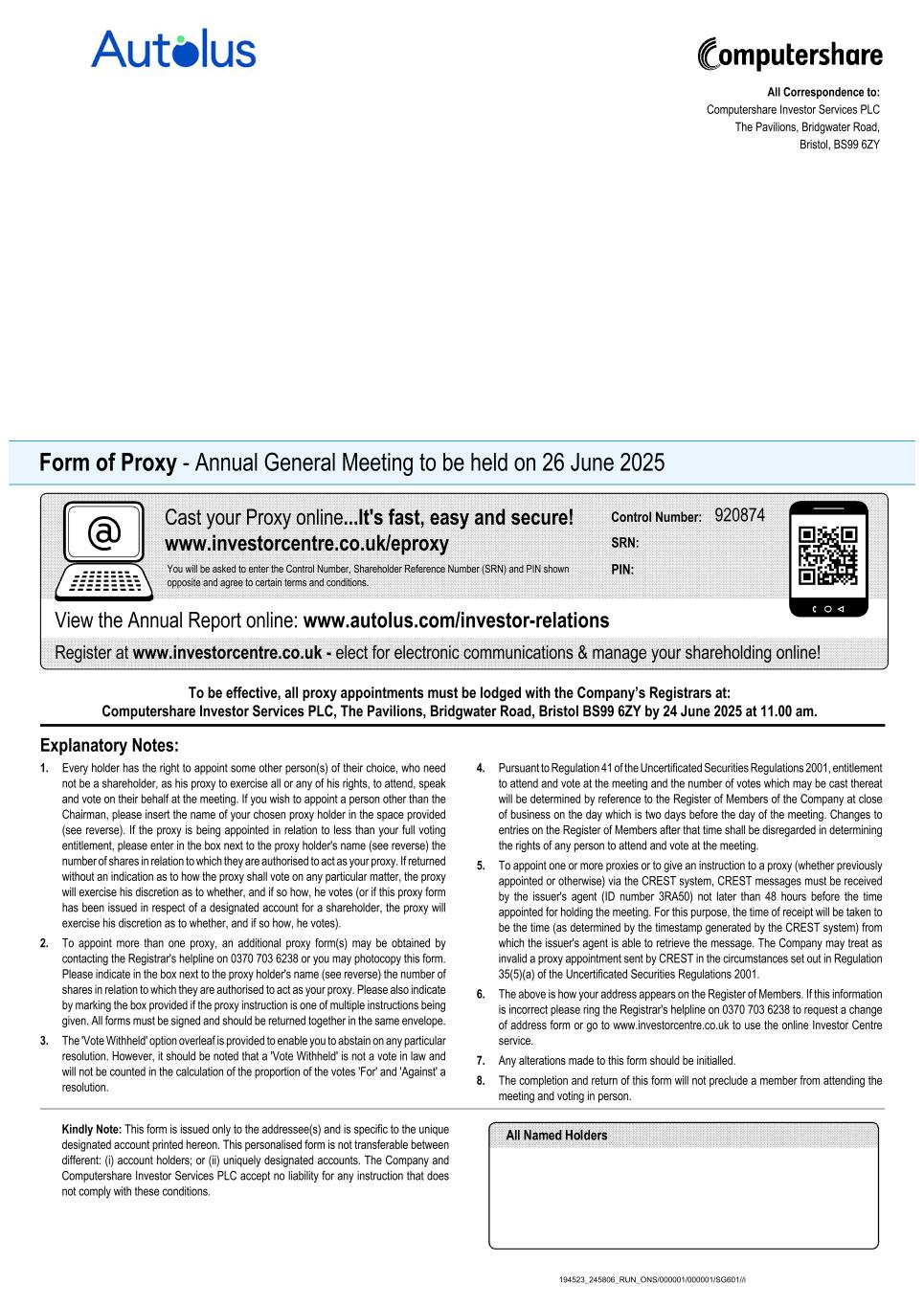 Other information 12 A copy of this notice and other information required by the Companies Act can be found at www.autolus.com/investor-relations/news-and-events/agm. Information rights Under the Companies Act, there are a number of rights that may now be available to indirect investors of the Company, including the right to be nominated by the registered holder to receive general shareholder communications direct from the Company. The rights of indirect investors who have been nominated to receive communications from the Company in accordance with section 146 of the Companies Act (“nominated persons”) do not include the right to appoint a proxy. However, nominated persons may have a right under an agreement with the registered shareholder who holds the shares on their behalf to be appointed (or to have someone else appointed) as a proxy. Alternatively, if nominated persons do not have such a right or do not wish to exercise it, they may have a right under such an agreement to give instructions to the person holding the shares as to the exercise of voting rights. If you have been so nominated to receive general shareholder communications direct from the Company, it is important to remember that your main contact in terms of your investment remains with the registered shareholder or custodian or broker, or whoever administers the investment on your behalf. You should also deal with them in relation to any rights that you may have under agreements with them to be appointed as a proxy and to attend, participate in, and vote at the AGM, as described above. Any changes or queries relating to your personal details and holding (including any administration thereof) must continue to be directed to your existing contact at your investment manager or custodian. The Company cannot guarantee dealing with matters that are directed to us in error. The only exception to this is where the Company is exercising one of its powers under the Companies Act and writes to you directly for a response. Statements related to the audit Members satisfying the thresholds in section 527 of the Companies Act can require the Company to publish a statement on its website setting out any matter relating to: - the audit of the Company’s accounts (including the auditor’s report and the conduct of the audit) that are to be laid before the AGM; and - any circumstances connected with an auditor of the Company ceasing to hold office since the last AGM, that the members propose to raise at the AGM. The Company cannot require the members requesting the publication to pay its expenses in connection with the publication. The company must forward a copy of the statement to the auditors when it publishes the statement on the website. The business which may be dealt with at the AGM includes any such statement that the company has been required to publish on its website. Shareholder requisition rights Members satisfying the thresholds in section 338 of the Companies Act can require the Company to give to members of the Company entitled to receive notice of the AGM, notice of a resolution which may properly be moved, and which those members intend to move, at the AGM, provided in each case that the requirements of that section are met and provided that