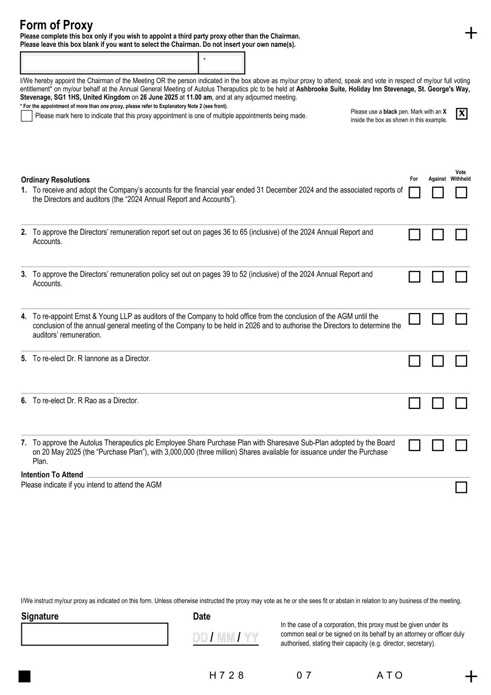 Notice of 2025 Annual General Meeting 4 Notice is hereby given that the 2025 Annual General Meeting of Autolus Therapeutics plc will be held at the Ashbrooke Suite, Holiday Inn, St. George's Way, Stevenage SG1 1HS on 26 June 2025 at 11:00 a.m. (British Summer Time), for the transaction of the following business. This notice is being sent to you because, as of Friday 30 May 2025 (being the latest practicable date before publication of this notice), you are registered as a holder of ordinary shares in the register of members of the Company. However, this notice will also be made available to holders of ADSs and contains information relevant to holders of ADSs. Resolutions 1-7 will be proposed as ordinary resolutions, meaning that, for each of resolutions 1-7 to be passed, more than half of the votes cast must be in favour of the resolution. The Board considers that all resolutions to be considered at the AGM are in the best interests of the Company and its shareholders and are most likely to promote the success of the Company for the benefit of its shareholders as a whole and recommends that you vote in favour of such resolutions. You can order a paper copy of this notice or any other company report at www.autolus.com. Ordinary resolutions Resolution 1 Report and accounts To receive and adopt the Company’s accounts for the financial year ended 31 December 2024 and the associated reports of the Directors and auditors (the “2024 Annual Report and Accounts”). See the notes on page 6. Resolution 2 Directors’ remuneration report To approve the Directors’ remuneration report (excluding the Directors’ remuneration policy set out on pages 39 to 52 of the Directors’ remuneration report), which is set out on pages 36 to 65 of the 2024 Annual Report and Accounts. See the notes on page 6. Resolution 3 Directors’ remuneration policy To approve the Directors’ remuneration policy set out on pages 39 to 52 within the Directors’ remuneration report contained in the 2024 Annual Report and Accounts, which will take effect immediately after the end of the AGM. See the notes on page 6. Resolution 4 Re-appointment of auditors and determination of auditors’ remuneration To re-appoint Ernst & Young LLP as auditors of the Company to hold office from the conclusion of the 2025 AGM until the conclusion of the 2026 AGM and to authorise the Directors to determine the auditors’ remuneration. See the notes on page 6. Resolution 5 Director re-election To re-elect Dr. R Iannone as a Director. See the notes and his biography on page 7. Resolution 6 Director re-election To re-elect Dr. R Rao as a Director. See the notes and his biography on page 8.