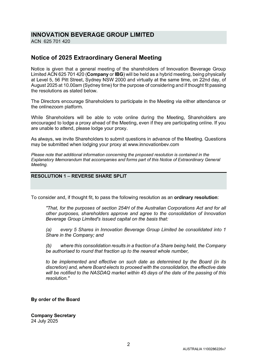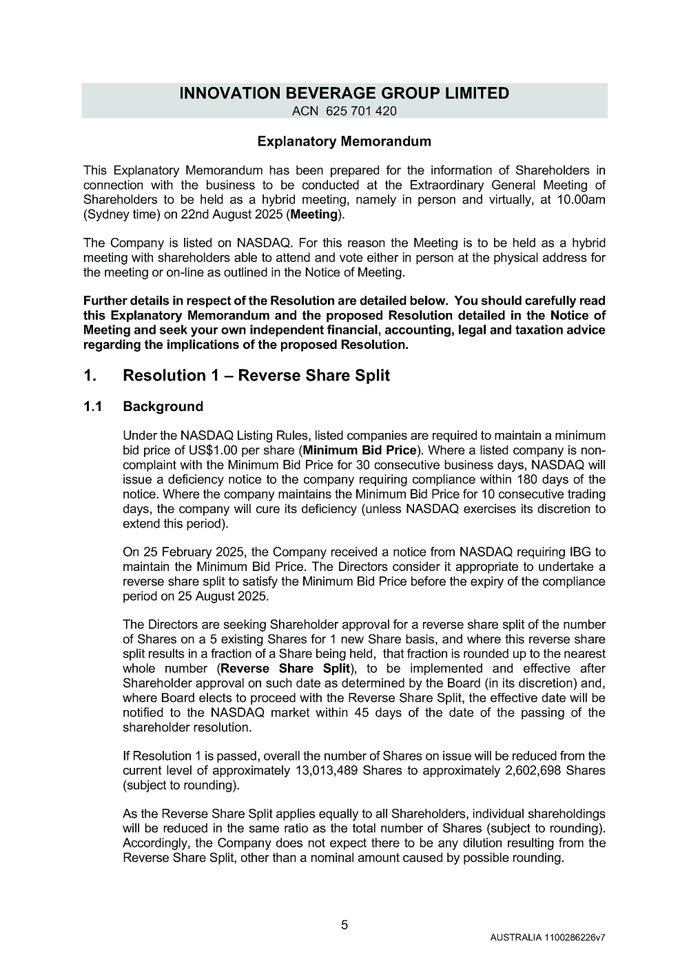 In connection with its plan to regain compliance, as required by the laws and regulations of Australia, the Company obtained shareholder approval at an Extraordinary General Meeting held on August 22, 2025, to consolidate the Company’s issued share capital on a five-for-one (5-for-1) basis (the “Reverse Stock Split”) and on August 28, 2025, the Board of Directors (the “Board”) approved the Reverse Stock Split. Any fractional entitlements resulting from the Reverse Stock Split will be rounded up to the nearest whole share. The Reverse Stock Split will become effective on a date to be determined by the Board.