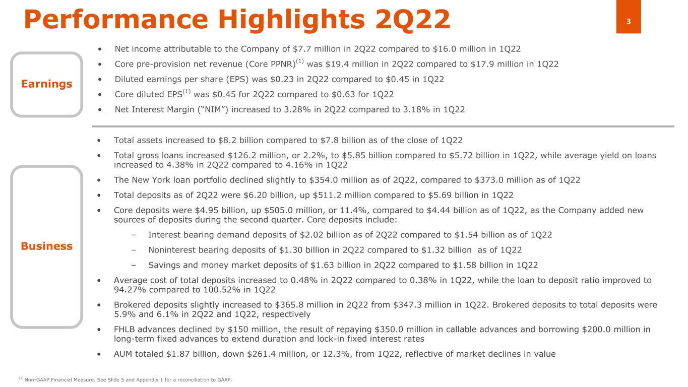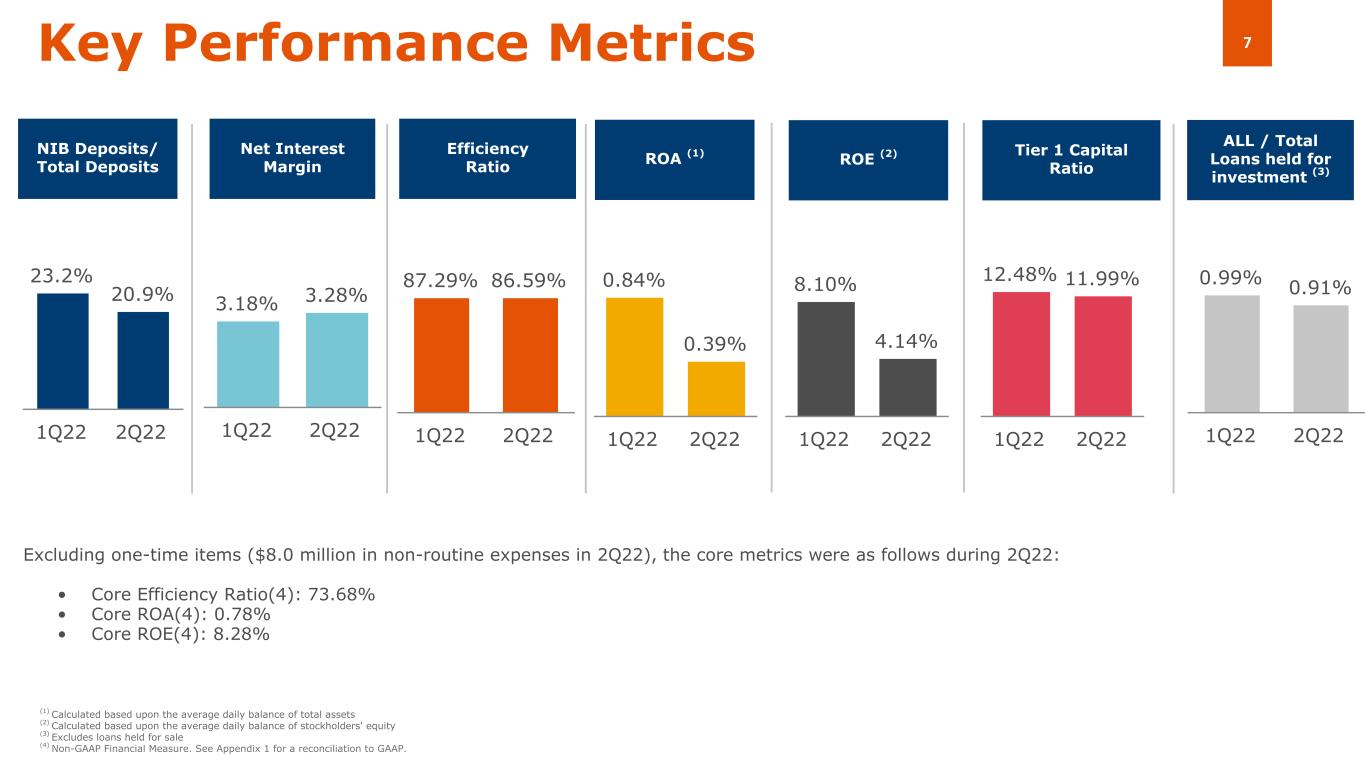 総貸付額に対する不良債権比率は、1Q22の0.82%から2Q22では0.43%、2Q21の2.16%から大幅に減少しました。特筆すべき点は、22 年第 1 四半期に比べ 150 万ドル増加し、21 年第 2 四半期に比べ 5480 万ドル減少したことです。不良債権の減少は主に、合計1920万ドルのペイダウン及びペイオフ、合計440万ドルのチャージオフ(前述のコーヒートレーダー残債の360万ドルを含む)により、商業ローン1件の格下げによる230万ドルで相殺されました。特筆すべきローンの増加は、主にニューヨークの商業用不動産(CRE)リテールローン1件の格下げ計2900万ドルによるものですが、商業ローン2件の格上げ計1570万ドル、商業ローン3件の払い下げおよび償還計1120万ドルで相殺されています。