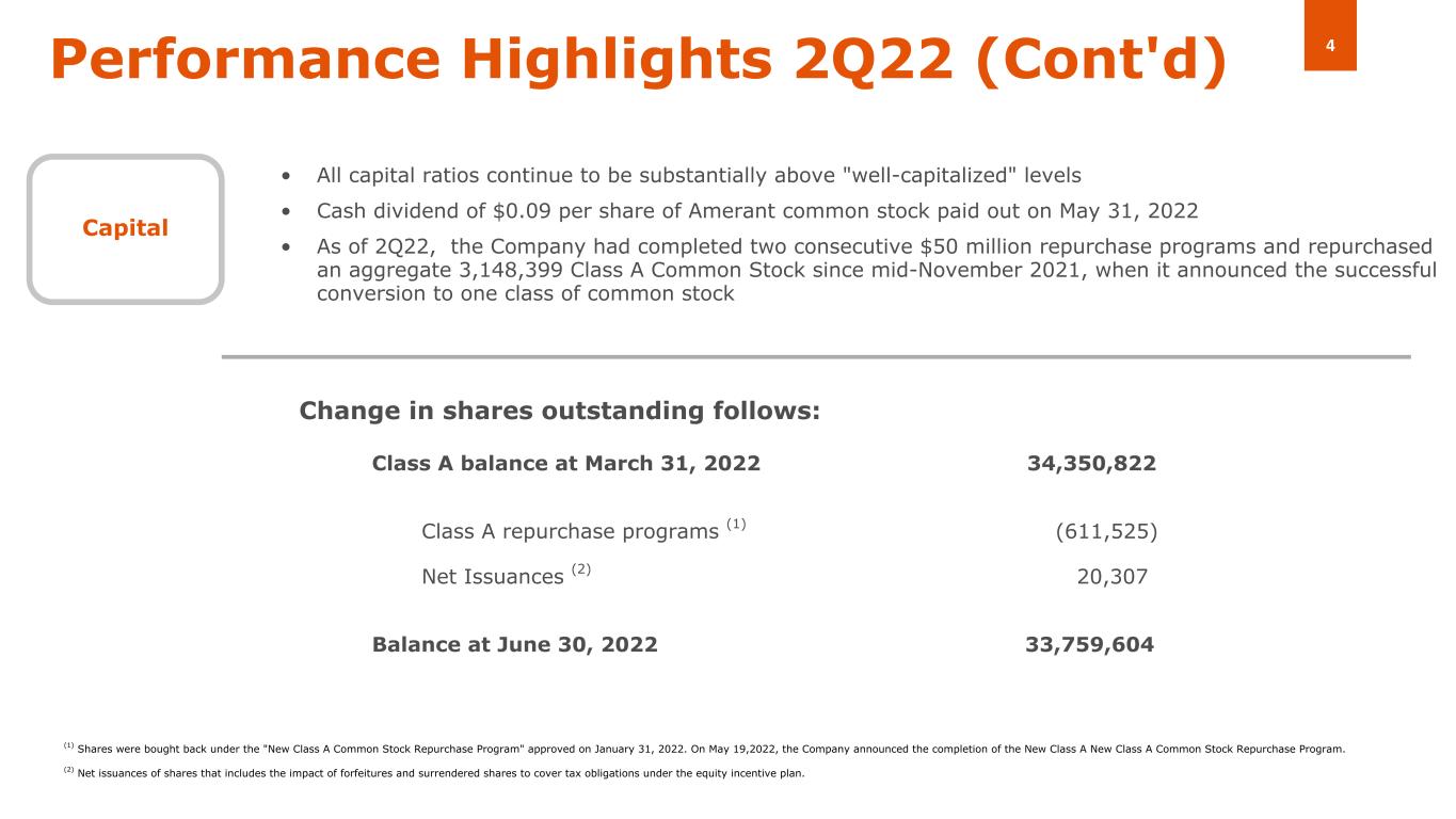 2022 年 7 月 20 日、フロリダ州コラルゲーブルズ。Amerant Bancorp Inc. (NASDAQ: AMTB) (以下「当社」または「Amerant」)は本日、2022年第2四半期の当社帰属純利益が770万ドル、希薄化後1株当たり0.23ドルとなり、当社帰属純利益の16ドルに対し、減少したと発表しました。2022年第1四半期の当社株主に帰属する当期純利益1600万ドル(希薄化後1株当たり0.45ドル)に比べ減少し、2021年第2四半期の当社株主に帰属する当期純利益1600万ドル(希薄化後1株当たり0.42ドル)に比べ減少しています。22 年第 2 四半期に計上された非定常費用 800 万ドルが、純利益の前四半期比減少の主な要因です。