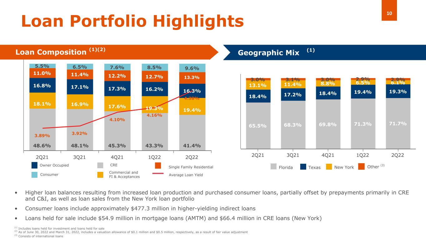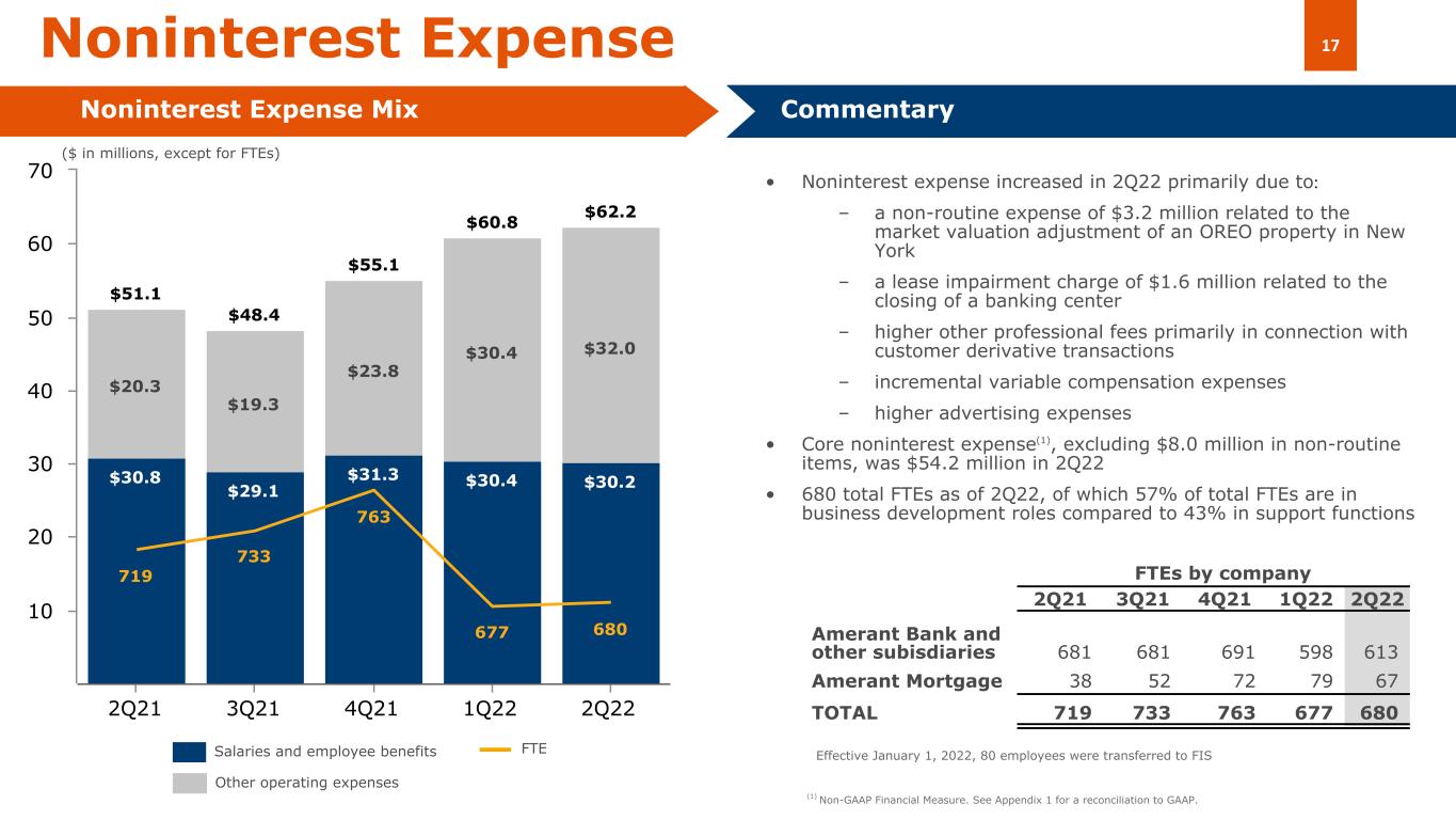 22 年第 2 四半期の NIM は 3.28%となり、22 年第 1 四半期の 3.18%から 10bp 上昇し、21 年第 2 四半期の 2.81%からは 47bp 上昇しました。22 年第 2 四半期の NIM の上昇には、市場金利の上昇によるローン利回りへの影響と、アメラントのローン組成 量増加への取り組みが含まれている。また、22 年第 2 四半期には、間接融資プログラムによる消費者ローンの購入を通じて、NIM を改善するさらなる機会を模索し続けました。さらに 22 年第 2 四半期には、FHLB のコーラブル前渡金 3 億 5,000 万ドルを返済し、長期固定前渡金 2 億ドルを借り入れ、このポートフォリオの期間を延長して固定金利を固定化しました。