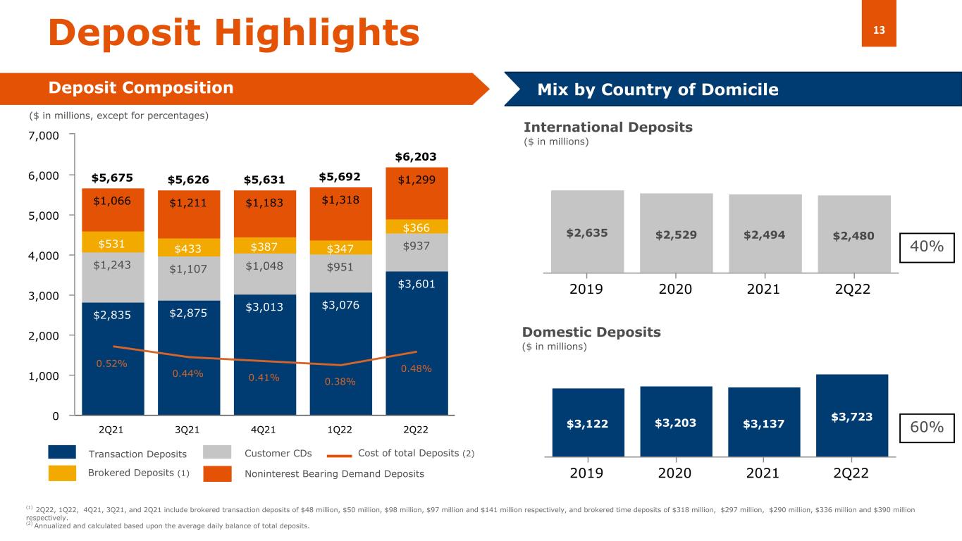 22 年第 2 四半期の総預金残高は、22 年第 1 四半期比では 5 億 1120 万ドル(8.98%)、21 年第 4 四半期比では 5 億 7,200 万ドル(10.2%)それぞれ増加して 62 億ドルとなりました。前四半期比での総預金残高の増加は、主に顧客取引口座残高が前年同期比 506.6 百万ドル(11.5%)増加した ことによるもので、エスクロー口座や地方自治体からの資金調達など、当四半期に新たな預金源を探し続けた結果、 主に有利子口座がこうした増加要因に貢献しました。総預金残高の増加を補ったのは、無利息預金が1930万ドル(1.5%)減少したことです。累計の預金残高の増加は、主に顧客取引口座の残高が、前述の追加的な資金源を含めて、4Q21 と比較して 7 億 470 万ドル(16.8%)増加したことに起因しています。一方、顧客定期預金は 1 億 1,120 万ドル(10.6%)減少し、前年同期比では増加しました。