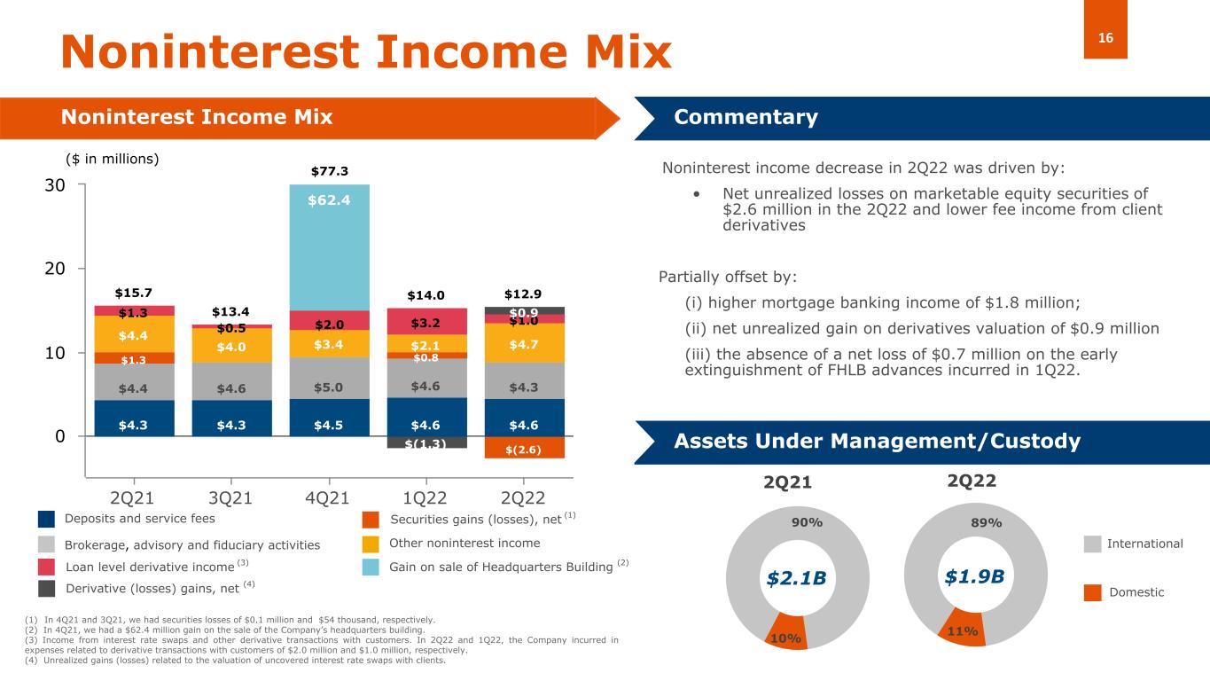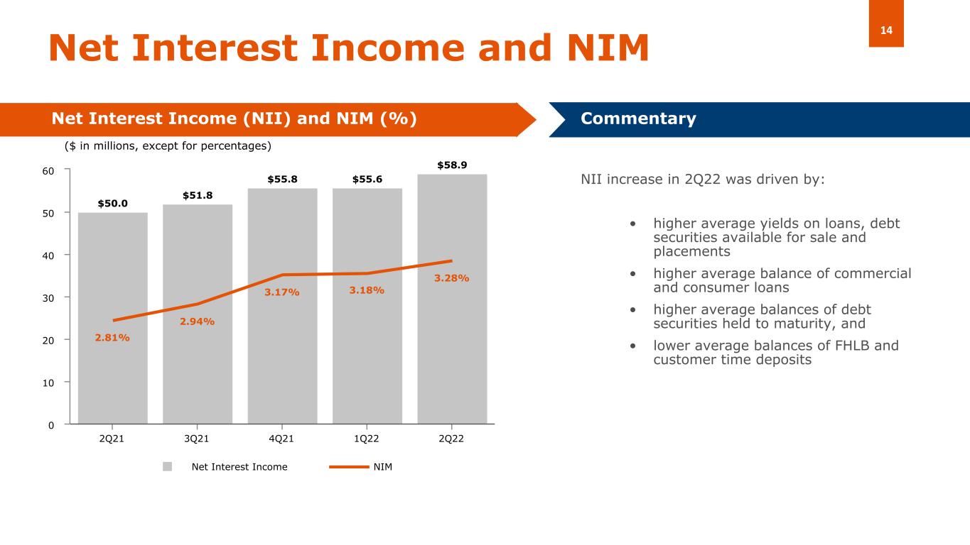 2022 年第 2 四半期の NII は、前年同期の 5560 万ドルから 330 万ドル(5.9%)増の 5890 万ドル、21 年第 2 四半期の 5000 万ドルから 900 万ドル(17.96%)増の 590 万ドルでした。前四半期比での増加は、主に以下の要因によるものです。(i) 貸付金、売却可能負債証券、プレースメントの平均利回りの上昇、(ii) 商業用および消費者ローンの平均残高の増加、 (iii) 満期保有負債証券の平均残高の増加、(iv) FHLB 貸付金および顧客の定期預金の平均残高の減少。これらの結果は、以下の要因によって一部相殺されました。(i)総預金と厚生労働省の立替金の平均コストの上昇、(ii)売却可能負債証券の平均残高の減少、(iii)2022 年3月に発行した劣後債に関する費用の四半期全体での影響、(iv)委託者定期預金の平均残高の上昇。利払い資産の平均利回りの上昇には、2022年に連邦準備制度理事会(FRB)が実施したインフレ管理措置(基準金利の合計150ベーシスポイントの引き上げ)の影響も含まれています。