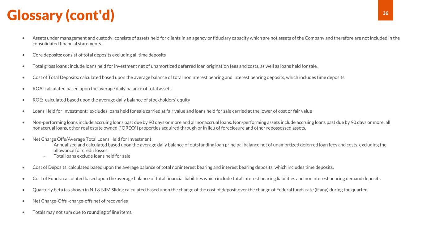 •Ratio for net charge-offs/average total loans held for investments: calculated based upon the average daily balance of outstanding loan principal balance net of unamortized deferred loan origination fees and costs, excluding the allowance for credit losses.
