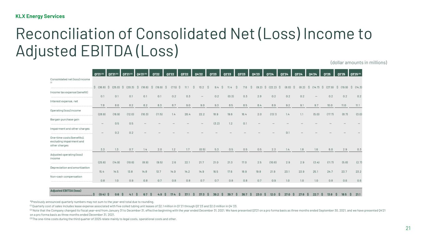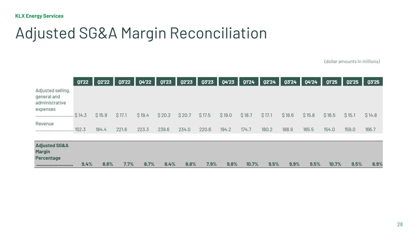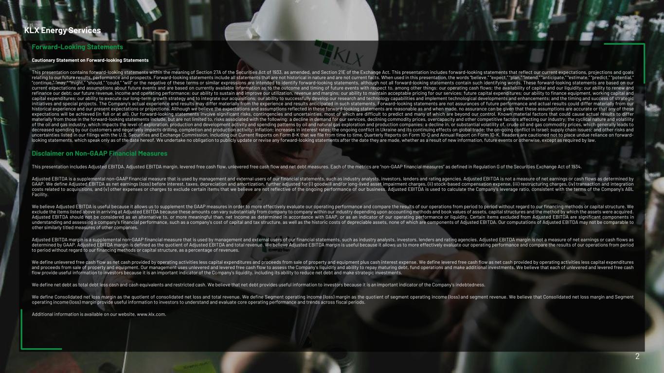Forward-Looking Statements Cautionary Statement on Forward-looking Statements This presentation contains forward-looking statements within the meaning of Section 27A of the Securities Act of 1933, as amended, and Section 21E of the Exchange Act. This presentation includes forward-looking statements that reflect our current expectations, projections and goals relating to our future results, performance and prospects. Forward-looking statements include all statements that are not historical in nature and are not current facts. When used in this presentation, the words “believe,” “expect,” “plan,” “intend,” “anticipate,” “estimate,” “predict,” “potential,” “continue,” “may,” “might,” “should,” “could,” “will” or the negative of these terms or similar expressions are intended to identify forward-looking statements, although not all forward-looking statements contain such identifying words. These forward-looking statements are based on our current expectations and assumptions about future events and are based on currently available information as to the outcome and timing of future events with respect to, among other things: our operating cash flows; the availability of capital and our liquidity; our ability to renew and refinance our debt; our future revenue, income and operating performance; our ability to sustain and improve our utilization, revenue and margins; our ability to maintain acceptable pricing for our services; future capital expenditures; our ability to finance equipment, working capital and capital expenditures; our ability to execute our long-term growth strategy and to integrate our acquisitions; our ability to successfully develop our research and technology capabilities and implement technological developments and enhancements; and the timing and success of strategic initiatives and special projects. The Company’s actual experience and results may differ materially from the experience and results anticipated in such statements. Forward-looking statements are not assurances of future performance and actual results could differ materially from our historical experience and our present expectations or projections. Although we believe the expectations and assumptions reflected in these forward-looking statements are reasonable as and when made, no assurance can be given that these assumptions are accurate or that any of these expectations will be achieved (in full or at all). Our forward-looking statements involve significant risks, contingencies and uncertainties, most of which are difficult to predict and many of which are beyond our control. Known material factors that could cause actual results to differ materially from those in the forward-looking statements include, but are not limited to, risks associated with the following: a decline in demand for our services, declining commodity prices, overcapacity and other competitive factors affecting our industry; the cyclical nature and volatility of the oil and gas industry, which impacts the level of exploration, production and development activity and spending patterns by oil and natural gas exploration and production companies; a decline in, or substantial volatility of, crude oil and gas commodity prices, which generally leads to decreased spending by our customers and negatively impacts drilling, completion and production activity; inflation; increases in interest rates; the ongoing conflict in Ukraine and its continuing effects on global trade; the on-going conflict in Israel; supply chain issues; and other risks and uncertainties listed in our filings with the U.S. Securities and Exchange Commission, including our Current Reports on Form 8-K that we file from time to time, Quarterly Reports on Form 10-Q and Annual Report on Form 10-K. Readers are cautioned not to place undue reliance on forward- looking statements, which speak only as of the date hereof. We undertake no obligation to publicly update or revise any forward-looking statements after the date they are made, whether as a result of new information, future events or otherwise, except as required by law. Disclaimer on Non-GAAP Financial Measures This presentation includes Adjusted EBITDA, Adjusted EBITDA margin, levered free cash flow, unlevered free cash flow and net debt measures. Each of the metrics are “non-GAAP financial measures” as defined in Regulation G of the Securities Exchange Act of 1934. Adjusted EBITDA is a supplemental non-GAAP financial measure that is used by management and external users of our financial statements, such as industry analysts, investors, lenders and rating agencies. Adjusted EBITDA is not a measure of net earnings or cash flows as determined by GAAP. We define Adjusted EBITDA as net earnings (loss) before interest, taxes, depreciation and amortization, further adjusted for (i) goodwill and/or long-lived asset impairment charges, (ii) stock-based compensation expense, (iii) restructuring charges, (iv) transaction and integration costs related to acquisitions, and (v) other expenses or charges to exclude certain items that we believe are not reflective of the ongoing performance of our business. Adjusted EBITDA is used to calculate the Company’s leverage ratio, consistent with the terms of the Company’s ABL Facility. We believe Adjusted EBITDA is useful because it allows us to supplement the GAAP measures in order to more effectively evaluate our operating performance and compare the results of our operations from period to period without regard to our financing methods or capital structure. We exclude the items listed above in arriving at Adjusted EBITDA because these amounts can vary substantially from company to company within our industry depending upon accounting methods and book values of assets, capital structures and the method by which the assets were acquired. Adjusted EBITDA should not be considered as an alternative to, or more meaningful than, net inco