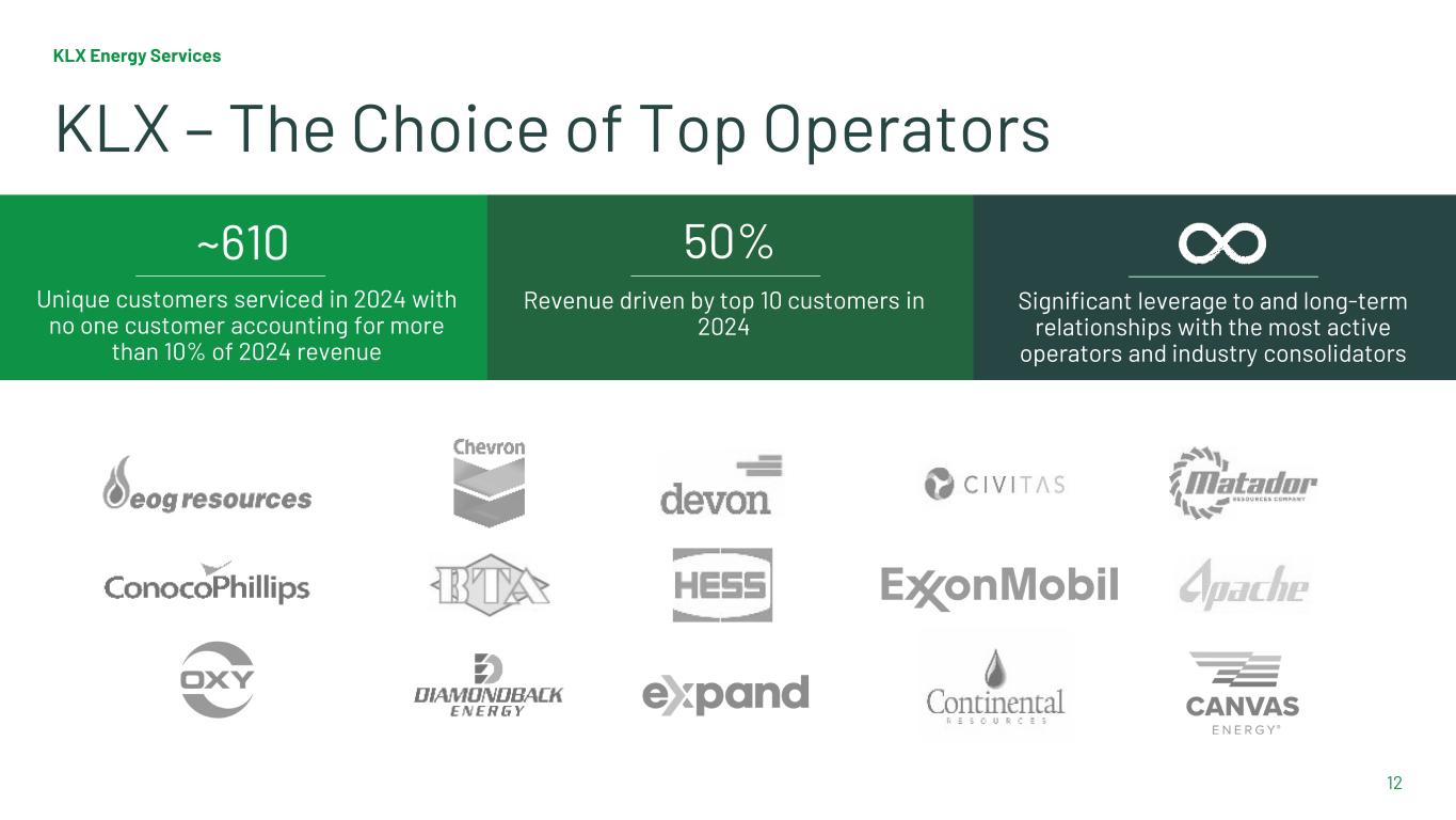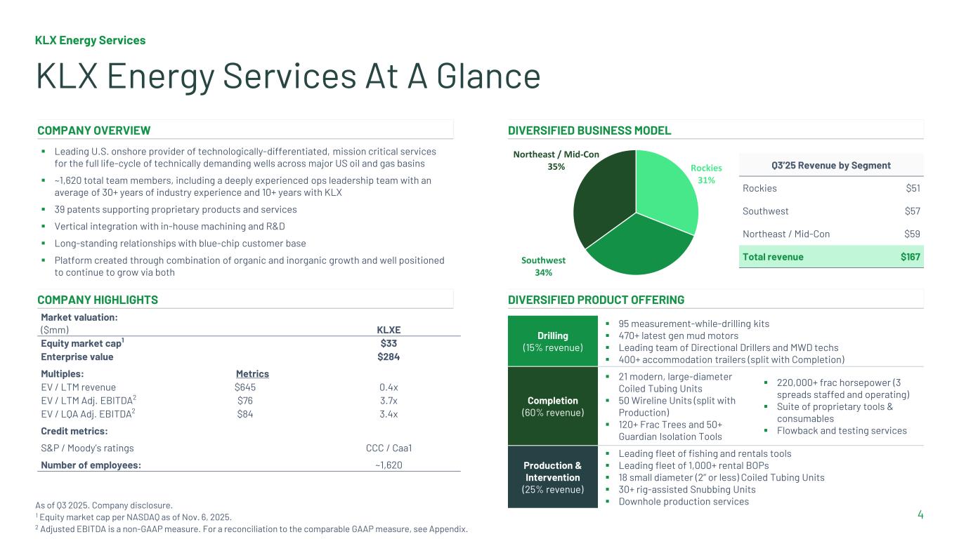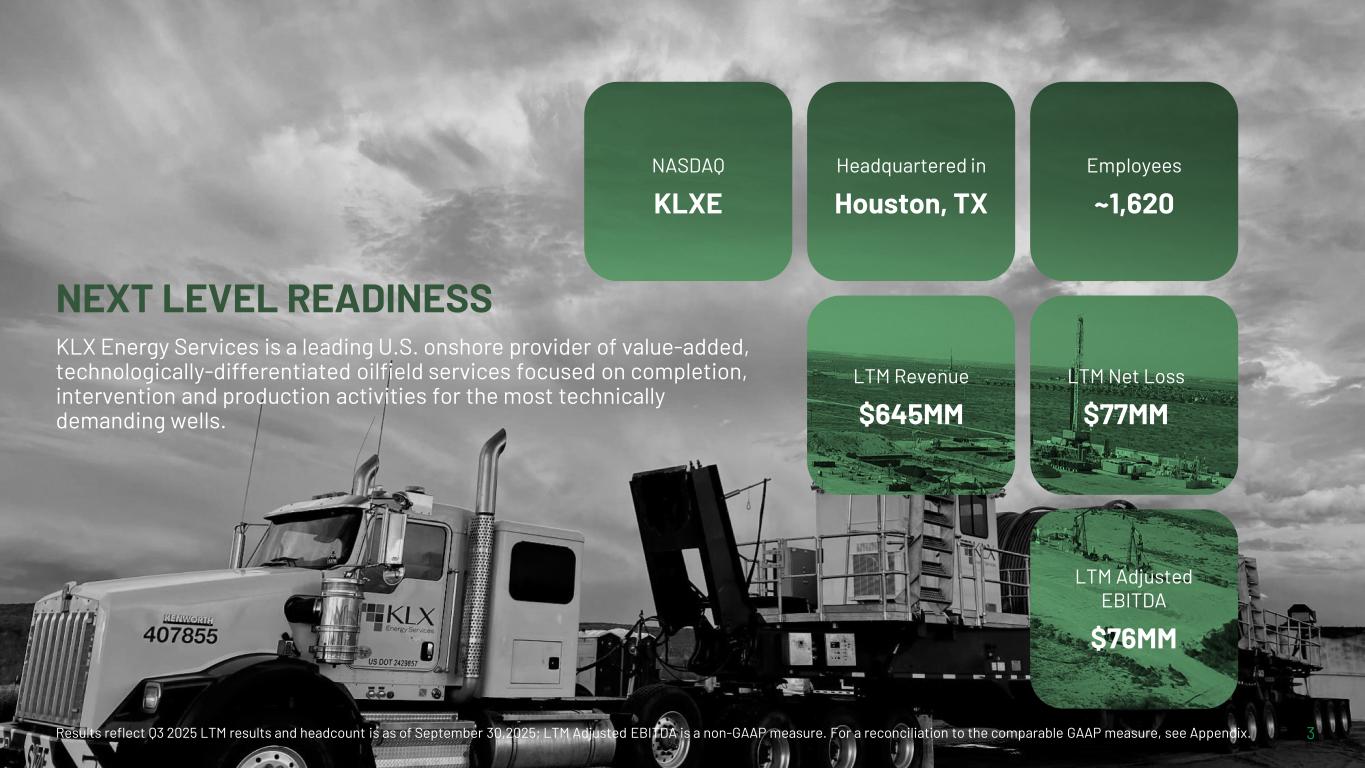 3 NEXT LEVEL READINESS KLX Energy Services is a leading U.S. onshore provider of value-added, technologically-differentiated oilfield services focused on completion, intervention and production activities for the most technically demanding wells. NASDAQ KLXE Headquartered in Houston, TX Employees ~1,620 LTM Revenue $645MM LTM Net Loss $77MM LTM Adjusted EBITDA $76MM Results reflect Q3 2025 LTM results and headcount is as of September 30,2025; LTM Adjusted EBITDA is a non-GAAP measure. For a reconciliation to the comparable GAAP measure, see Appendix.
