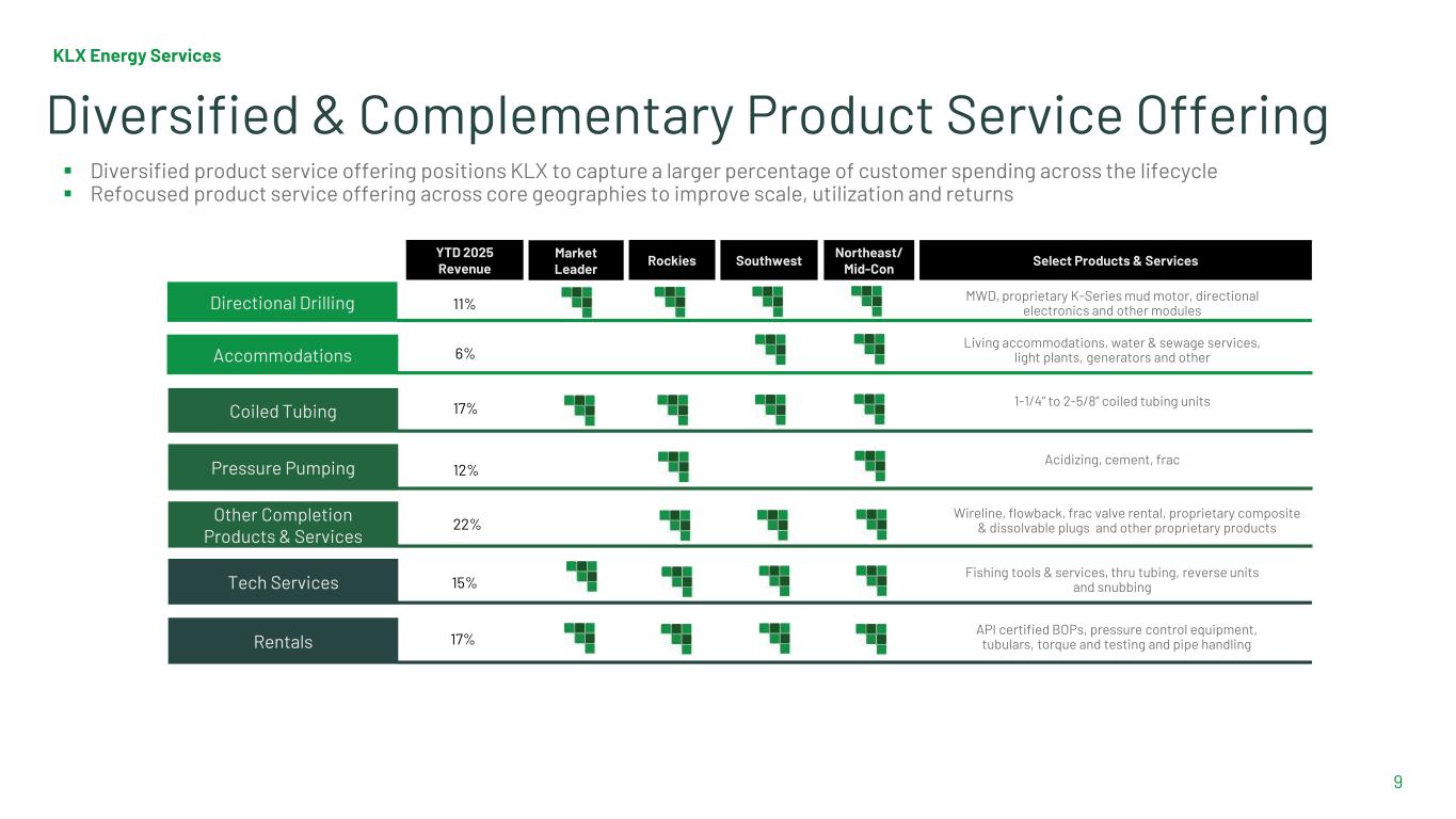 KLX Energy Services 8 Areas of Operation Revenue contribution based on Q3 2025 results. 1 Gas contribution includes Haynesville and Marcellus activity as primary dry gas exposure Headquarters Technology Center Southwest Operation Facilities Rockies Operation Facilities Northeast / Mid-Con Operation Facilities Rockies 31% Northeast/Mid-Con 35% Southwest 34% YTD 2025 REVENUE SPLIT BY COMMODITY1 Oil 85% Natural Gas 15%