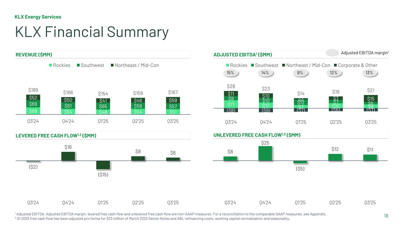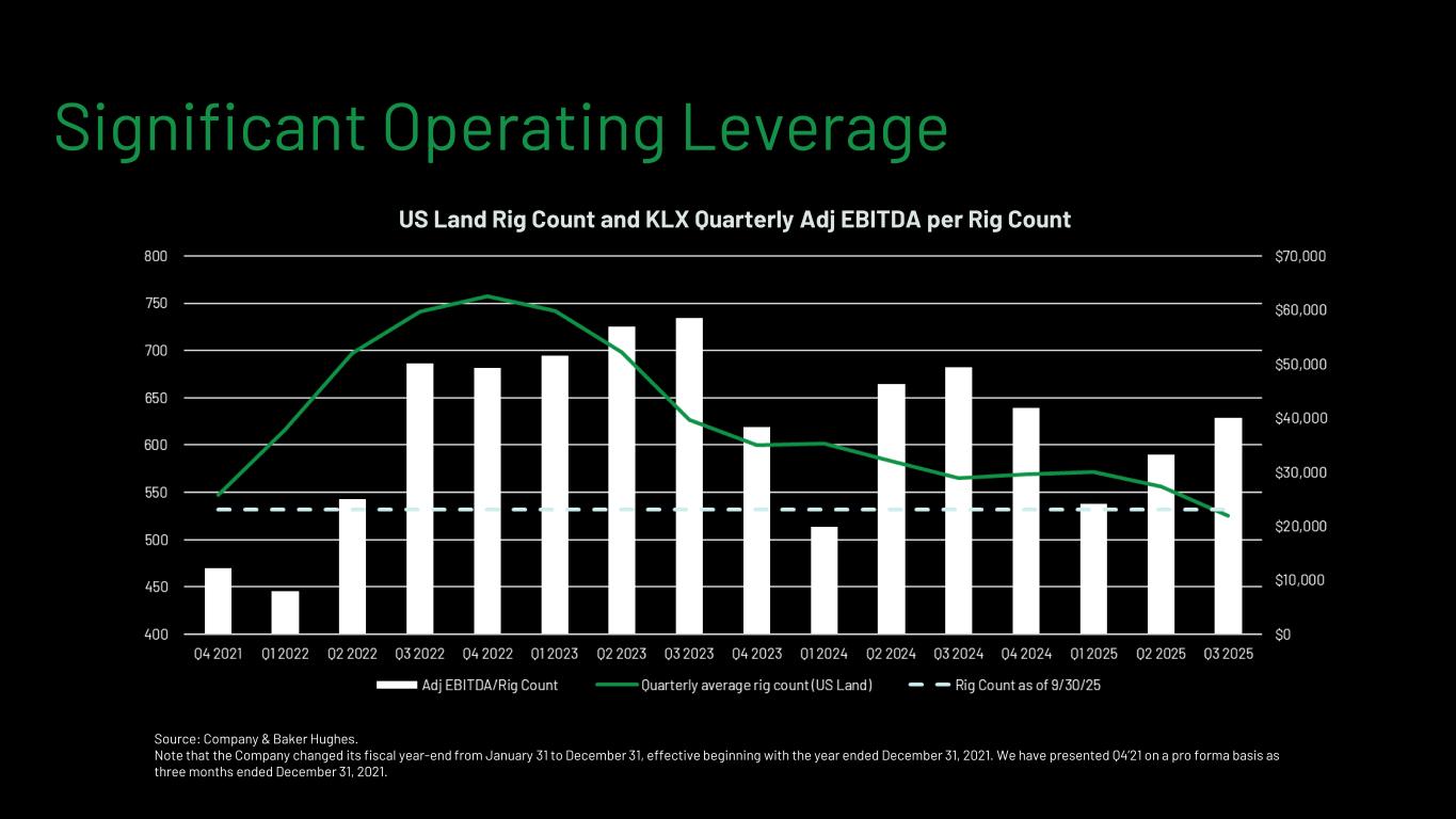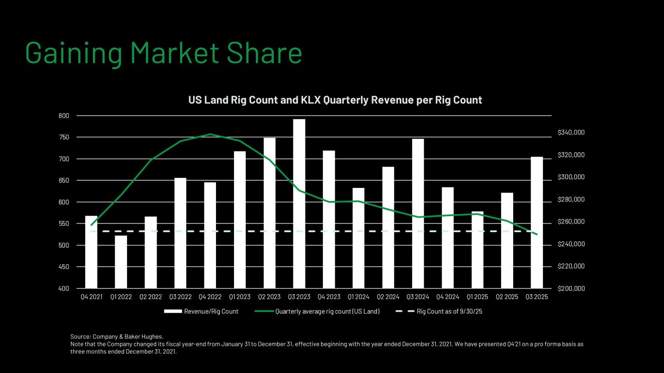 KLX Energy Services 4 KLX Energy Services At A Glance As of Q3 2025. Company disclosure. 1 Equity market cap per NASDAQ as of Nov. 6, 2025. 2 Adjusted EBITDA is a non-GAAP measure. For a reconciliation to the comparable GAAP measure, see Appendix. COMPANY OVERVIEW DIVERSIFIED BUSINESS MODEL  Leading U.S. onshore provider of technologically-differentiated, mission critical services for the full life-cycle of technically demanding wells across major US oil and gas basins  ~1,620 total team members, including a deeply experienced ops leadership team with an average of 30+ years of industry experience and 10+ years with KLX  39 patents supporting proprietary products and services  Vertical integration with in-house machining and R&D  Long-standing relationships with blue-chip customer base  Platform created through combination of organic and inorganic growth and well positioned to continue to grow via both Rockies 31% Southwest 34% Northeast / Mid-Con 35% Q3’25 Revenue by Segment Rockies $51 Southwest $57 Northeast / Mid-Con $59 Total revenue $167 COMPANY HIGHLIGHTS DIVERSIFIED PRODUCT OFFERING Market valuation: ($mm) KLXE Equity market cap1 $33 Enterprise value $284 Multiples: Metrics EV / LTM revenue $645 0.4x EV / LTM Adj. EBITDA2 $76 3.7x EV / LQA Adj. EBITDA2 $84 3.4x Credit metrics: S&P / Moody’s ratings CCC / Caa1 Number of employees: ~1,620 Drilling (15% revenue)  95 measurement-while-drilling kits  470+ latest gen mud motors  Leading team of Directional Drillers and MWD techs  400+ accommodation trailers (split with Completion) Completion (60% revenue)  21 modern, large-diameter Coiled Tubing Units  50 Wireline Units (split with Production)  120+ Frac Trees and 50+ Guardian Isolation Tools  220,000+ frac horsepower (3 spreads staffed and operating)  Suite of proprietary tools & consumables  Flowback and testing services Production & Intervention (25% revenue)  Leading fleet of fishing and rentals tools  Leading fleet of 1,000+ rental BOPs  18 small diameter (2’’ or less) Coiled Tubing Units  30+ rig-assisted Snubbing Units  Downhole production services