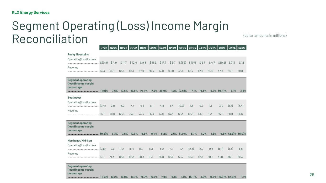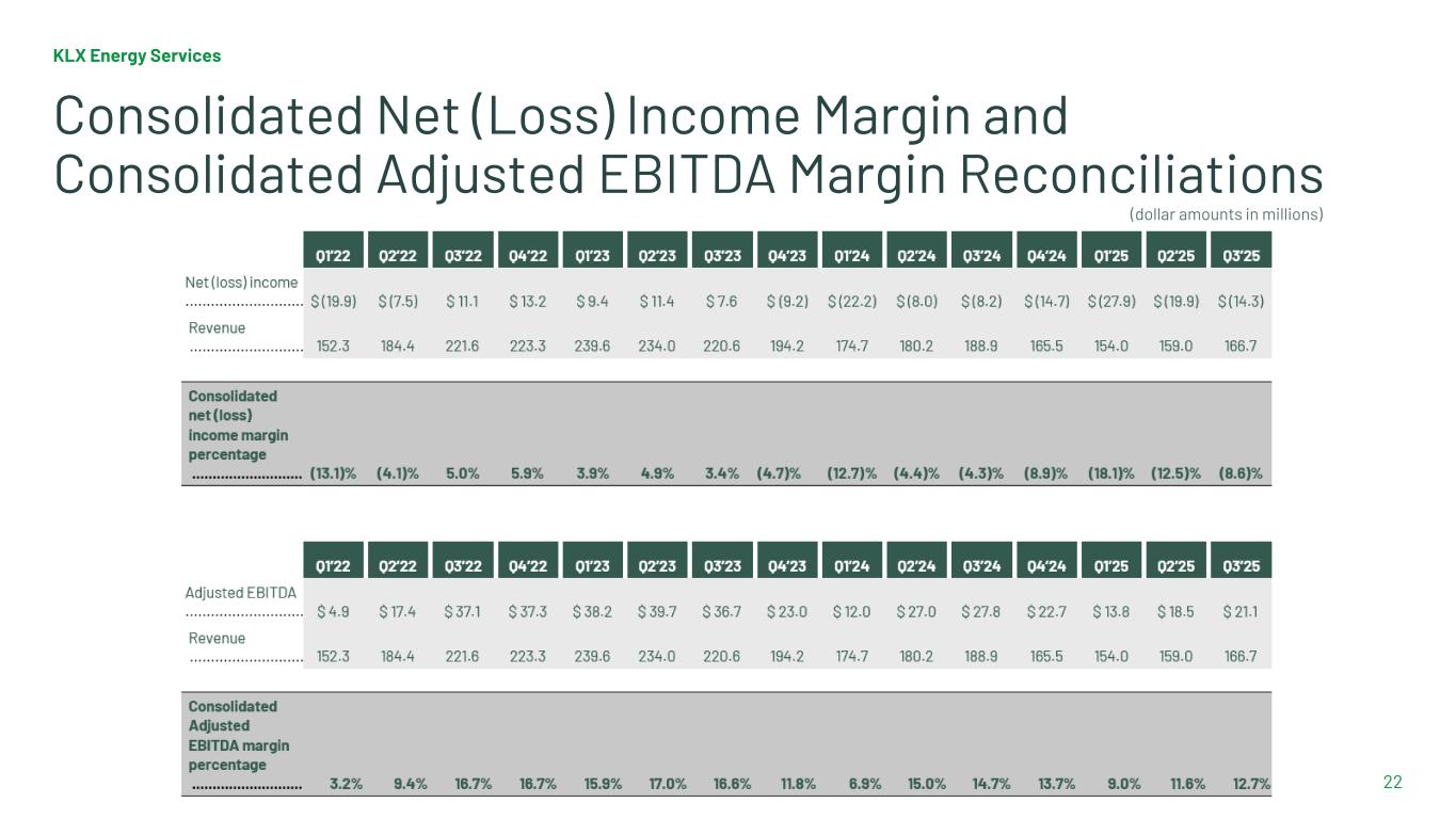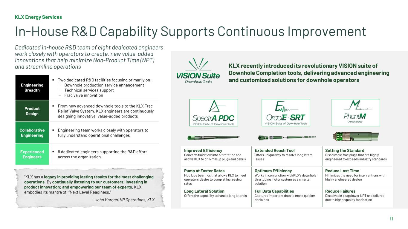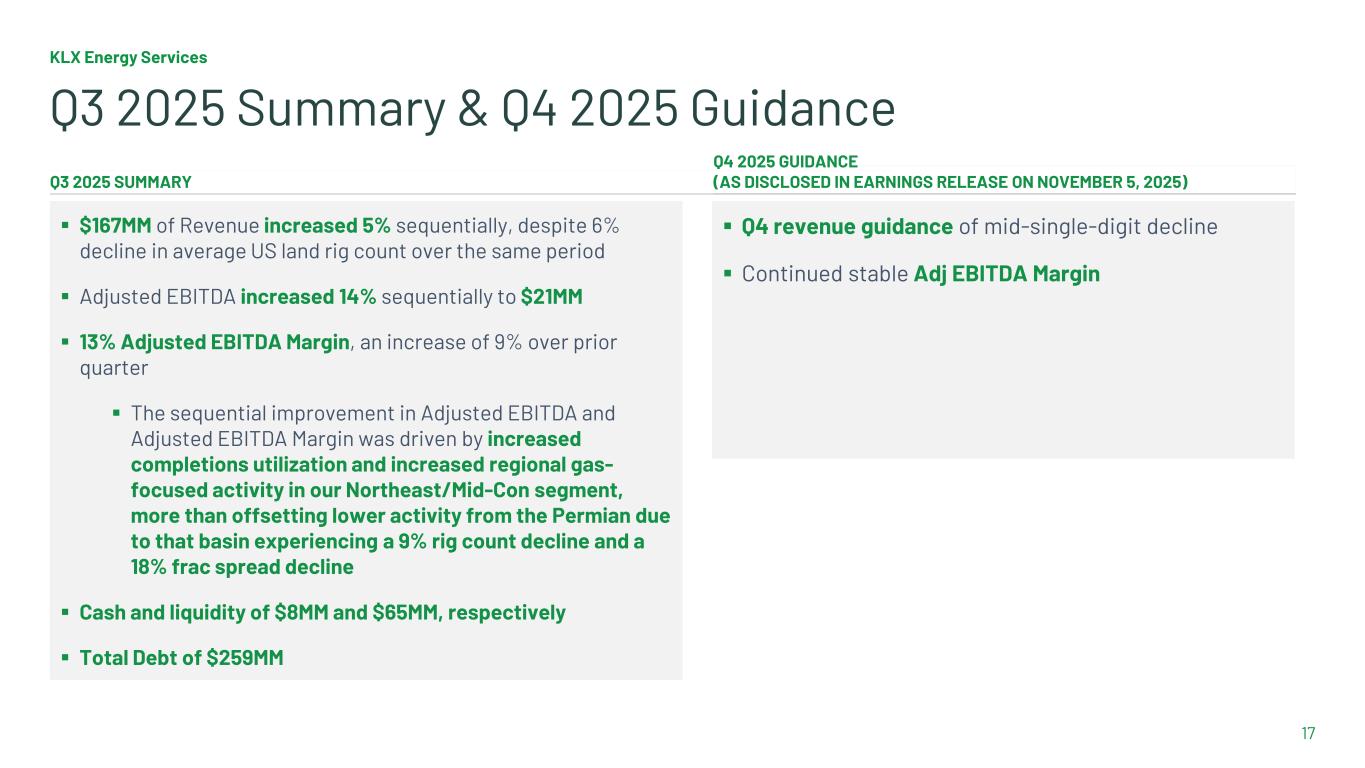 KLX Energy Services 4 KLX Energy Services At A Glance As of Q3 2025. Company disclosure. 1 Equity market cap per NASDAQ as of Nov. 6, 2025. 2 Adjusted EBITDA is a non-GAAP measure. For a reconciliation to the comparable GAAP measure, see Appendix. COMPANY OVERVIEW DIVERSIFIED BUSINESS MODEL  Leading U.S. onshore provider of technologically-differentiated, mission critical services for the full life-cycle of technically demanding wells across major US oil and gas basins  ~1,620 total team members, including a deeply experienced ops leadership team with an average of 30+ years of industry experience and 10+ years with KLX  39 patents supporting proprietary products and services  Vertical integration with in-house machining and R&D  Long-standing relationships with blue-chip customer base  Platform created through combination of organic and inorganic growth and well positioned to continue to grow via both Rockies 31% Southwest 34% Northeast / Mid-Con 35% Q3’25 Revenue by Segment Rockies $51 Southwest $57 Northeast / Mid-Con $59 Total revenue $167 COMPANY HIGHLIGHTS DIVERSIFIED PRODUCT OFFERING Market valuation: ($mm) KLXE Equity market cap1 $33 Enterprise value $284 Multiples: Metrics EV / LTM revenue $645 0.4x EV / LTM Adj. EBITDA2 $76 3.7x EV / LQA Adj. EBITDA2 $84 3.4x Credit metrics: S&P / Moody’s ratings CCC / Caa1 Number of employees: ~1,620 Drilling (15% revenue)  95 measurement-while-drilling kits  470+ latest gen mud motors  Leading team of Directional Drillers and MWD techs  400+ accommodation trailers (split with Completion) Completion (60% revenue)  21 modern, large-diameter Coiled Tubing Units  50 Wireline Units (split with Production)  120+ Frac Trees and 50+ Guardian Isolation Tools  220,000+ frac horsepower (3 spreads staffed and operating)  Suite of proprietary tools & consumables  Flowback and testing services Production & Intervention (25% revenue)  Leading fleet of fishing and rentals tools  Leading fleet of 1,000+ rental BOPs  18 small diameter (2’’ or less) Coiled Tubing Units  30+ rig-assisted Snubbing Units  Downhole production services