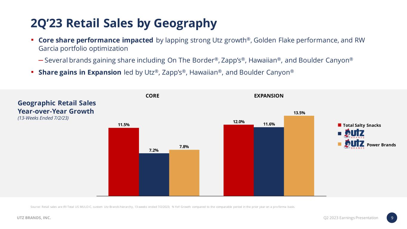 For the 13-week period ended July 2, 2023, the Company’s retail sales, as measured by Circana (formerly IRI) MULO-C, increased 8.8% versus the prior-year period and the Company’s Power Brands’ retail sales increased 9.9% versus the prior-year period(1). Power Brands’ retail sales growth versus the prior-year period was led by Utz®, On The Border®, Zapp’s®, Hawaiian®, and Boulder Canyon®. The Company’s Foundation Brands’ retail sales increased 1.5%(2) versus the prior year period.