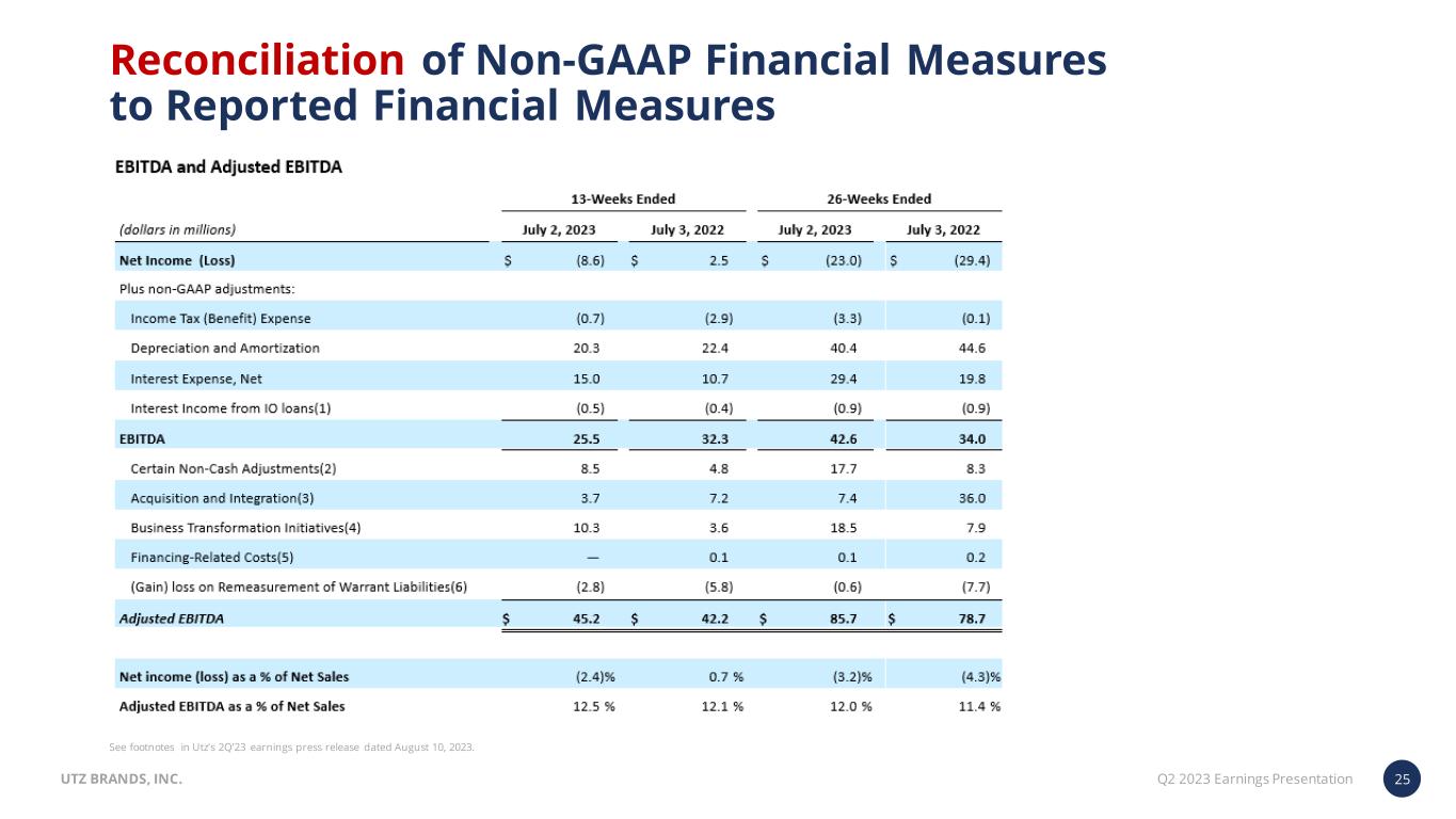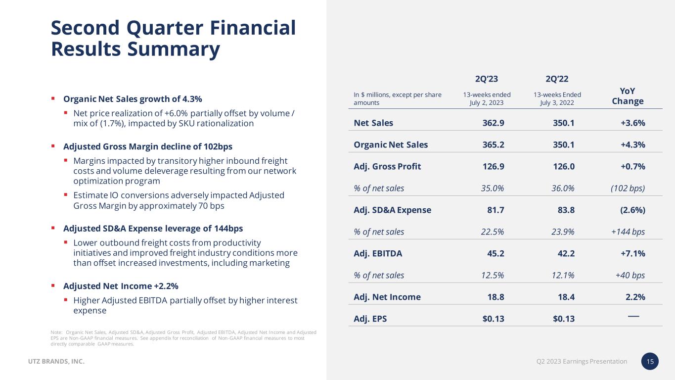 Adjusted Net Income in the quarter increased 2.2% to $18.8 million compared to $18.4 million in the second quarter of 2022 and Adjusted Earnings per Share of $0.13 was consistent with the prior year period. Adjusted EBITDA increased 7.1% to $45.2 million, or 12.5% as a percentage of net sales, compared to Adjusted EBITDA of $42.2 million, or 12.1% as a percentage of net sales, in the prior year period.