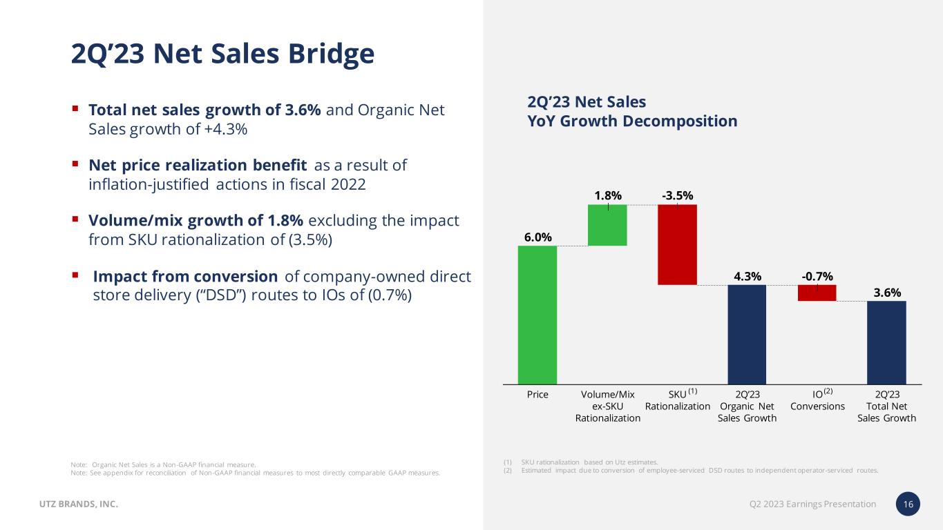 Organic Net Sales growth was driven by the flow through of pricing actions that were taken in fiscal 2022 in response to inflationary pressures which account for a 6.0% increase in net sales, partially offset by volume/mix declines of (1.7%). The volume decline was primarily due to the Company’s ongoing SKU rationalization program focused on reducing lower margin private label and certain partner brands. The Company estimates this program impacted volumes in the second quarter of 2023 by approximately (3.5%). Excluding the impact from SKU rationalization, the Company estimates that volume/mix would have increased 1.8% in the second quarter of 2023 versus the prior year period.