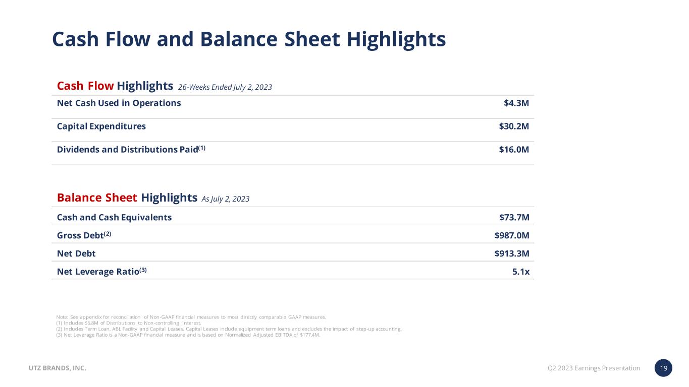Hanover, PA –August 10, 2023 – Utz Brands, Inc. (NYSE: UTZ) (“Utz” or the “Company”), a leading U.S. manufacturer of branded salty snacks, today reported financial results for the Company’s second fiscal quarter ended July 2, 2023.