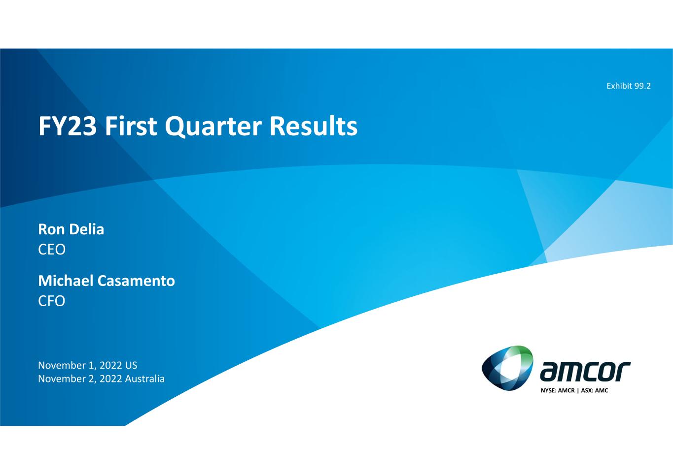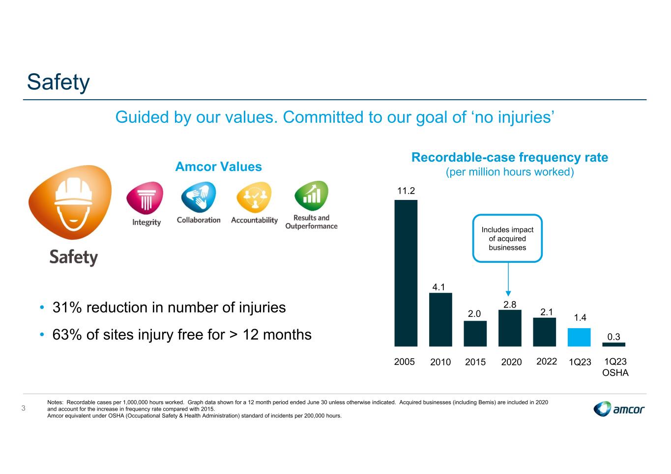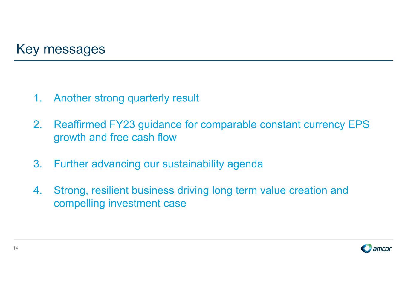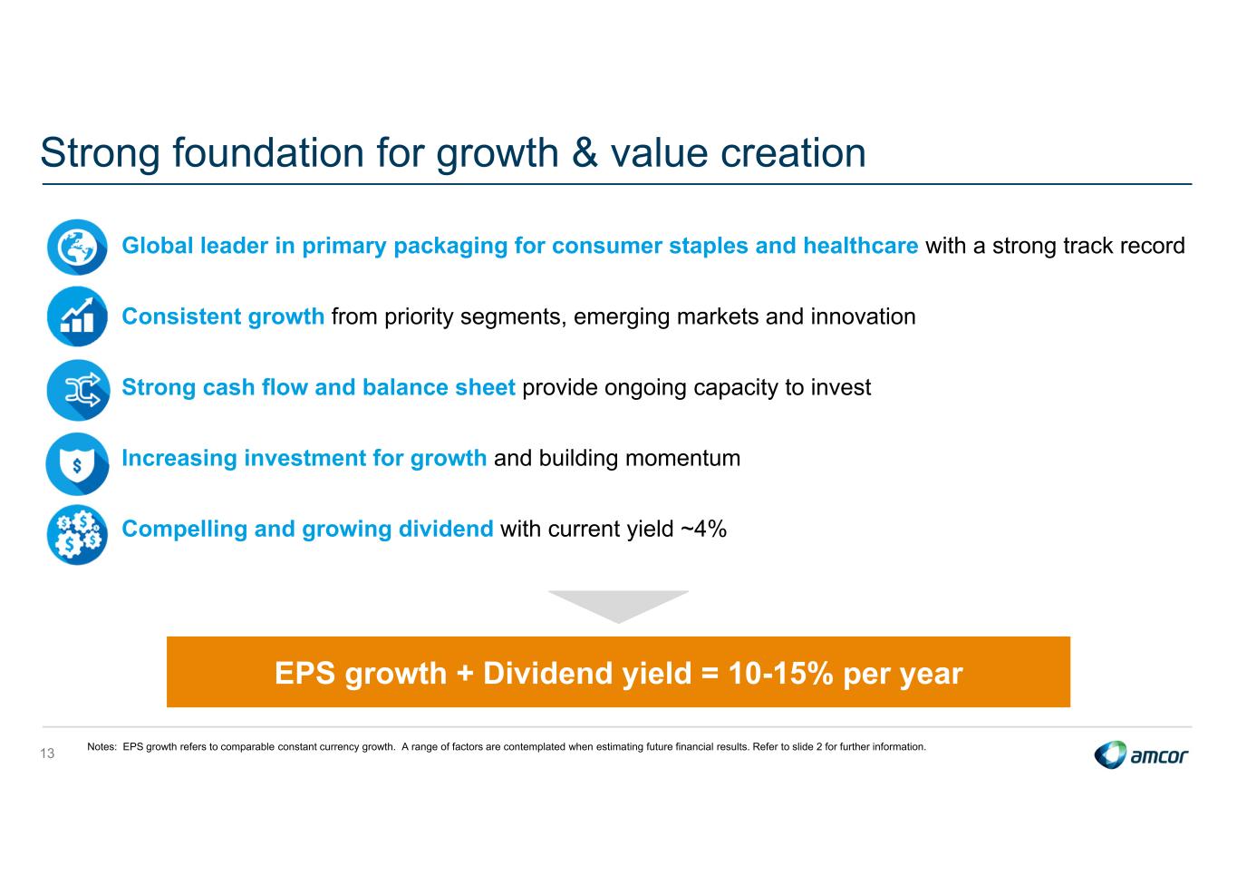 We remain focused on executing against our strategy for long term growth. Amcor consistently generates significant annual cash flow, providing substantial capacity to reinvest for future growth and to return cash to shareholders through an attractive and growing dividend and regular share repurchases. We believe the strength of our underlying business, proven execution capabilities and capital allocation framework position us well to deliver strong and consistent value for shareholders and supports our compelling investment case.”