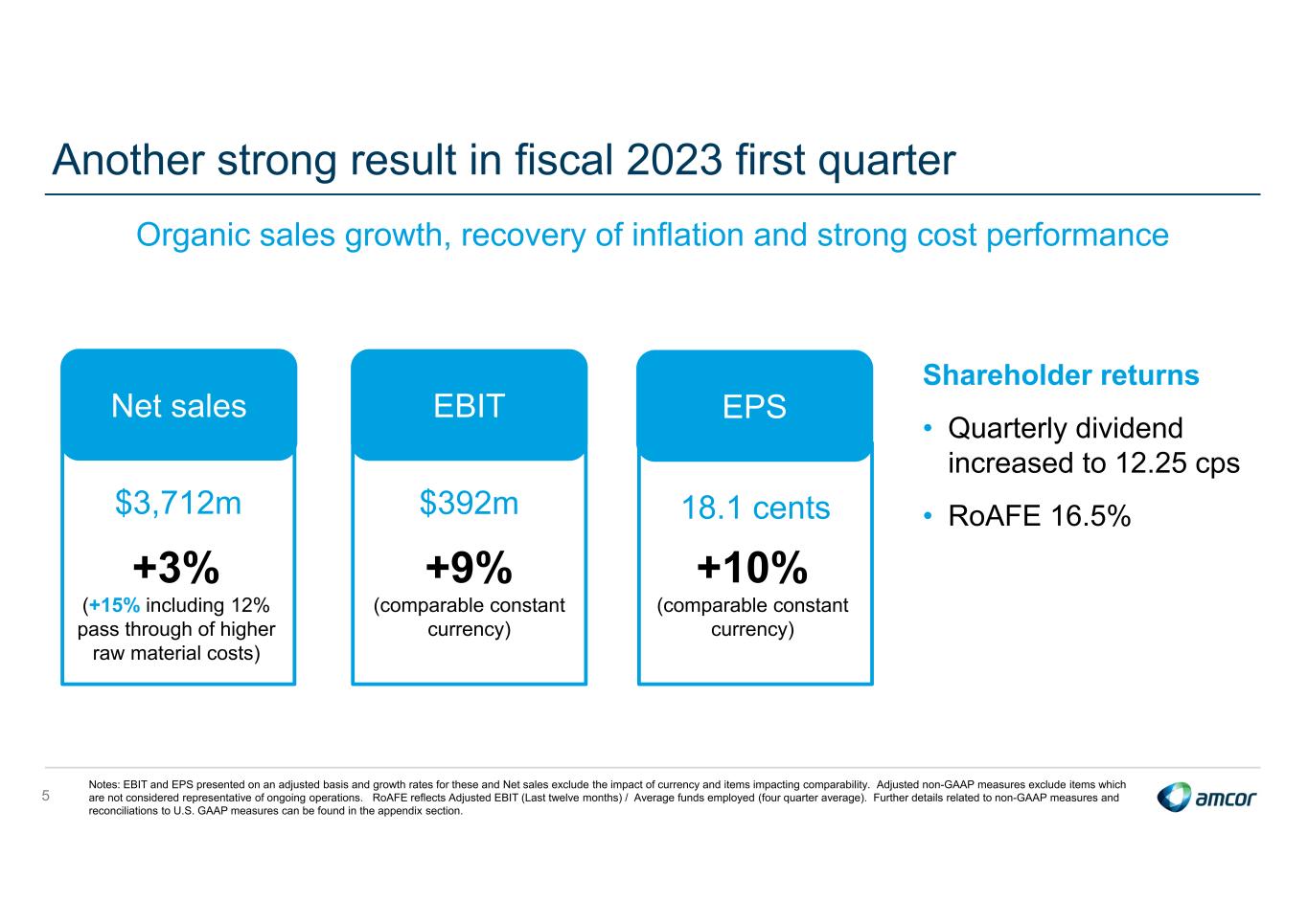 The result demonstrates the relative stability of our end market exposures, our relentless focus on recovering higher raw material costs and general inflation, and our proactive approach to driving costs out of the business. Our consistent execution has enabled us to generate strong organic earnings growth in a volatile and challenging operating environment and gives us confidence in our ability to achieve our adjusted EPS and free cash flow outlook for the FY23 year.