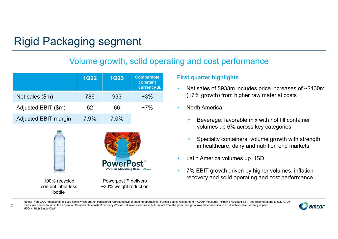 Amcor CEO Ron Delia said: “Amcor delivered a strong first quarter highlighted by solid operating leverage with 3% organic sales growth driving a 10% increase in adjusted earnings per share on a comparable constant currency basis. Both the Flexibles and Rigid Packaging segments contributed to adjusted EBIT growth of 9% on a comparable constant currency basis.