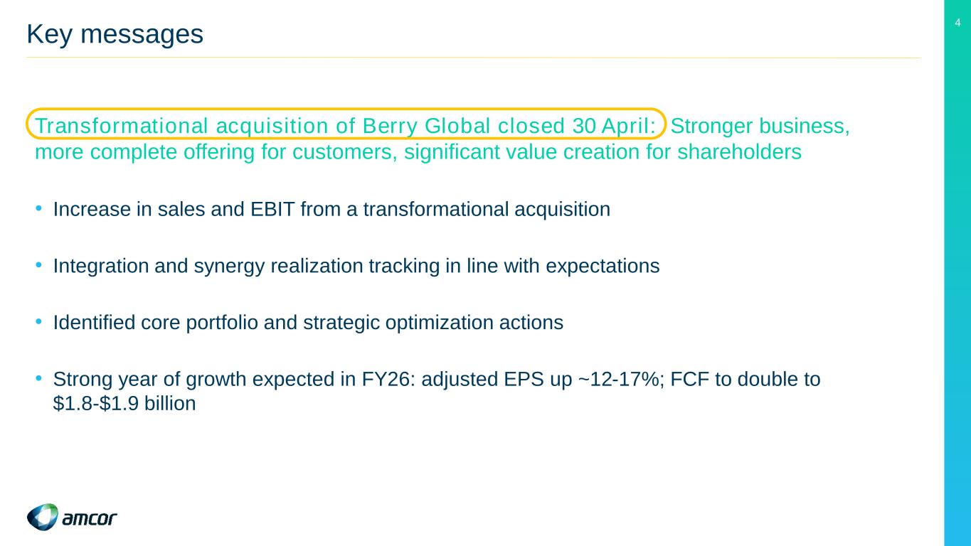 | 今期はアムコーにとって重要な節目となりました。ベリーグローバルの買収は、顧客と株主のために大きな価値を創造する我々の能力を変革するものです。このことは、2026年度には調整後EPSが12~17%の高い伸びを示し、フリーキャッシュフローが18~19億ドルと大幅に増加するとの予想に明確に反映されています。顧客からのフィードバックは好意的で、すでにこの統合に直結するビジネスの獲得につながっています。統合作業は初日から開始され、チームの素晴らしい進捗を誇りに思います。シナジー目標に対して順調に推移しており、期待通りの成果を上げています。さらに、戦略的ポートフォリオの見直しを通じて、アムコアの200億ドルのコア・ポートフォリオである栄養と健康に関する消費者向けパッケージングとディスペンシング・ソリューションを特定し、魅力的なカテゴリーへの焦点をさらに研ぎ澄まし、より速い成長を促進するための最適化アクションを実施しました。私たちの努力には共通の目的があります。それは、お客様から選ばれるグローバル・パッケージング・パートナーとなり、より高いレベルの安定した有機的成長と株主価値を提供する、より強力なビジネスを創造することです。 |
