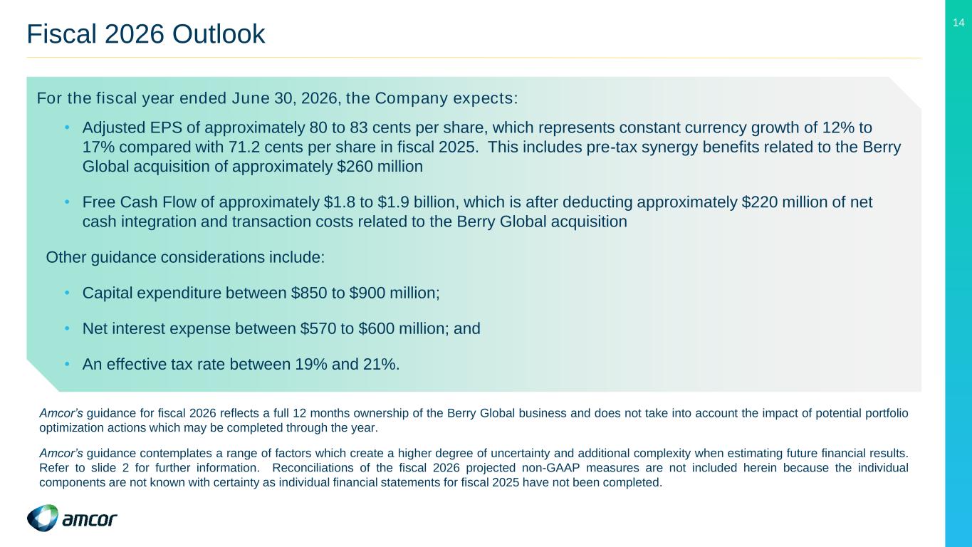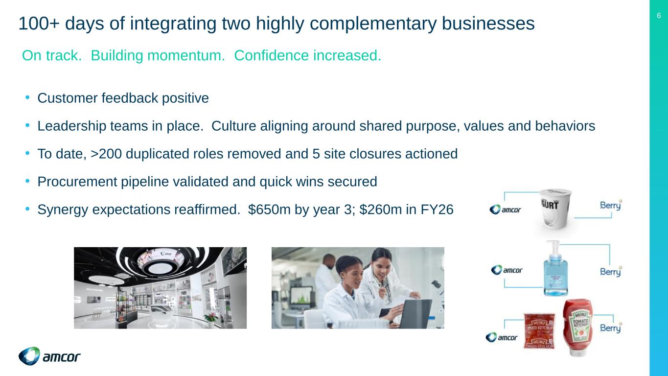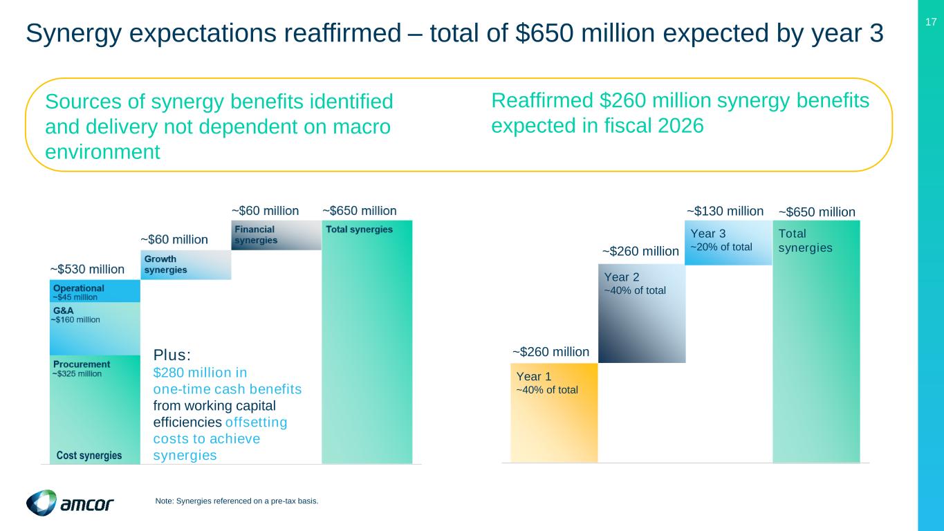 アムコーは、2028会計年度末までに、すでに発表したシナジー効果総額6億5,000万ドル(税引前)を達成する態勢が整っていると考えている。統合は予想通りに進んでおり、Amcorのチームは2026会計年度に2億6,000万ドル(税引前)のシナジー効果を達成する予定である。2025年4月30日の取引完了日を考慮すると、2025会計年度の最後の2ヶ月間にもたらされたシナジー効果は重要なものではありません。