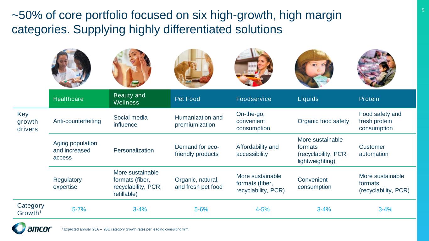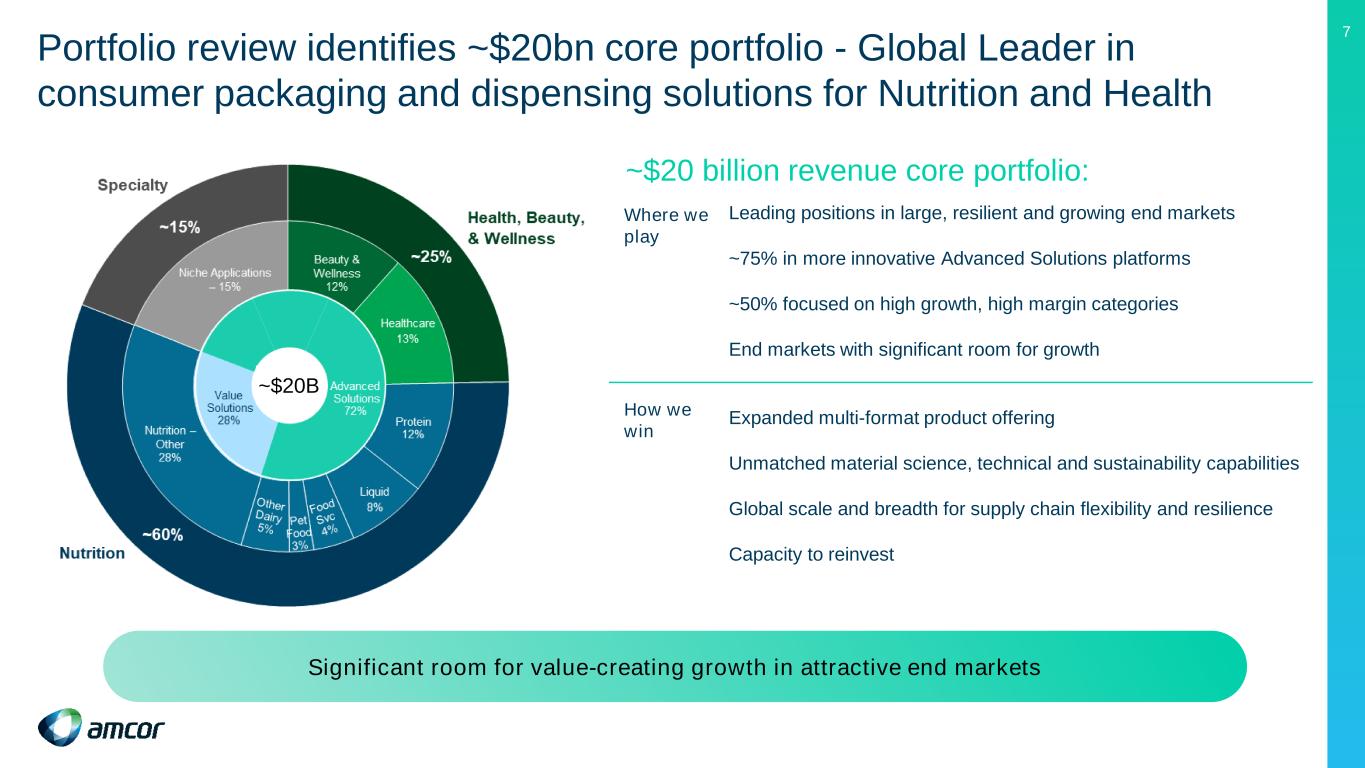 すでにお伝えしたように、ベリーグローバルの買収は、同社にとって新たに統合されたポートフォリオを見直すまたとない機会となった。この見直しを通じて、同社は栄養と健康に関する消費者向けパッケージングとディスペンシング・ソリューションに関する200億ドルの中核ポートフォリオを特定した。このコア・ポートフォリオは、大規模で弾力性があり、成長を続ける健康、美容、ウェルネス、栄養、特殊な最終市場において、アムコアがグローバルなサプライチェーンの柔軟性、革新的で高価値なソリューションの拡張されたマルチフォーマット製品、大きな成長余地を有する主要なポジションで構成されている。