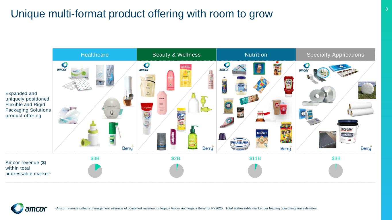 この変革的な買収により、Amcorは、栄養と健康に関する消費者向けパッケージングとディスペンシング・ソリューションのグローバル・リーダーとしての地位を確立し、顧客と消費者の持続可能性への願望を満たす独自の材料科学とイノベーション能力を持つことになります。複数の新たな成長機会と2028年度までの6億5,000万ドルのシナジー効果により、Amcorは顧客と株主に短期的・長期的に大きな価値を提供できる体制が整いました。