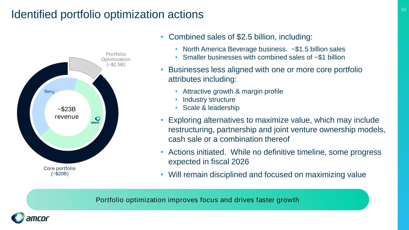 また、15億ドルの北米飲料事業や約10億ドルの小規模事業など、中核ポートフォリオとの整合性が低い年間売上高合計約25億ドルの事業も特定した。Amcorは、各事業の価値を最大化するための選択肢を模索しており、再編、パートナーシップや合弁事業の所有モデル、現金売却、またはそれらの組み合わせを含む可能性がある。これらの最適化策により、これらの事業への集中を強化し、コア・ポートフォリオを確保し、より安定した有機的成長を促進し、株主に大きな価値を創出することができると考えている。