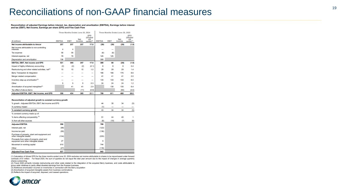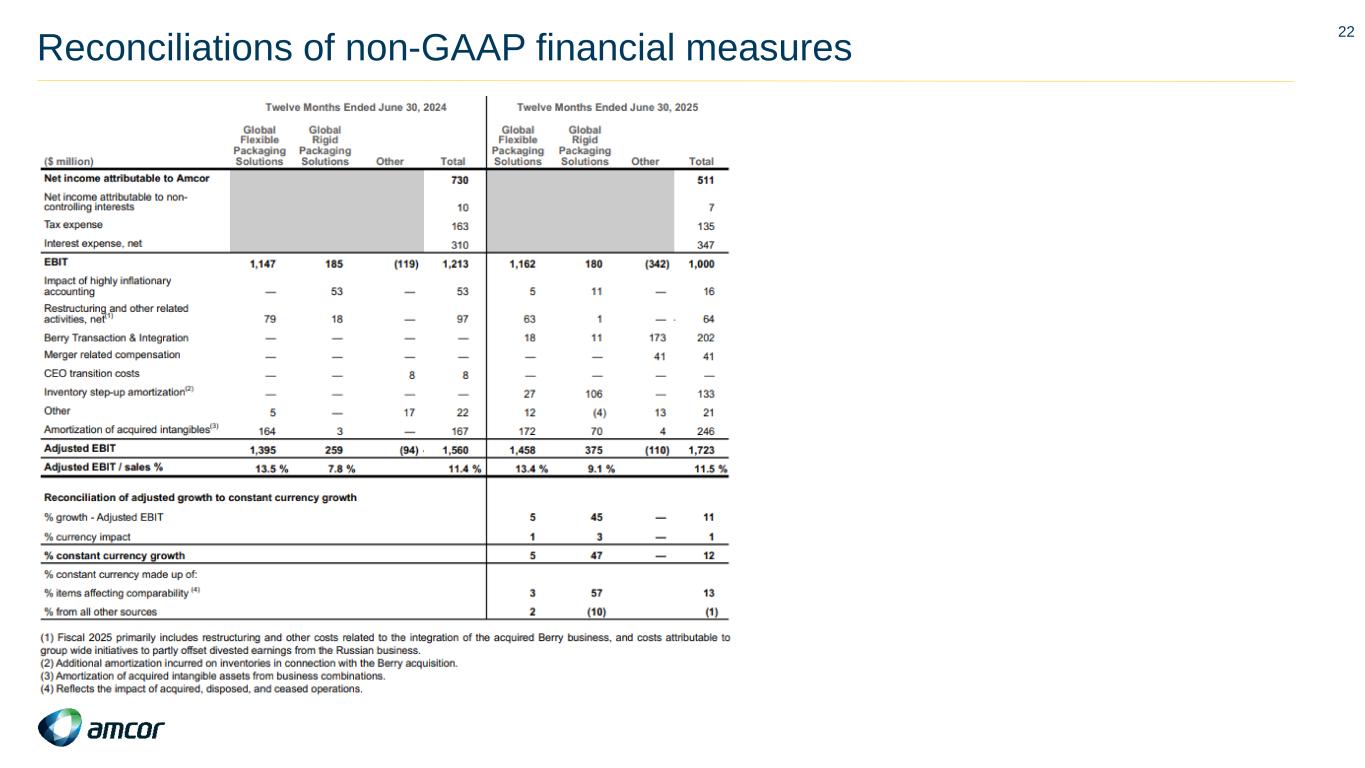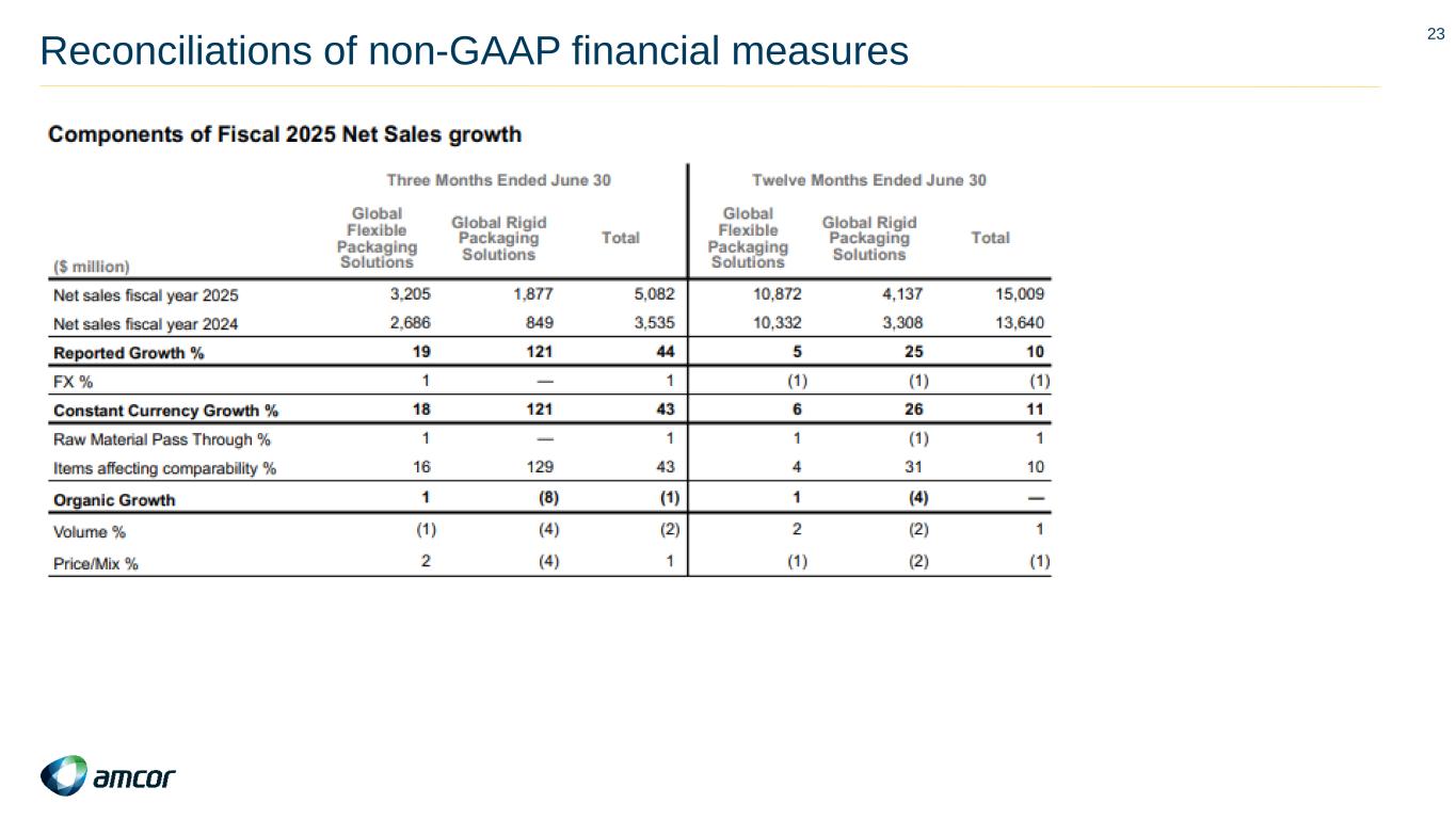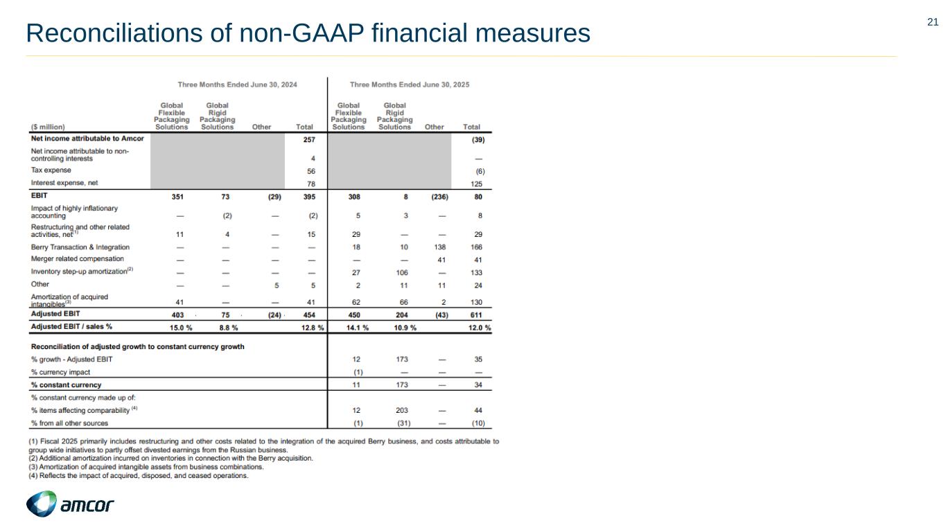 (2) 2025年4月30日にAmcorとBerry Globalの経営統合が完了したため、本書中の2025年6月30日に終了した3ヶ月間の業績には、別段の記載がない限り、2025年4月のレガシーBerry Global事業の業績は含まれていません。2025年6月30日に終了した12ヶ月間の業績には、2024年7月から2025年4月までのレガシー・ベリー・グローバル事業の業績は含まれておりません。