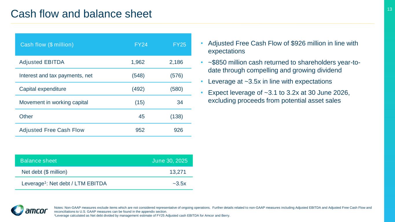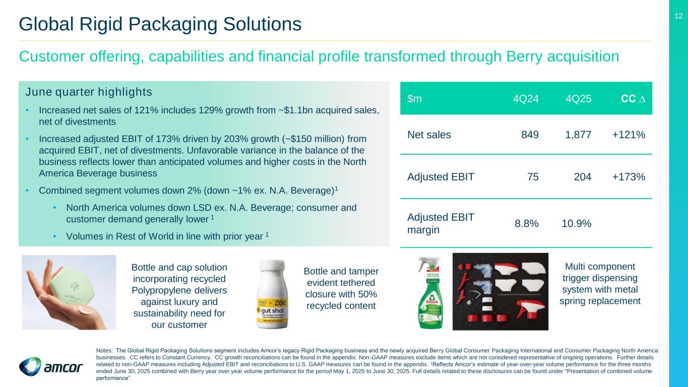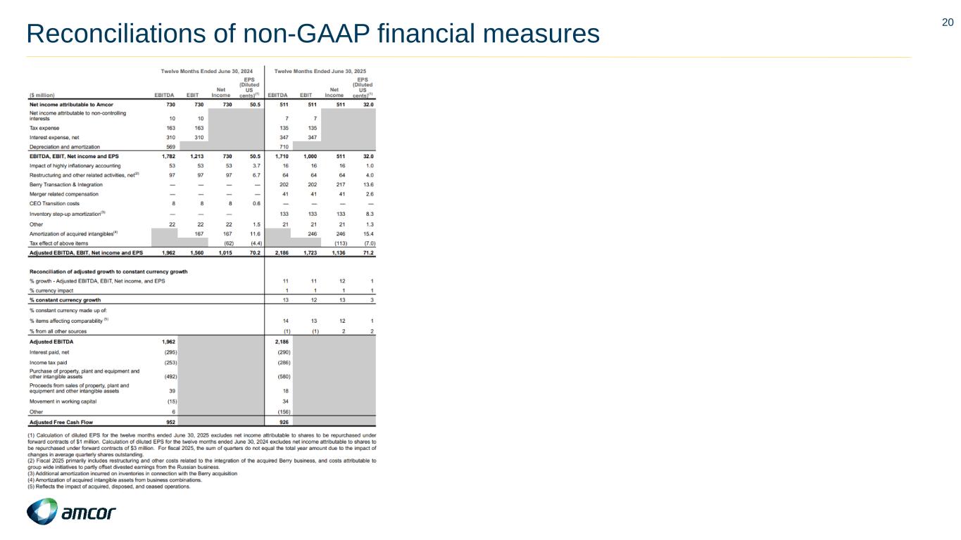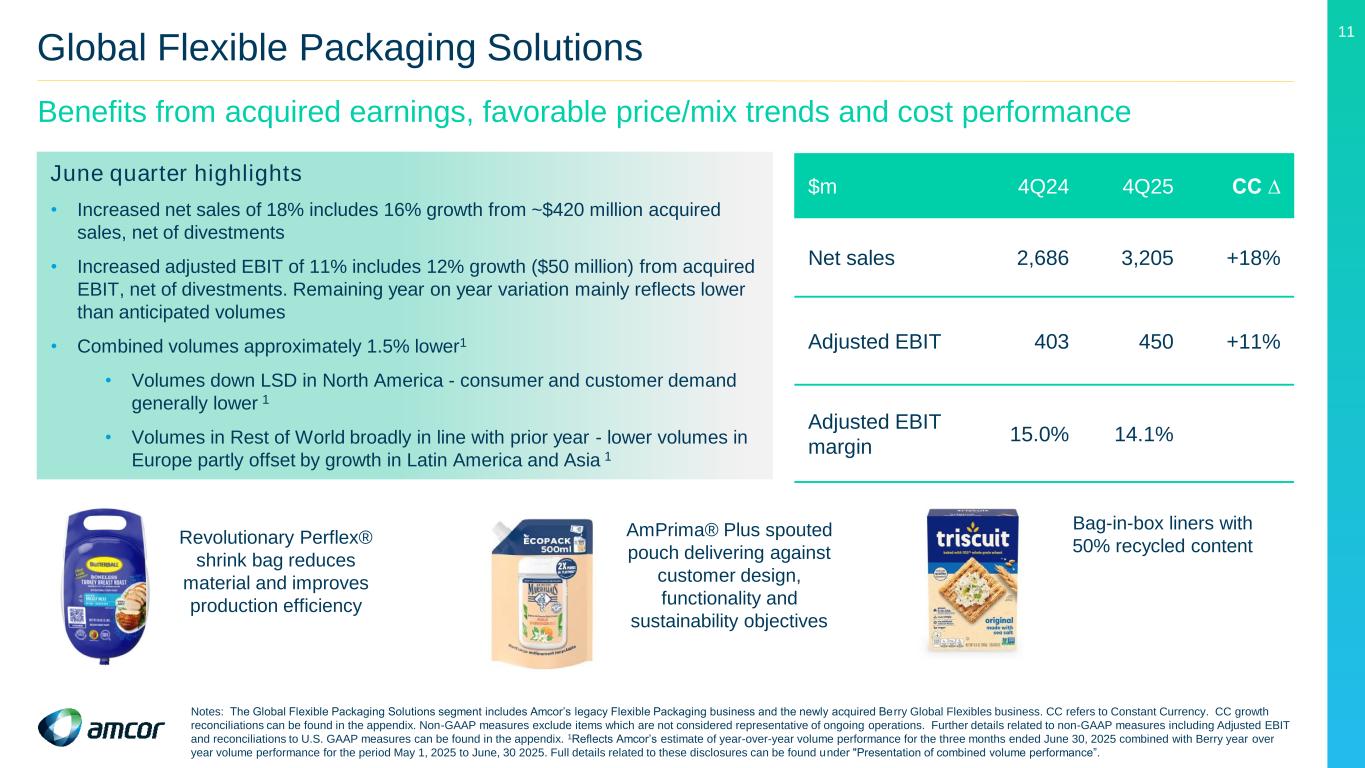 (2) 2025年4月30日にAmcorとBerry Globalの経営統合が完了したため、本書中の2025年6月30日に終了した3ヶ月間の業績には、別段の記載がない限り、2025年4月のレガシーBerry Global事業の業績は含まれていません。2025年6月30日に終了した12ヶ月間の業績には、2024年7月から2025年4月までのレガシー・ベリー・グローバル事業の業績は含まれておりません。